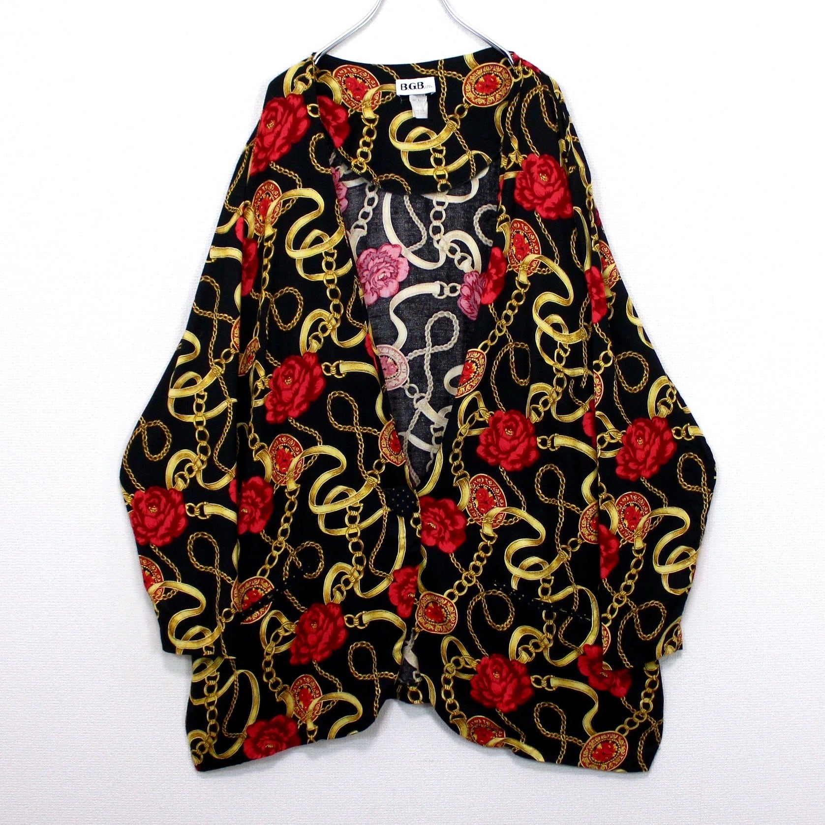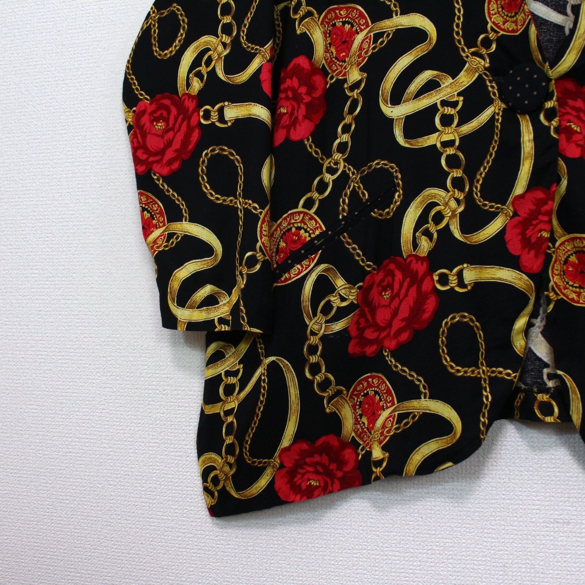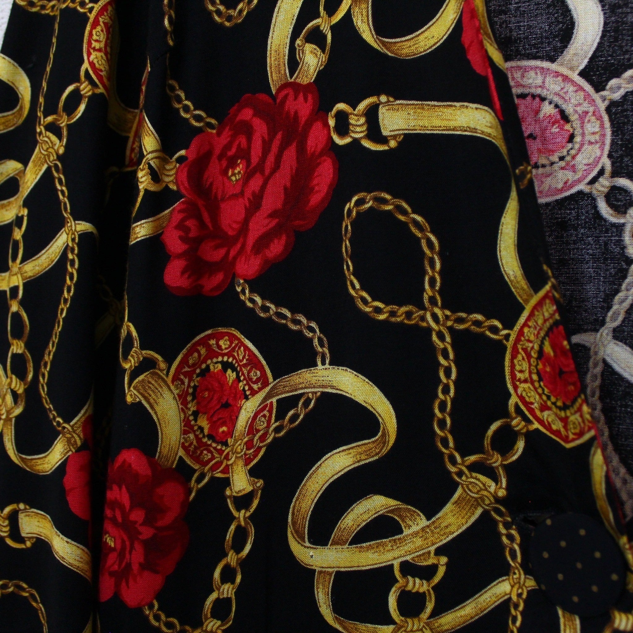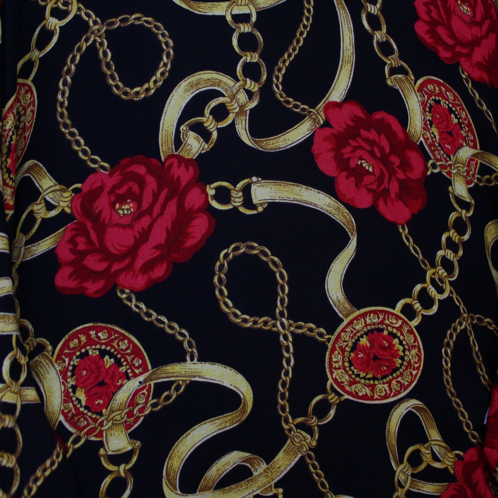 ブラックベースのボディに、真紅の花、ゴールドのチェーン柄を掛け合わせたスカーフ柄を載せた逸品。