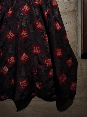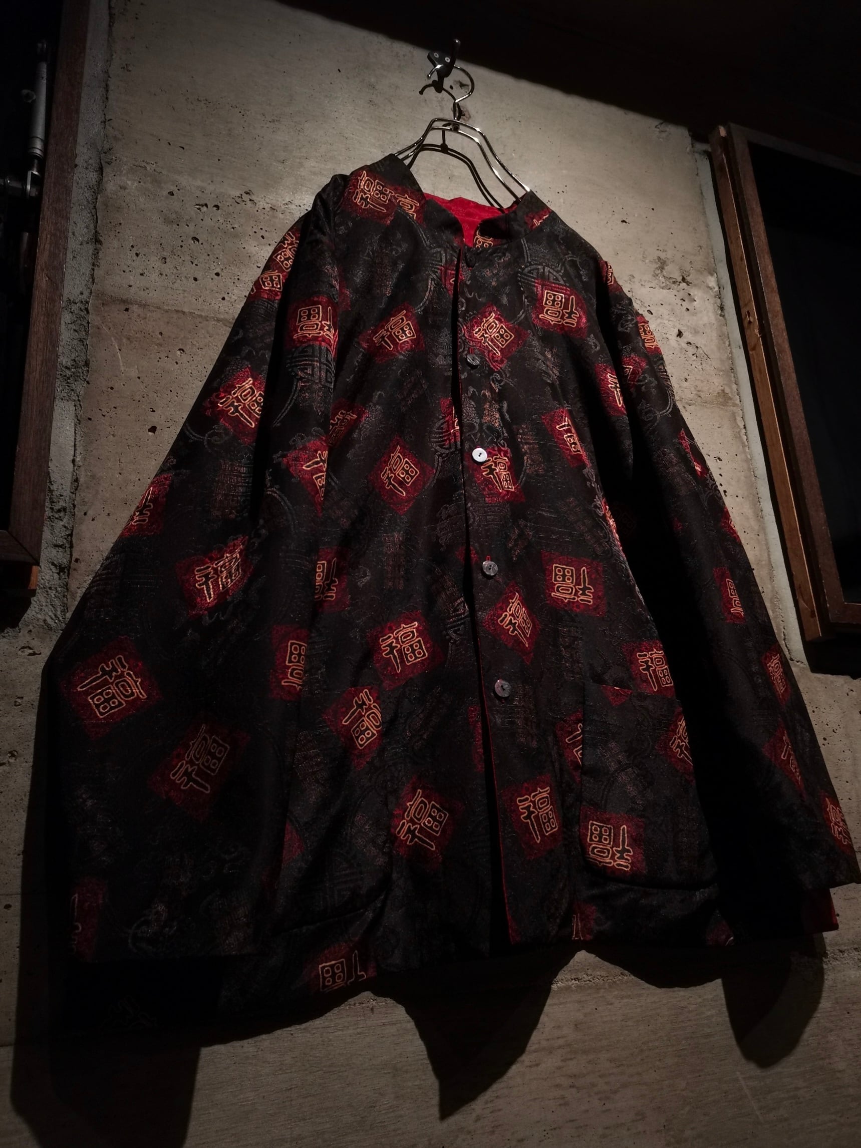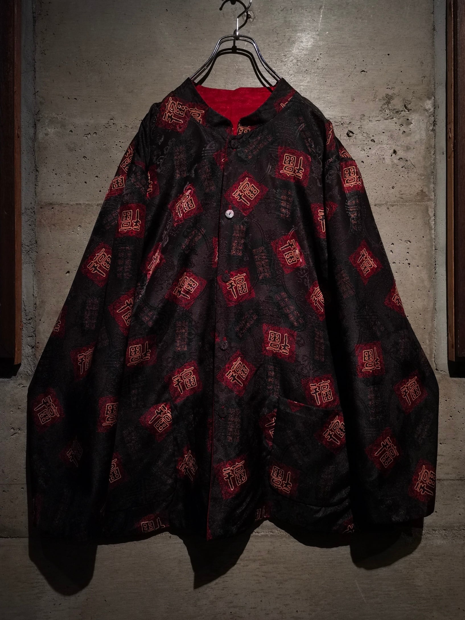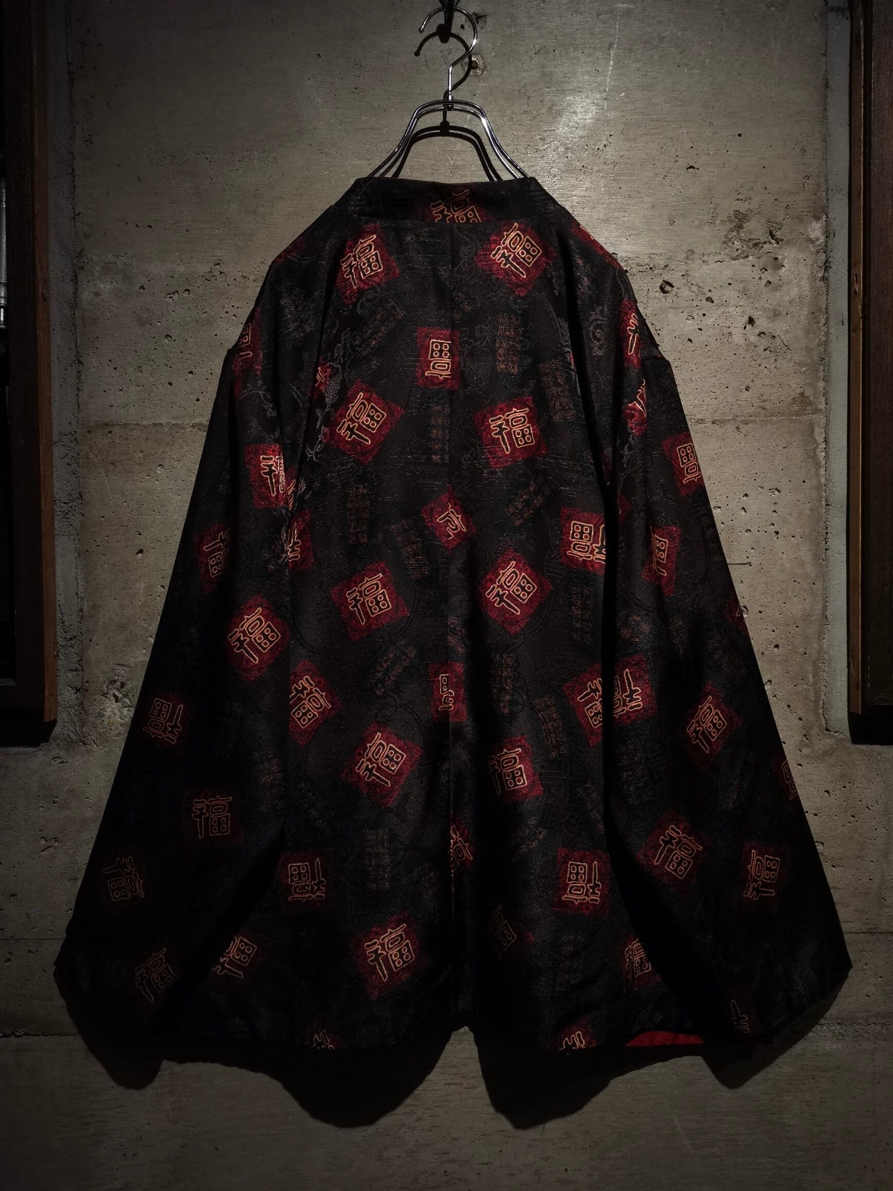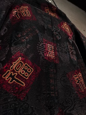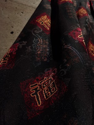 表面はブラックのボディに"福"の文字、ジャガードの織りで中華紋様、裏返すと真紅のボディに同じく織りで紋様を刻んだ1着。