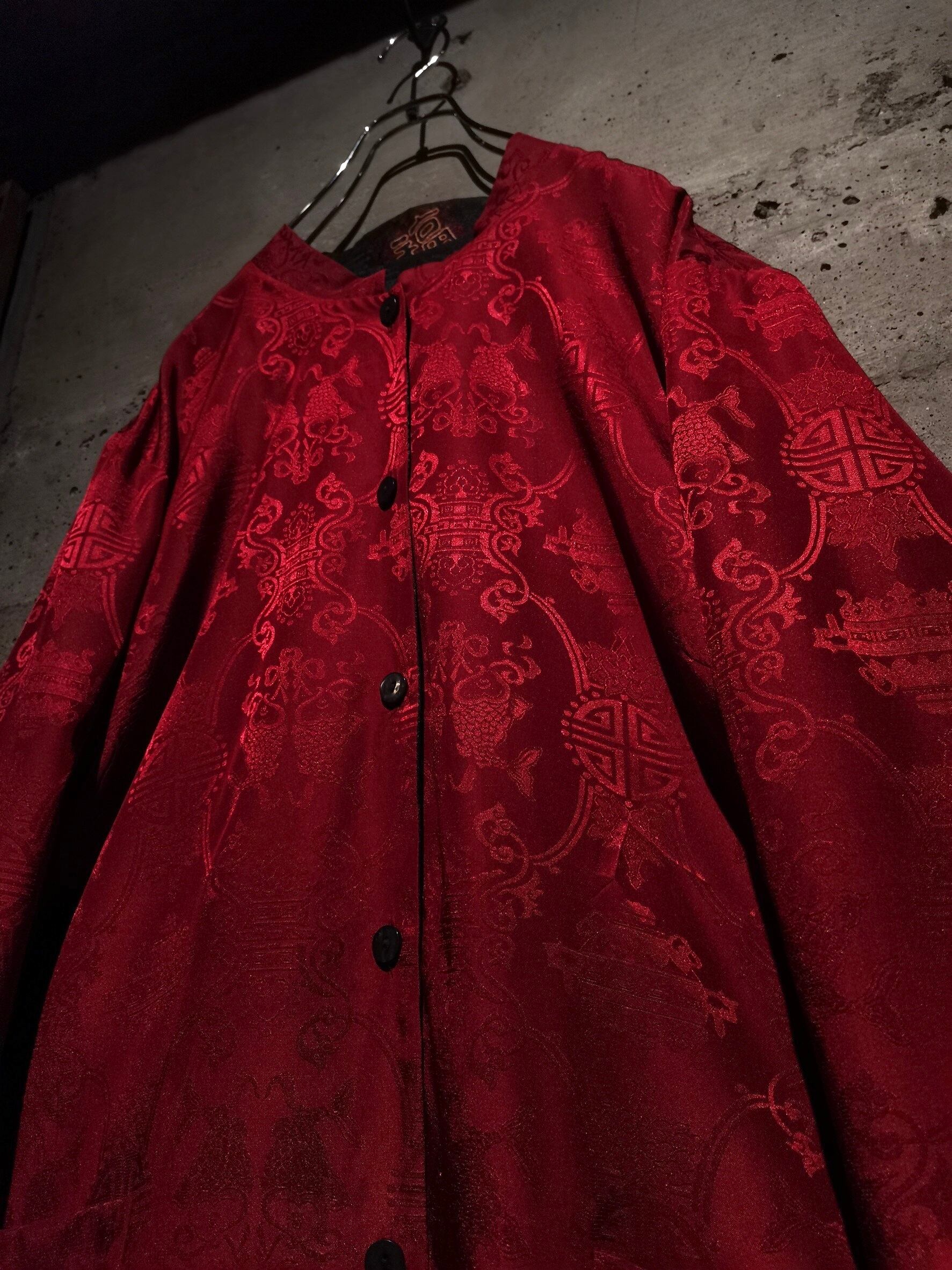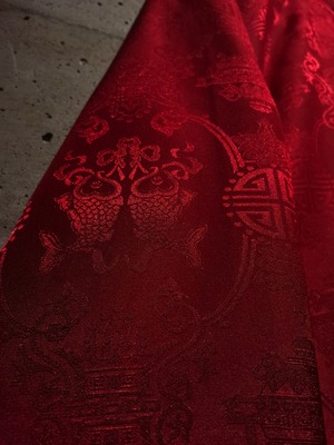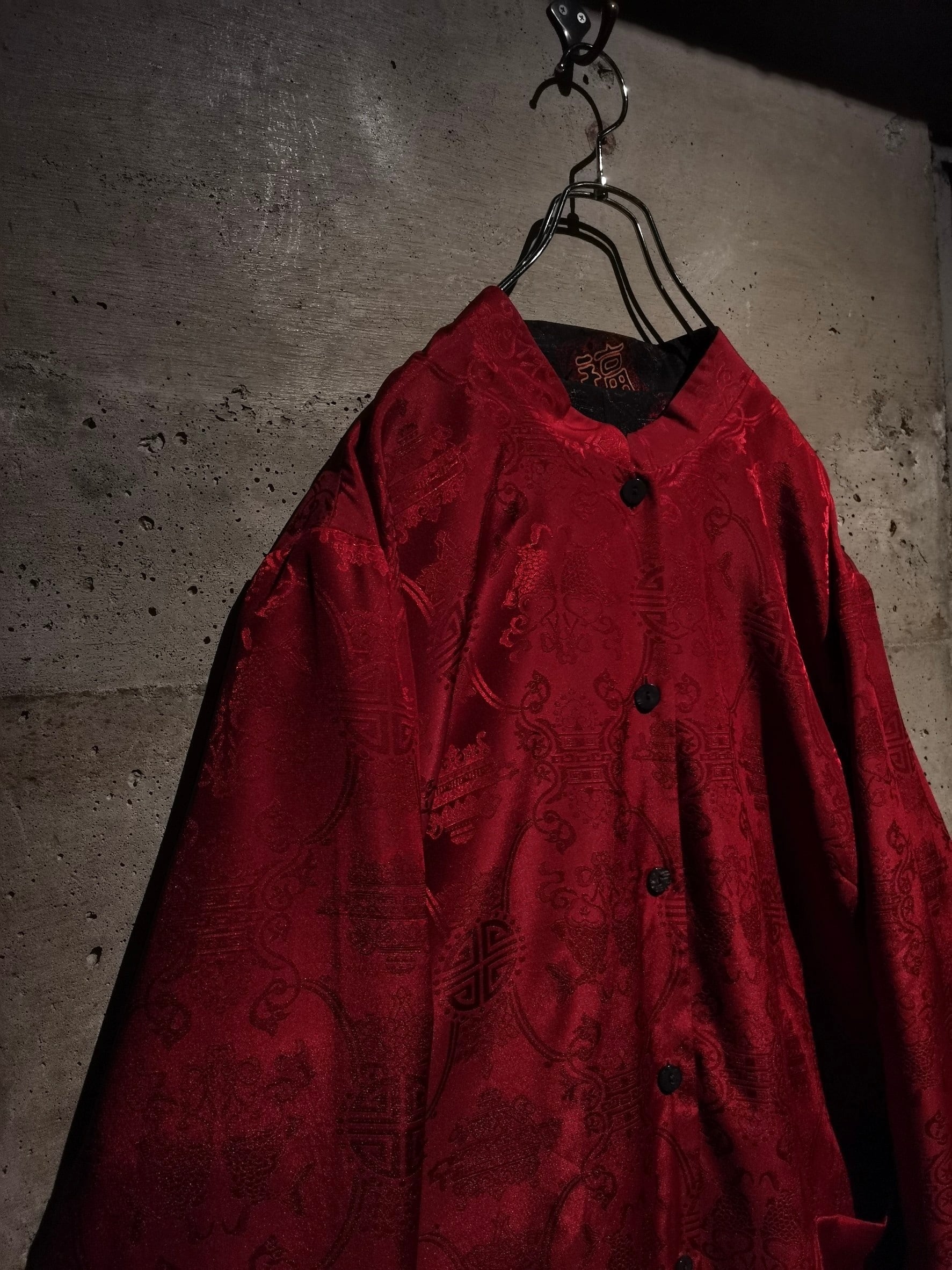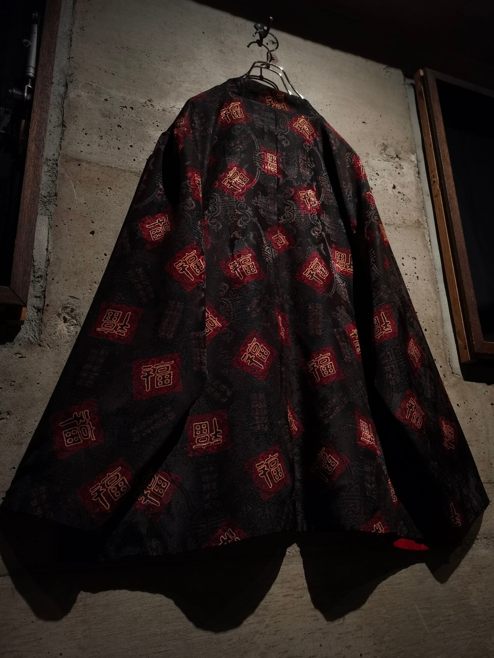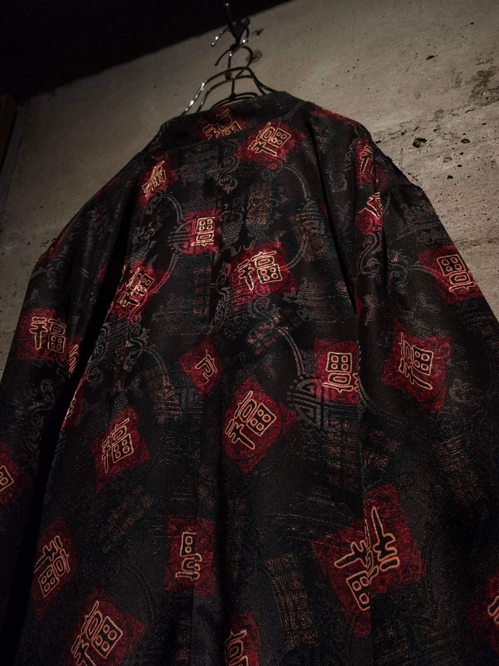 表面はブラックのボディに"福"の文字、ジャガードの織りで中華紋様、裏返すと真紅のボディに同じく織りで紋様を刻んだ1着。