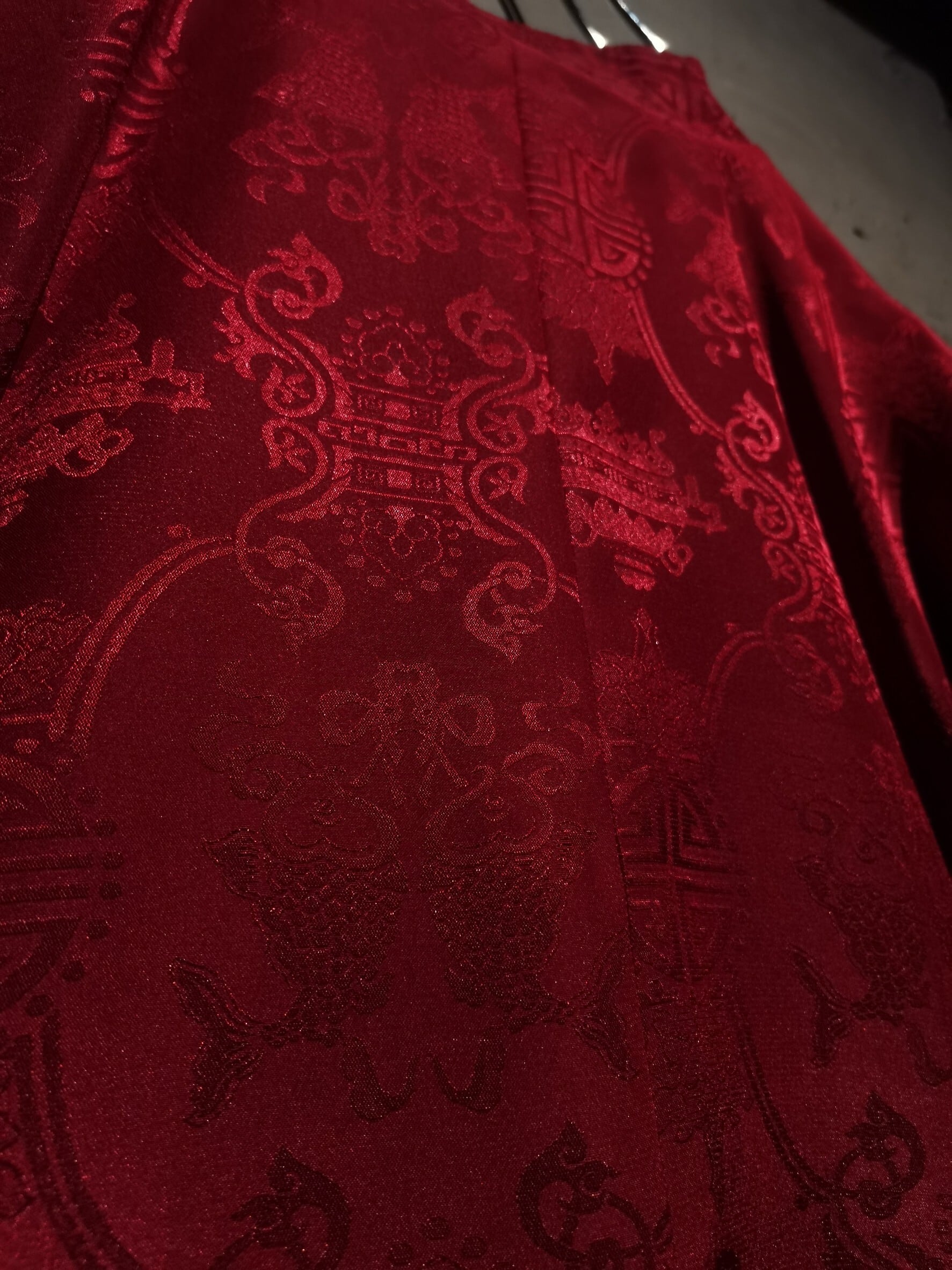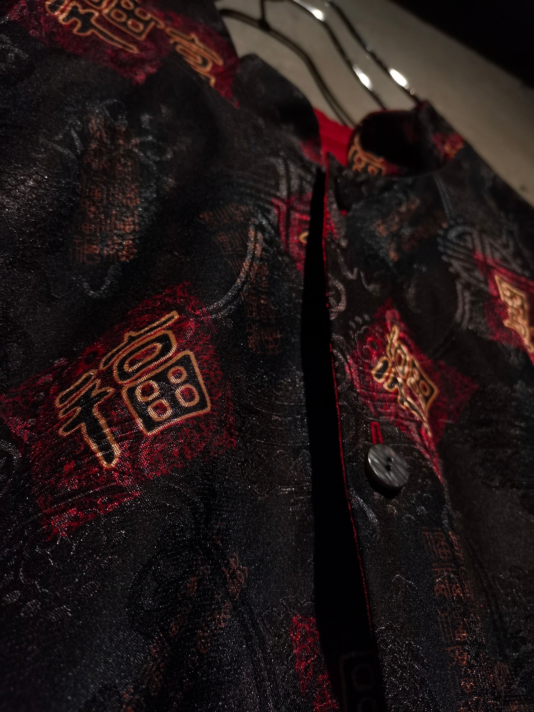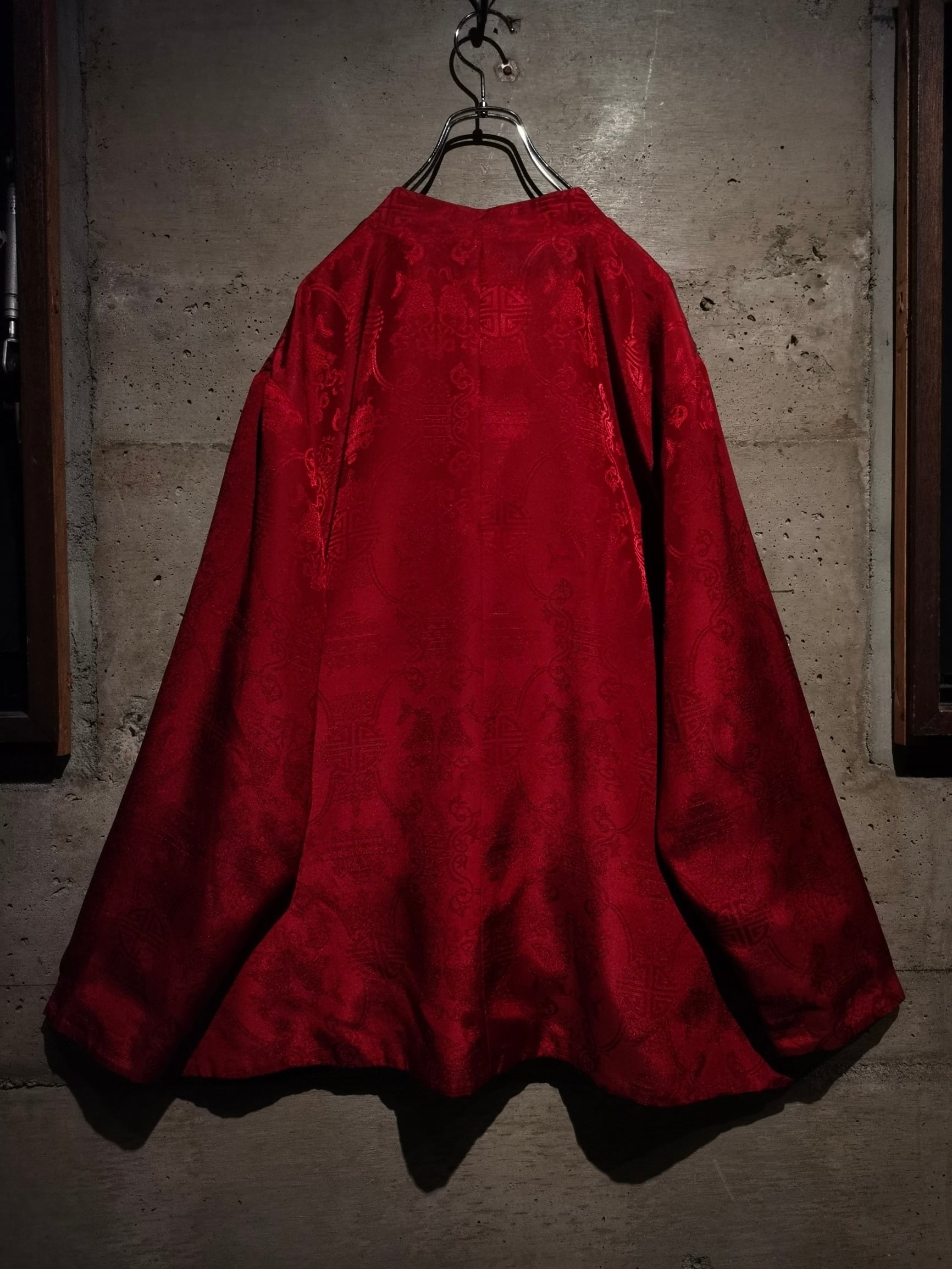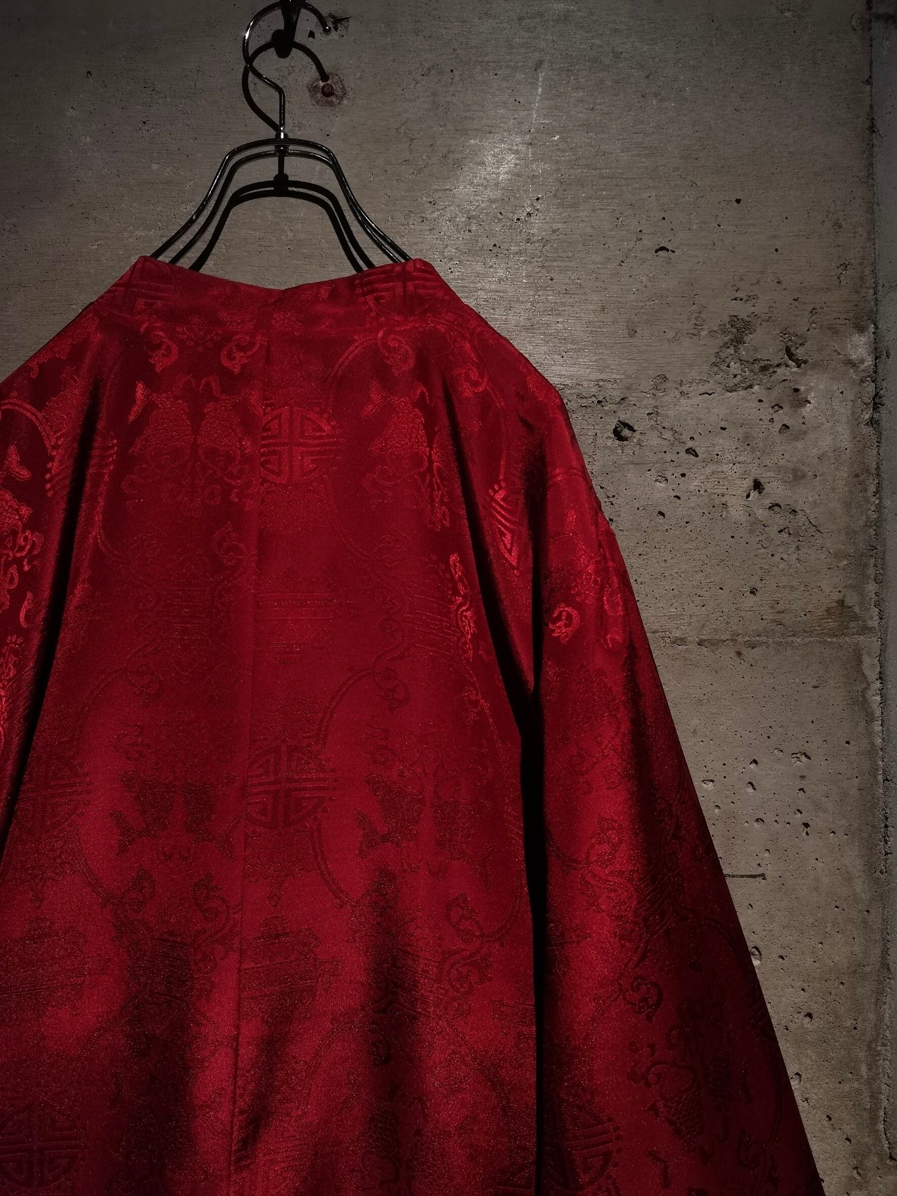 表面はブラックのボディに"福"の文字、ジャガードの織りで中華紋様、裏返すと真紅のボディに同じく織りで紋様を刻んだ1着。