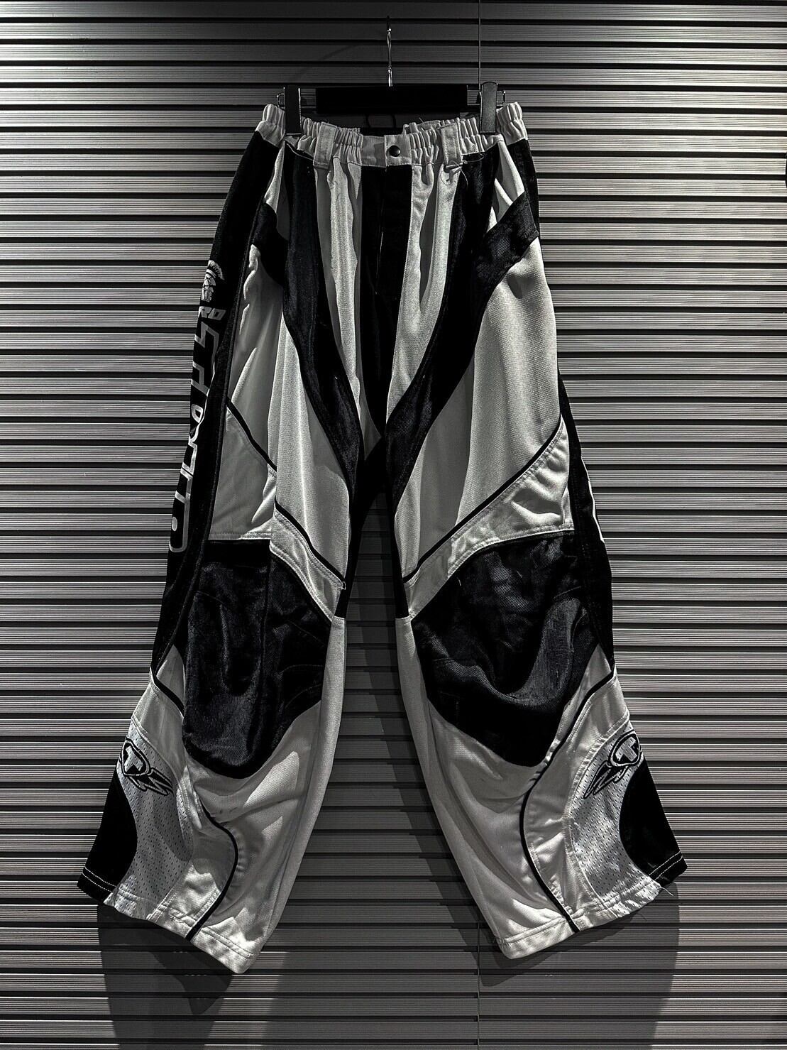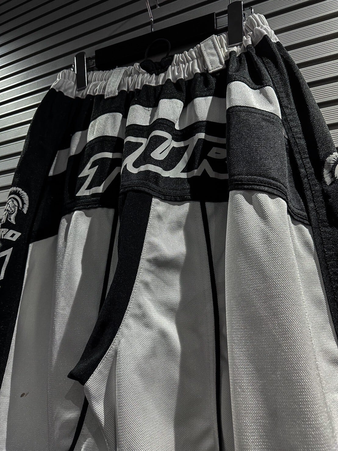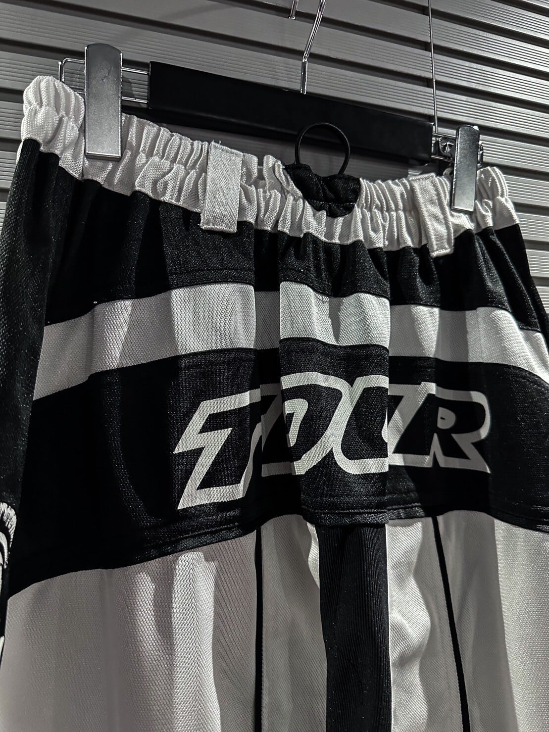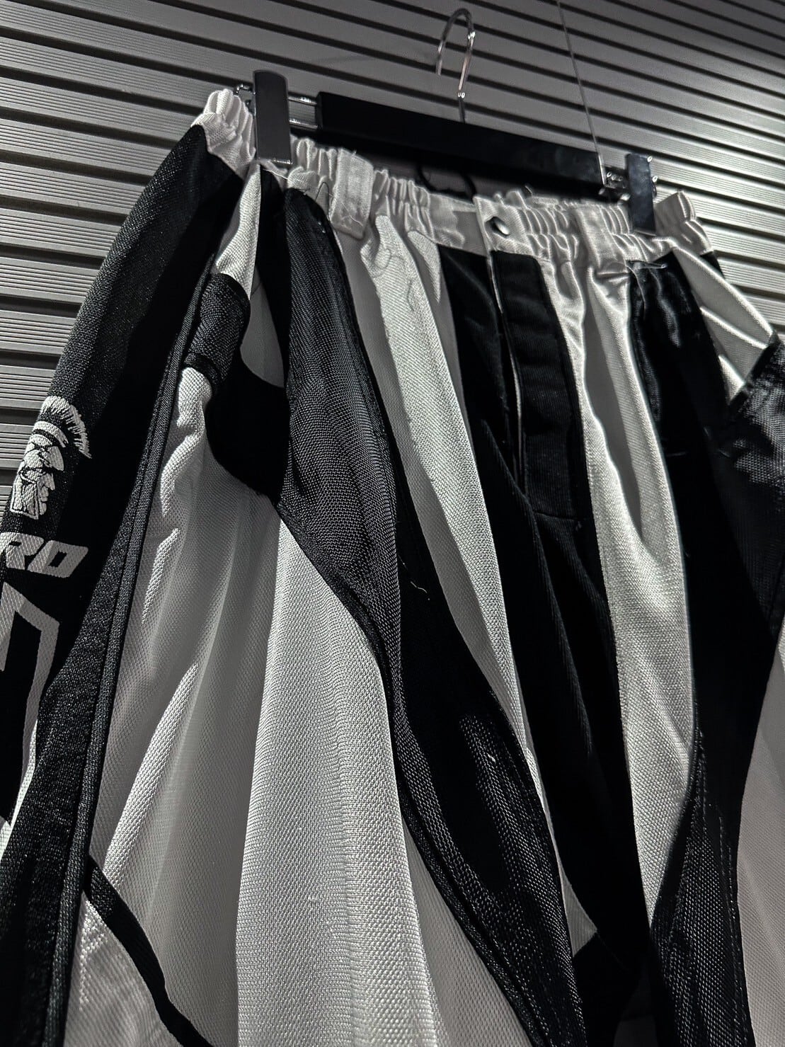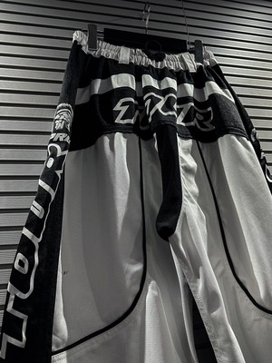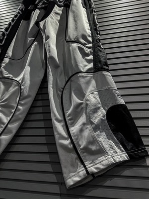 ハリのあるポリエステルを用いて、この手のアイテムでは稀有な黒×白のモノトーンのカラーリングで仕上げられたレーシングパンツ。