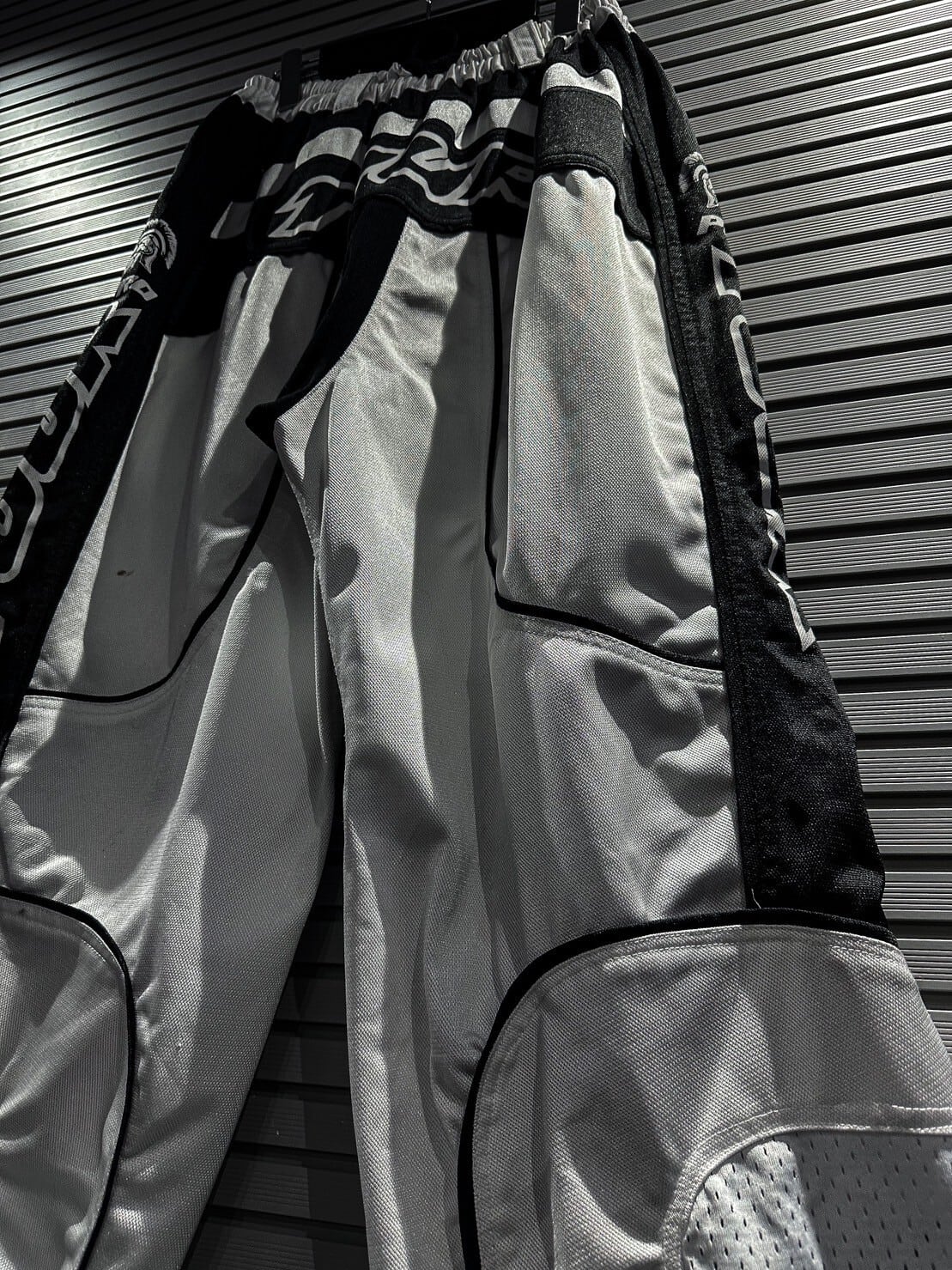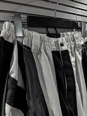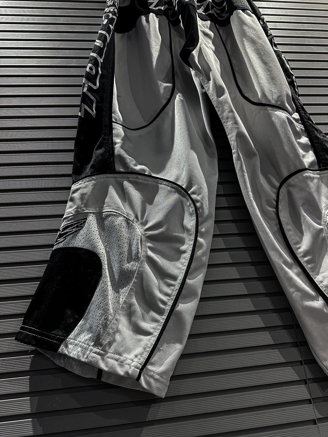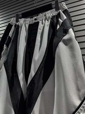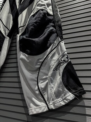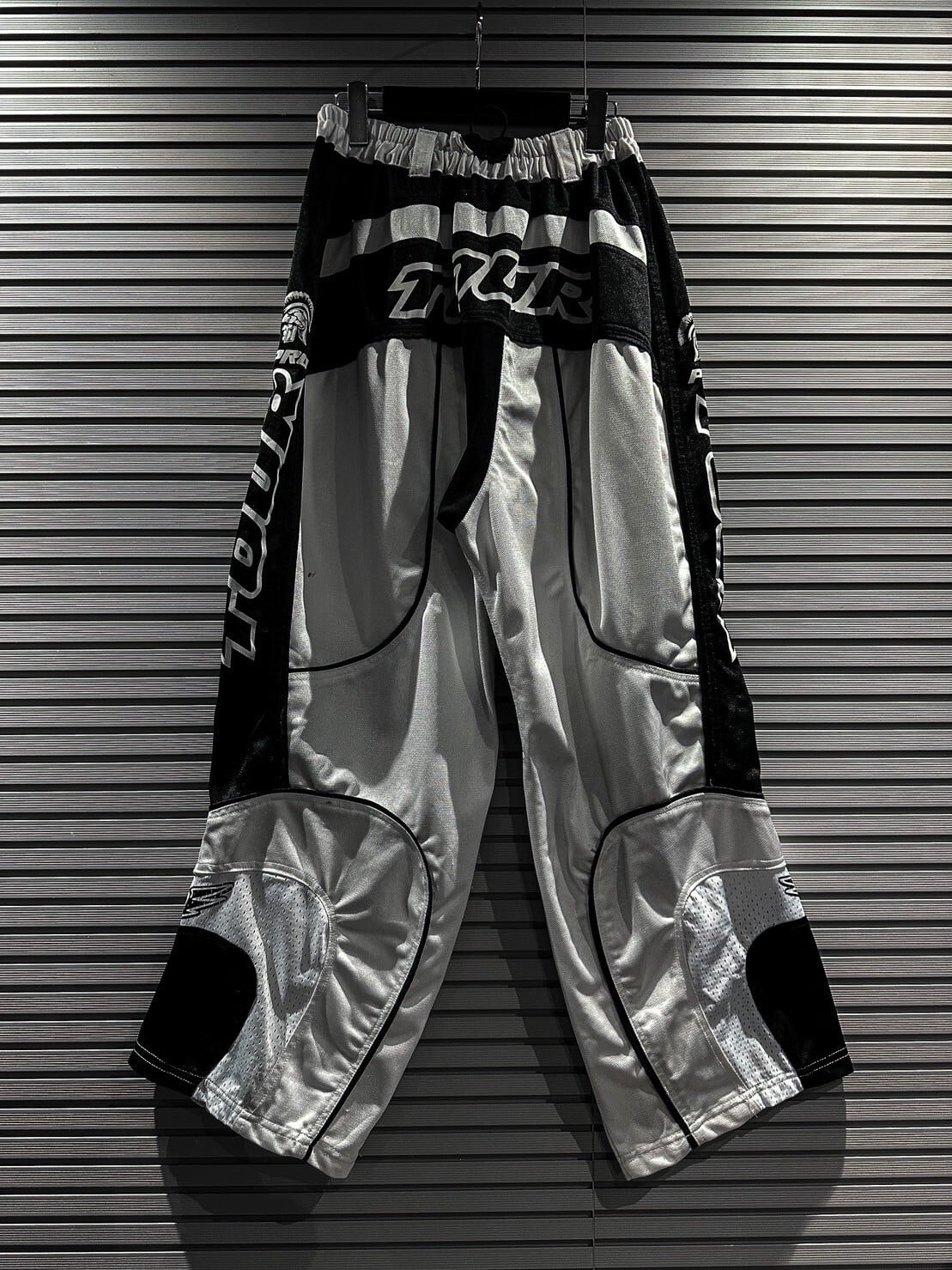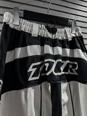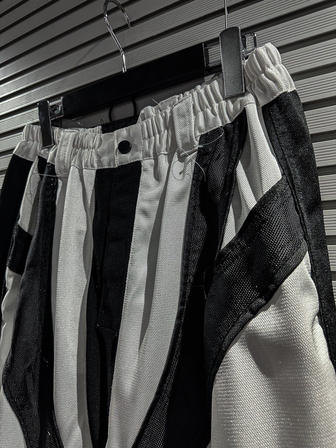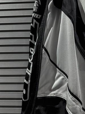 ハリのあるポリエステルを用いて、この手のアイテムでは稀有な黒×白のモノトーンのカラーリングで仕上げられたレーシングパンツ。
