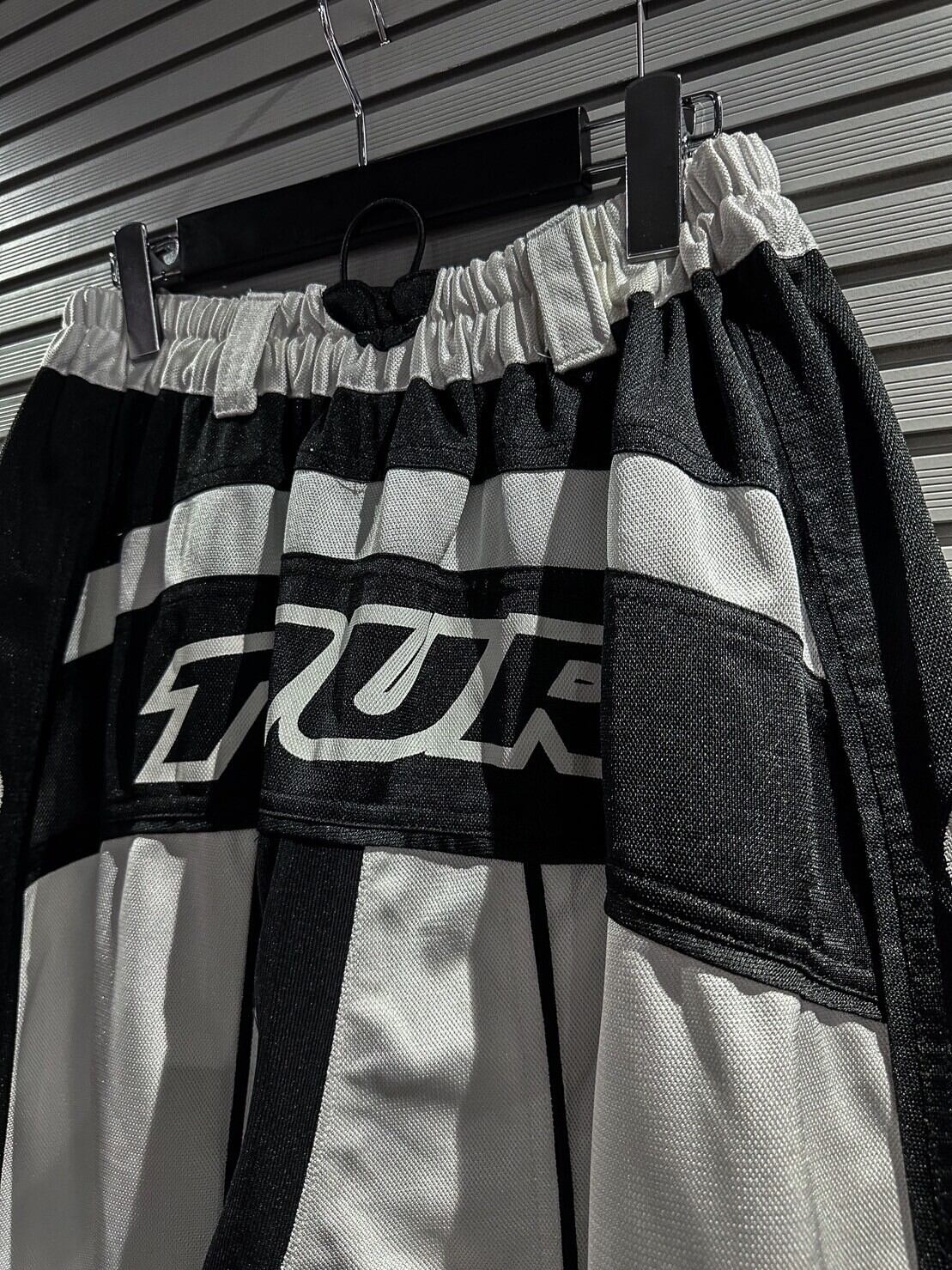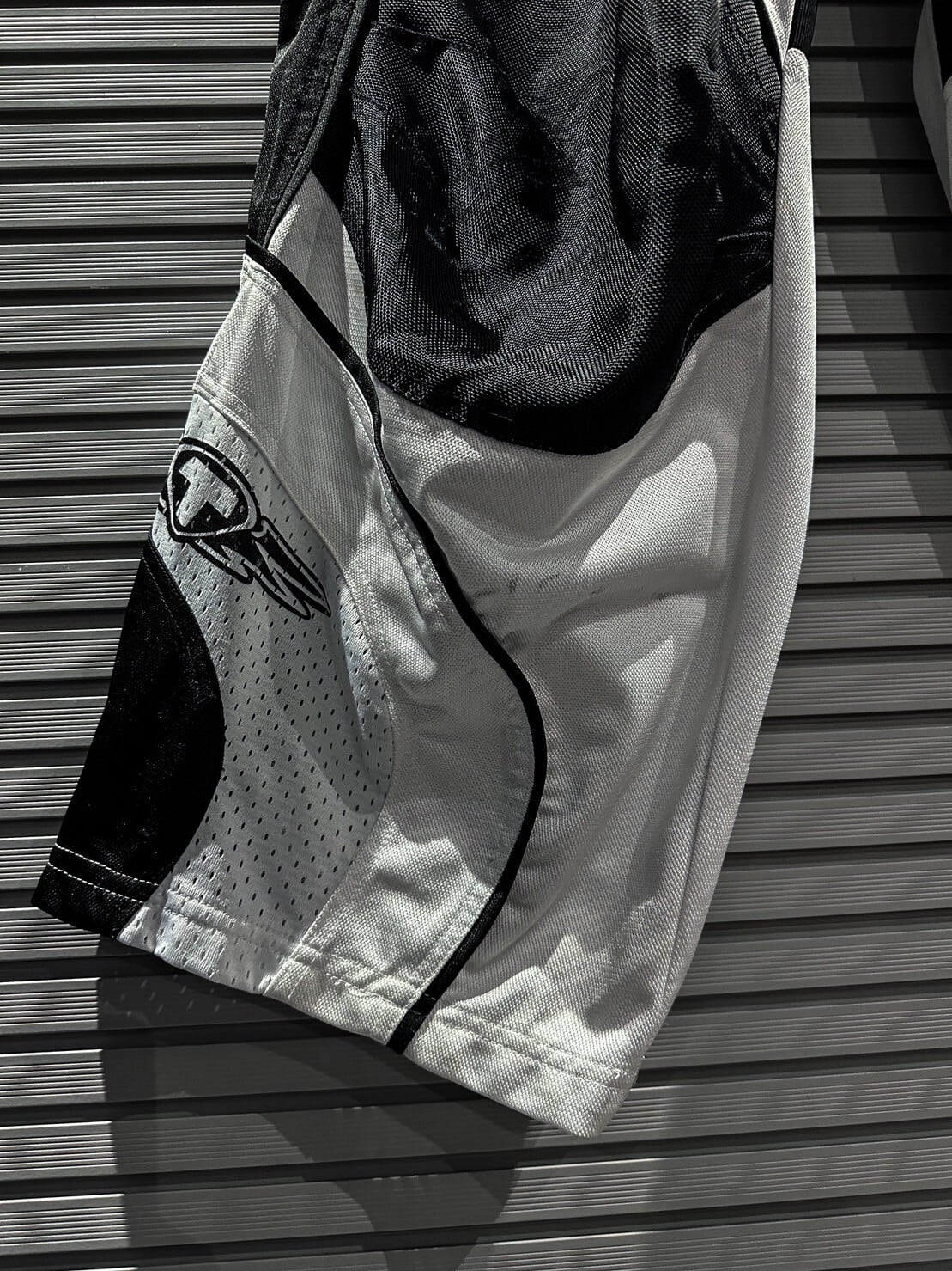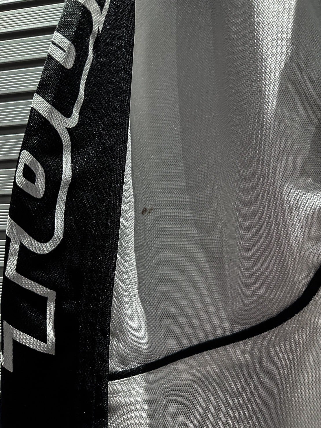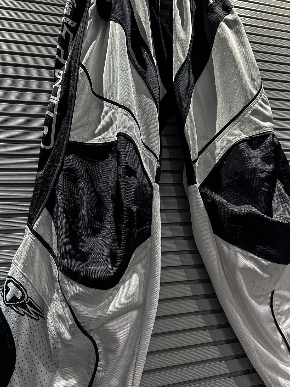 ハリのあるポリエステルを用いて、この手のアイテムでは稀有な黒×白のモノトーンのカラーリングで仕上げられたレーシングパンツ。