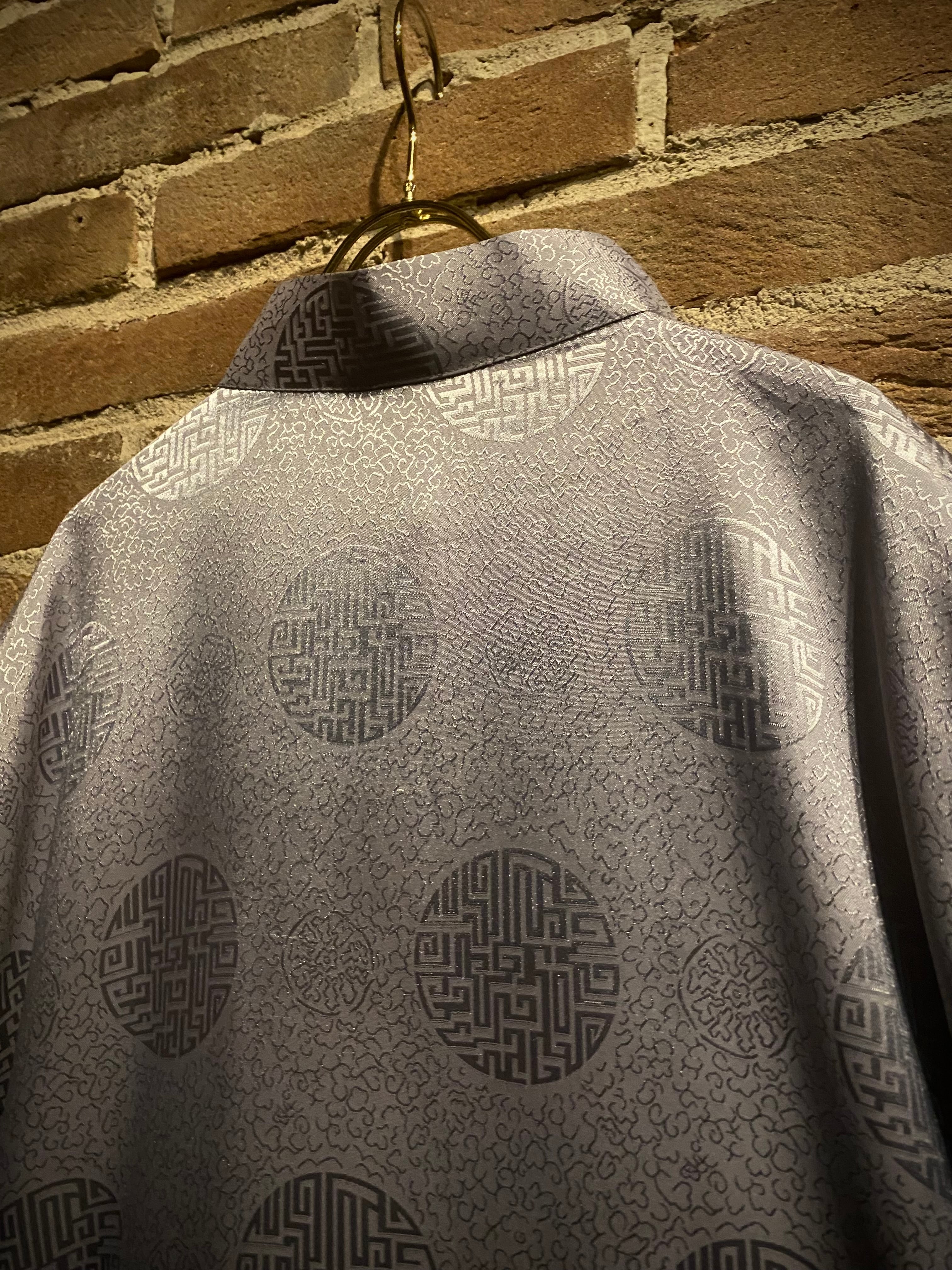 鈍い光沢を放つシルバーカラーのボディに、繊細な織りによって中華の伝統的な紋様を全体に映し出した半袖チャイナシャツ。