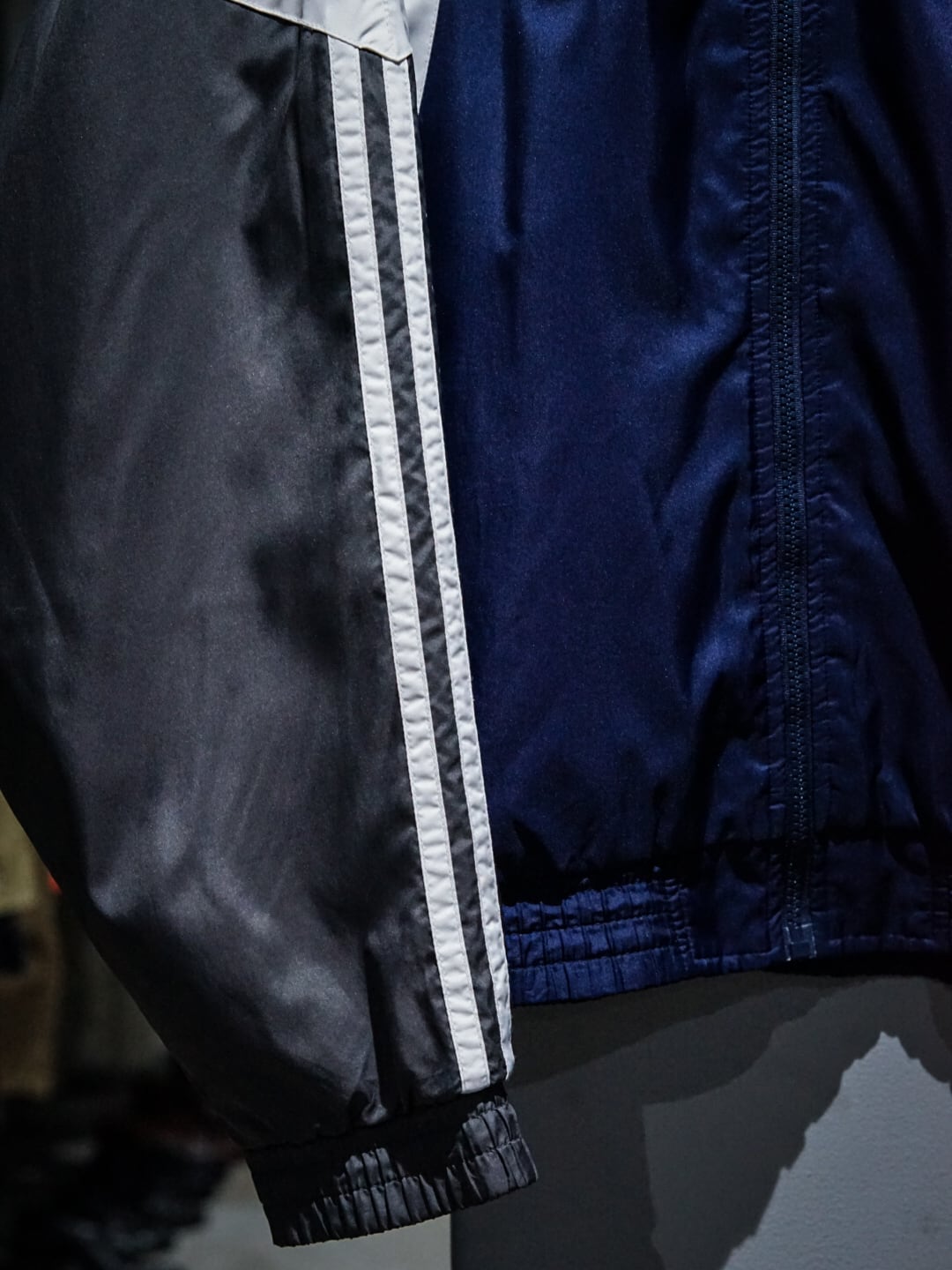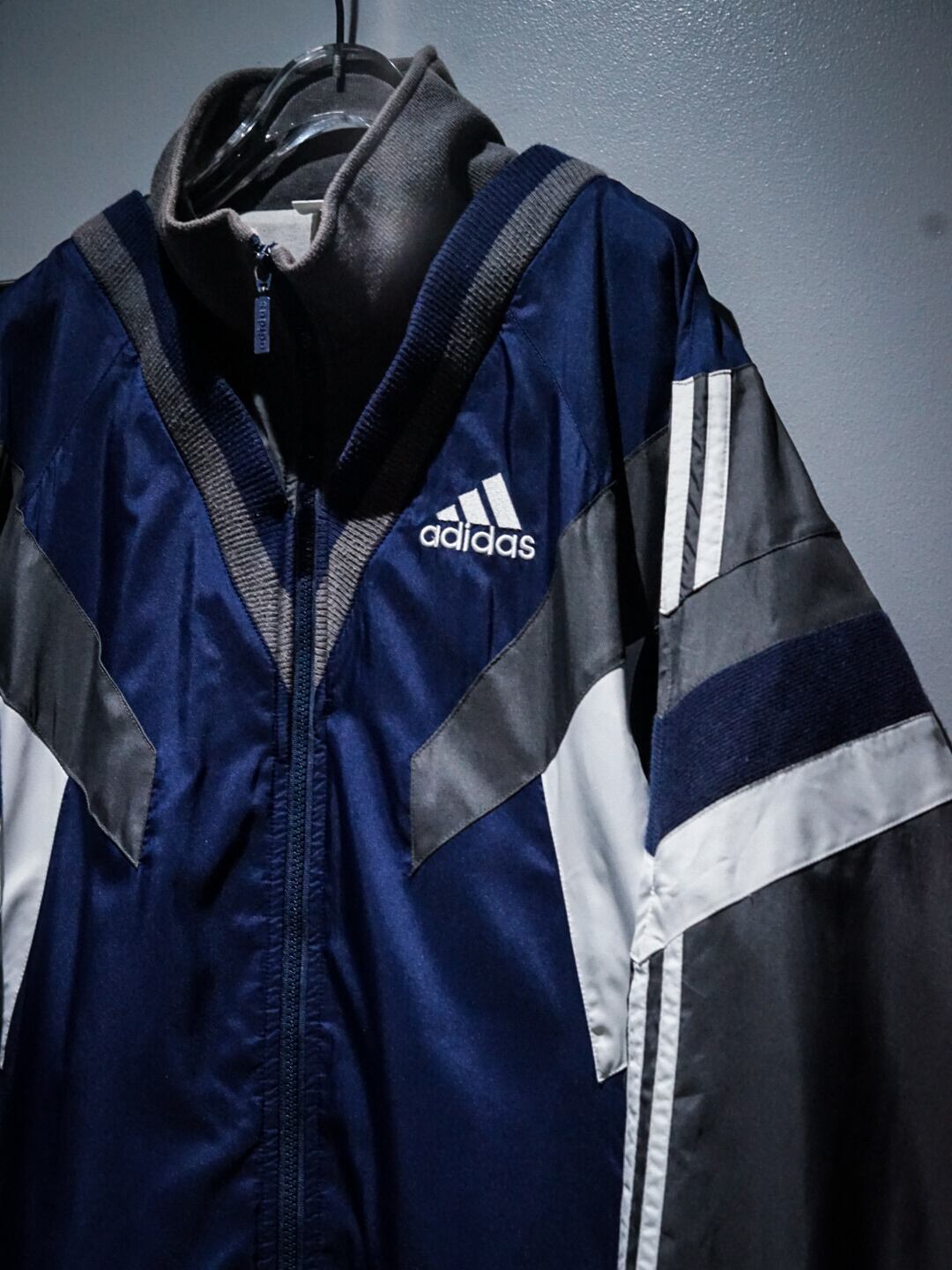 タフなナイロンとコットンを用いて、ネイビーのボディをベースにグレー×ホワイトでエッジの効いた切り替えを施した90's “adidas”のトラックジャケット。