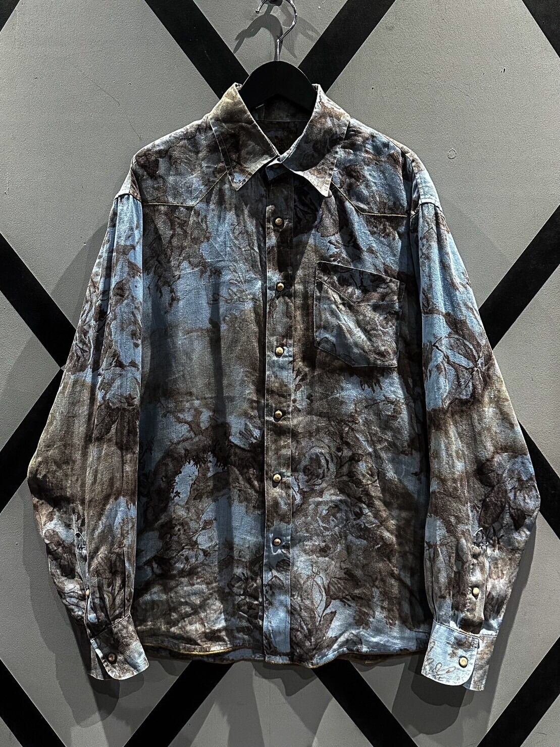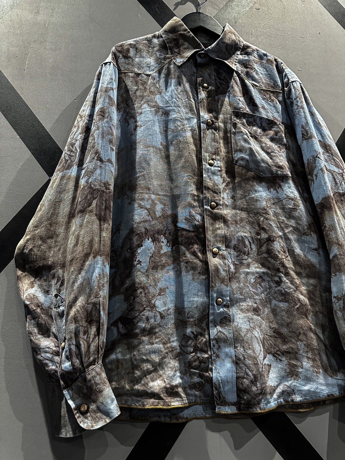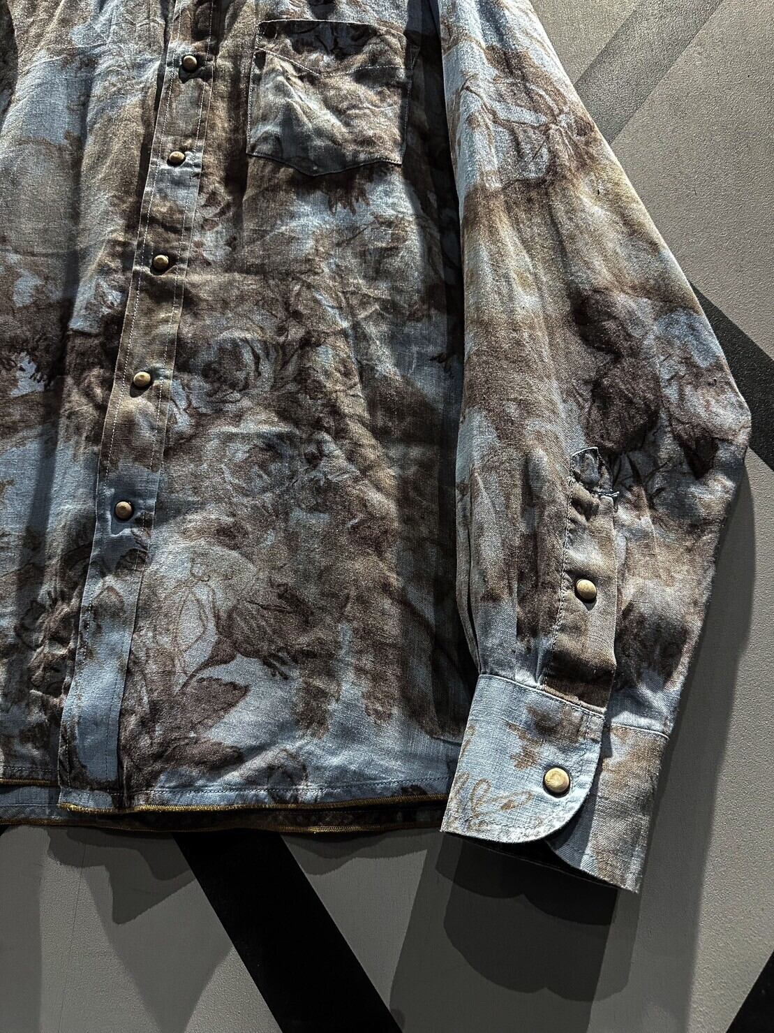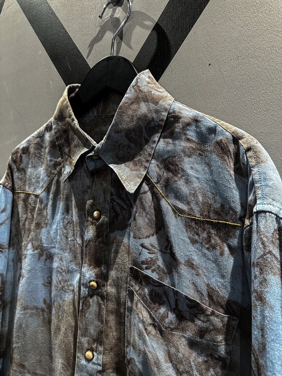 ハリ、柔らかさを兼ね備えた上質なライトブルーのリネンのボディに、染めによって抽象的なマーブル柄を載せたウエスタンシャツ。