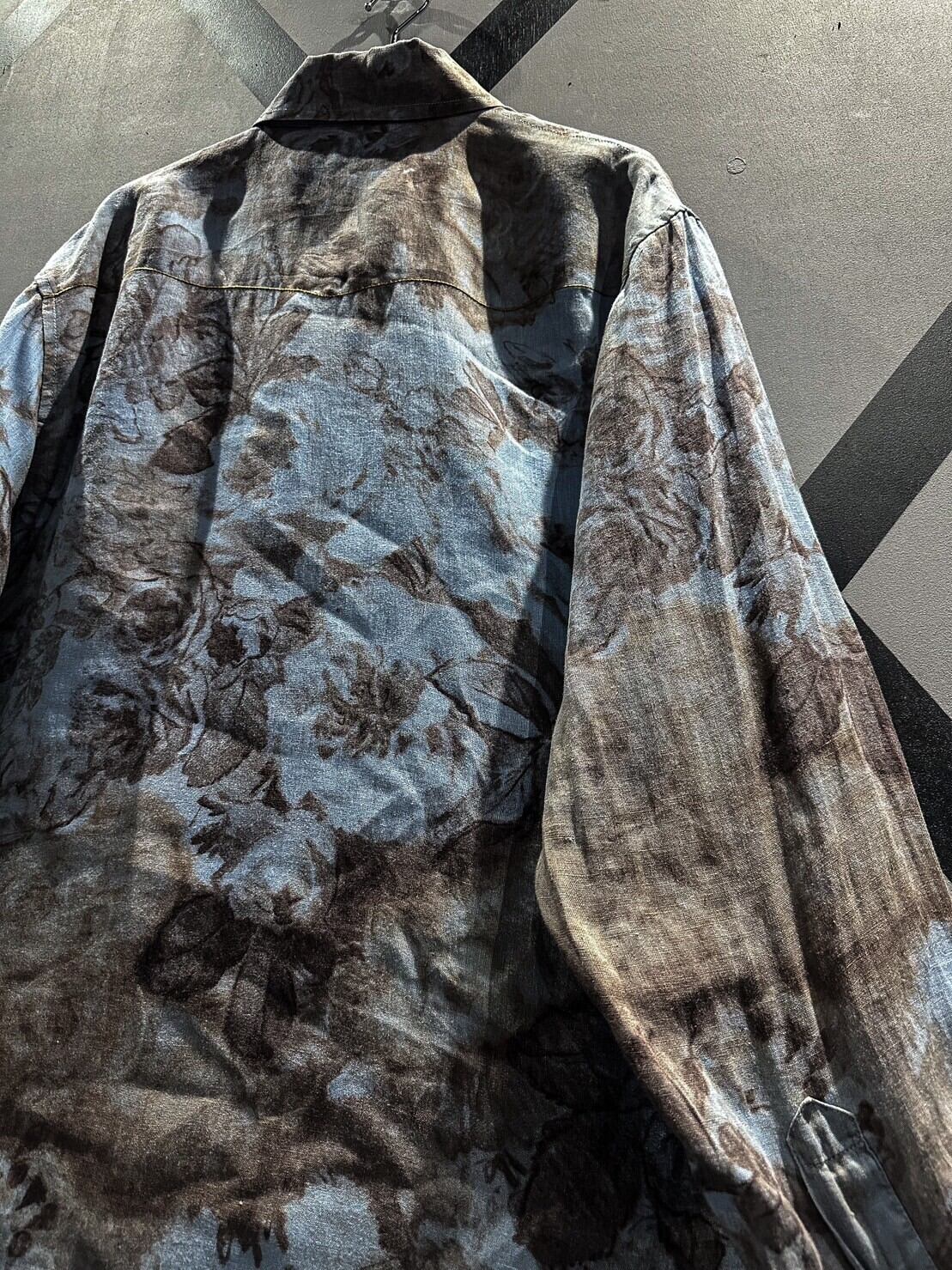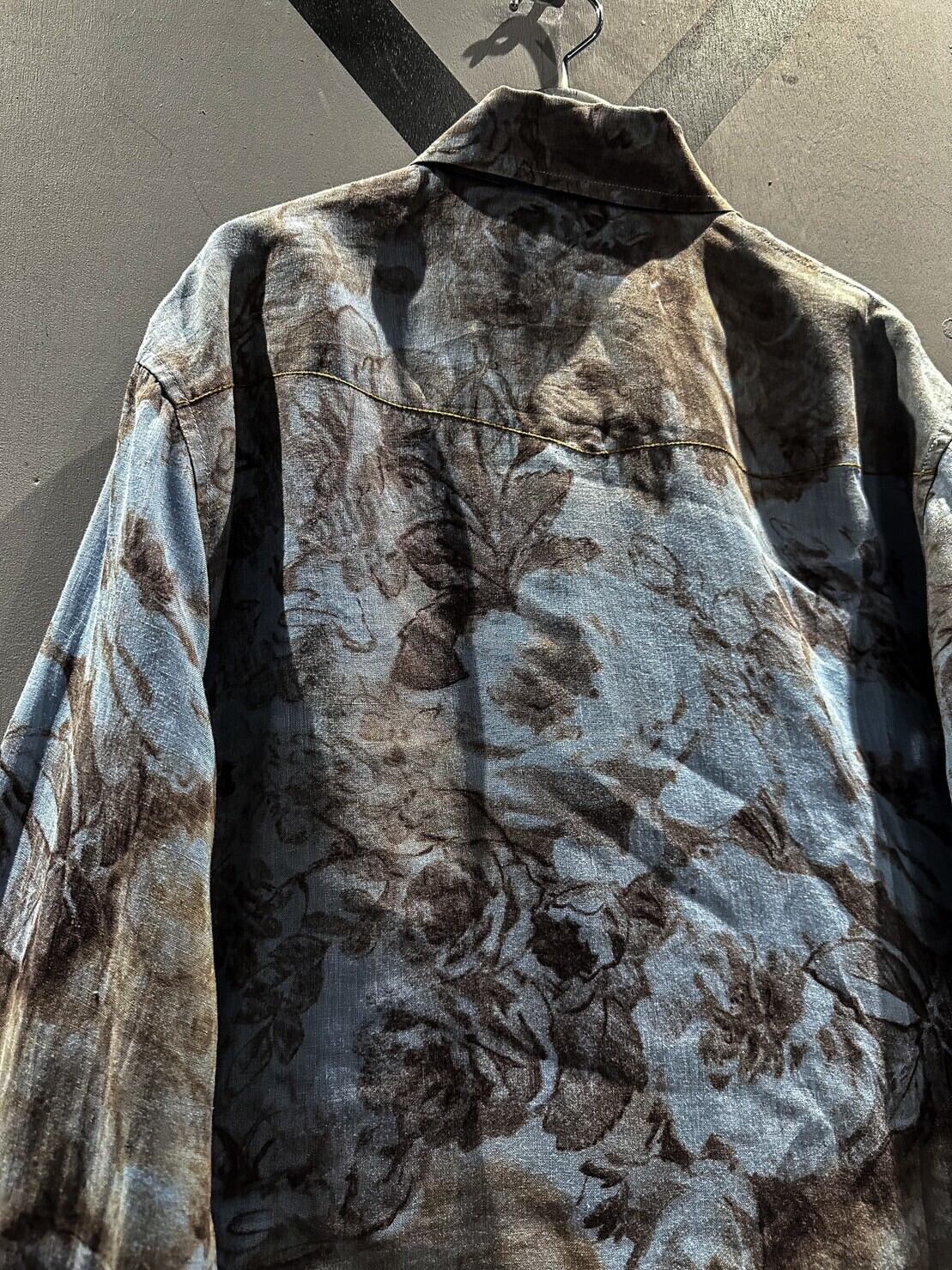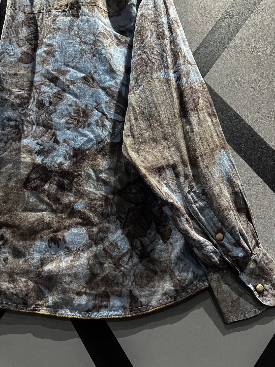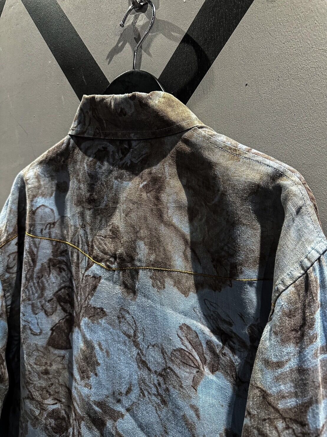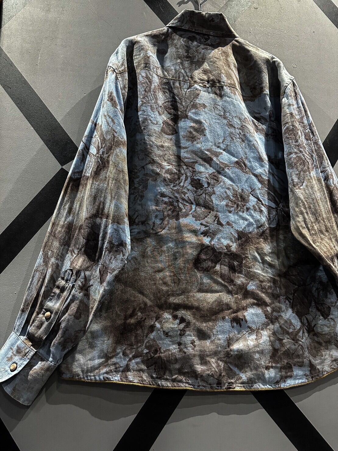 ハリ、柔らかさを兼ね備えた上質なライトブルーのリネンのボディに、染めによって抽象的なマーブル柄を載せたウエスタンシャツ。