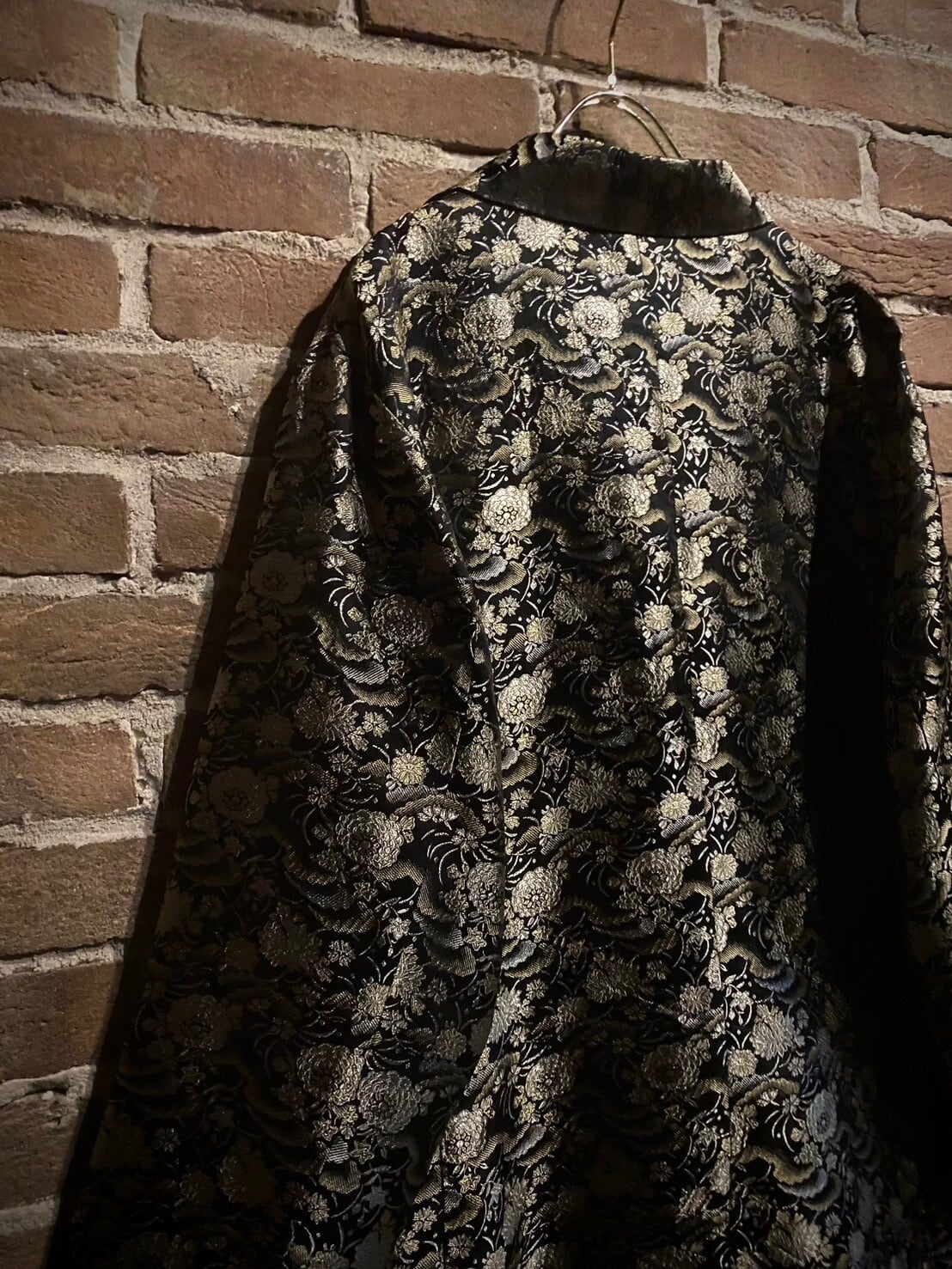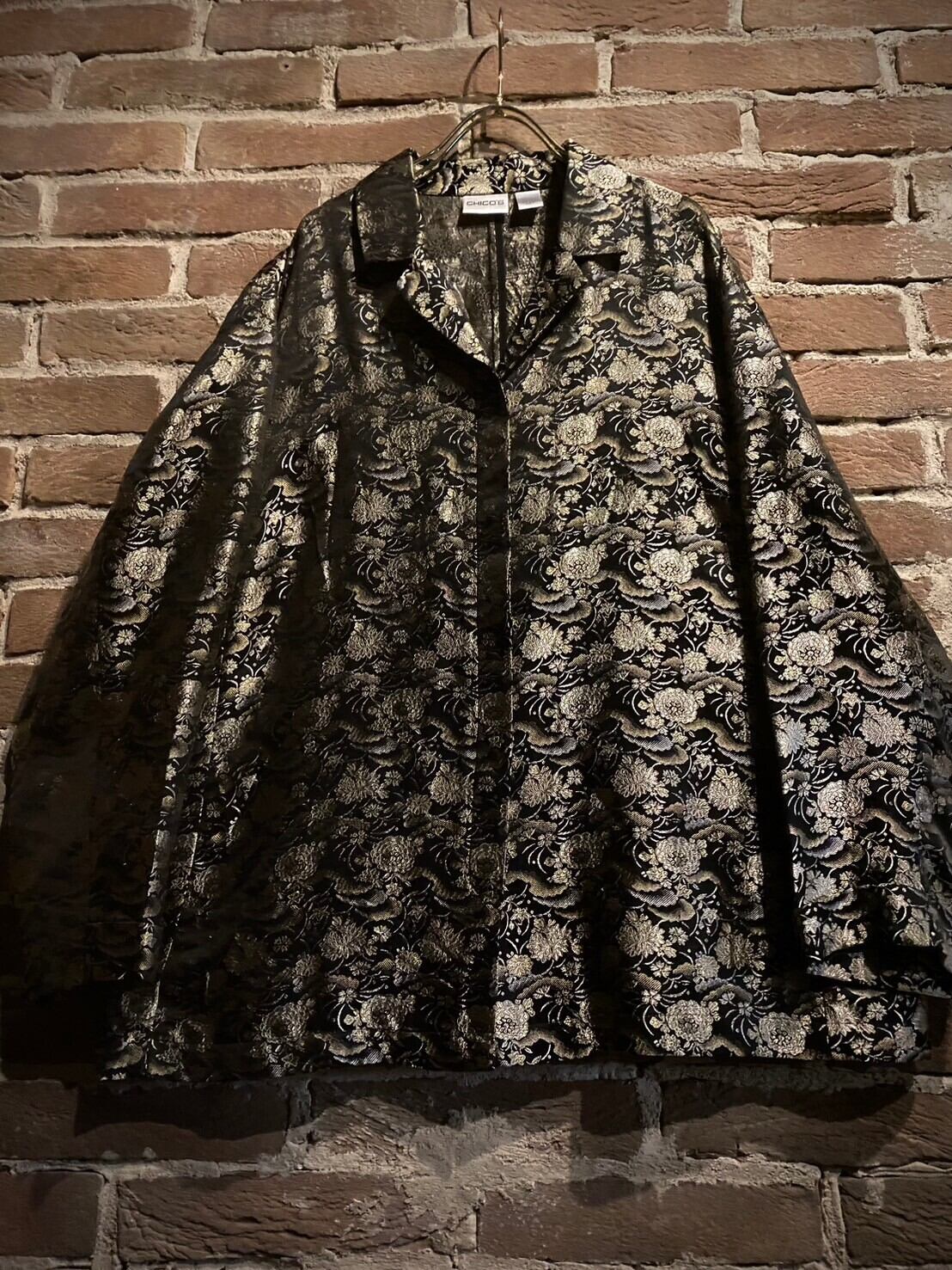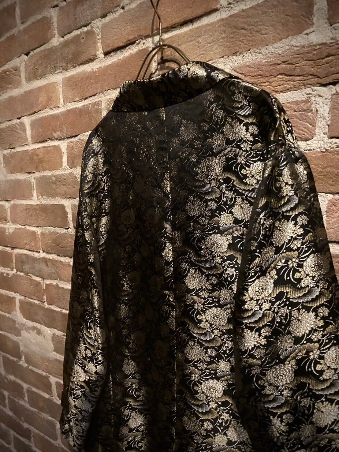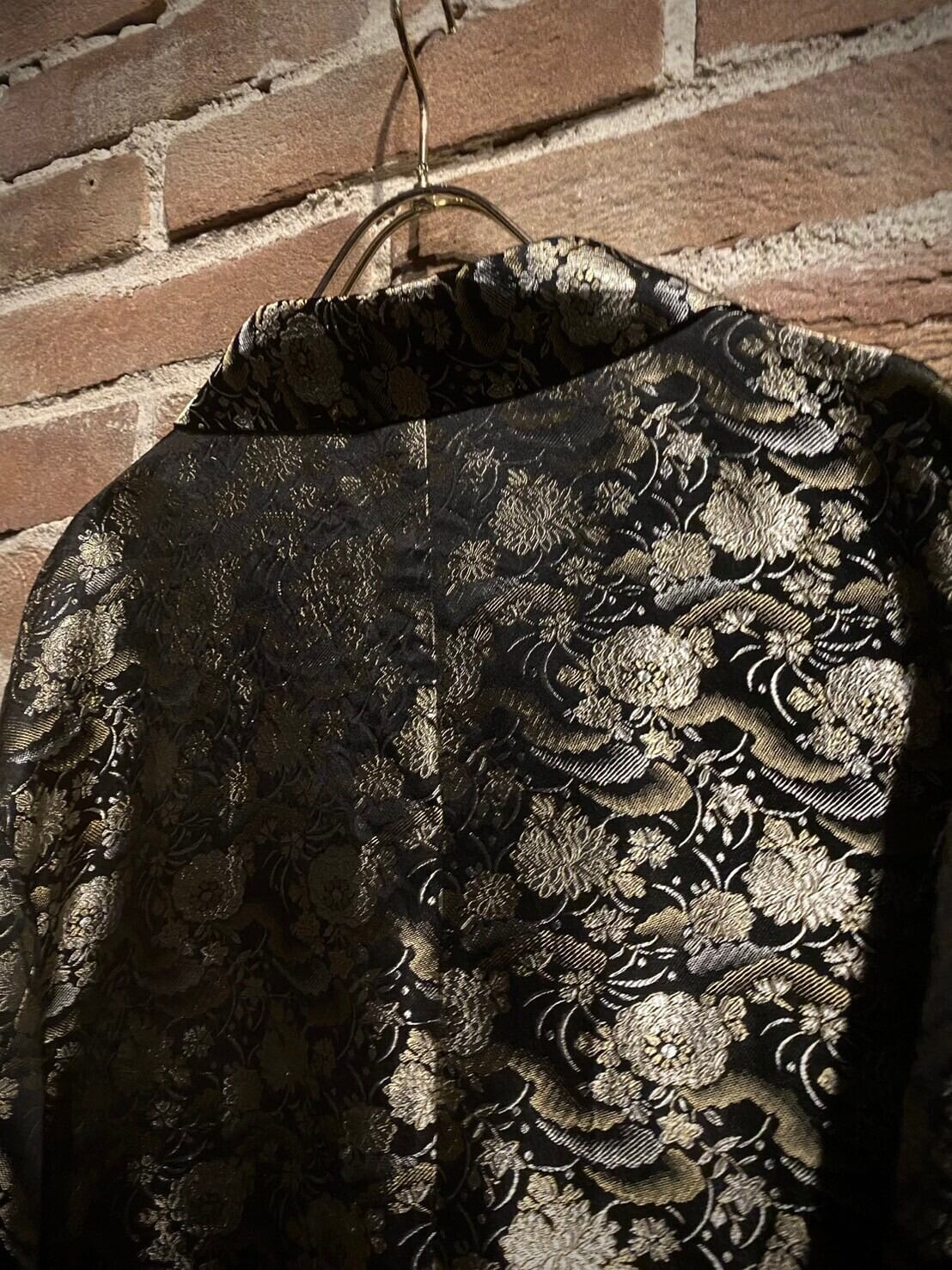 艶やかなブラックのボディをベースに、光沢を放つ金糸と銀糸の織りで花を表現した非常〜に美しいジャケット。