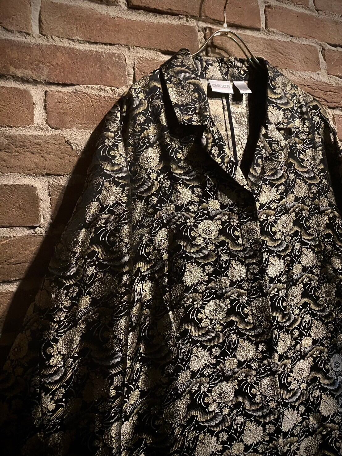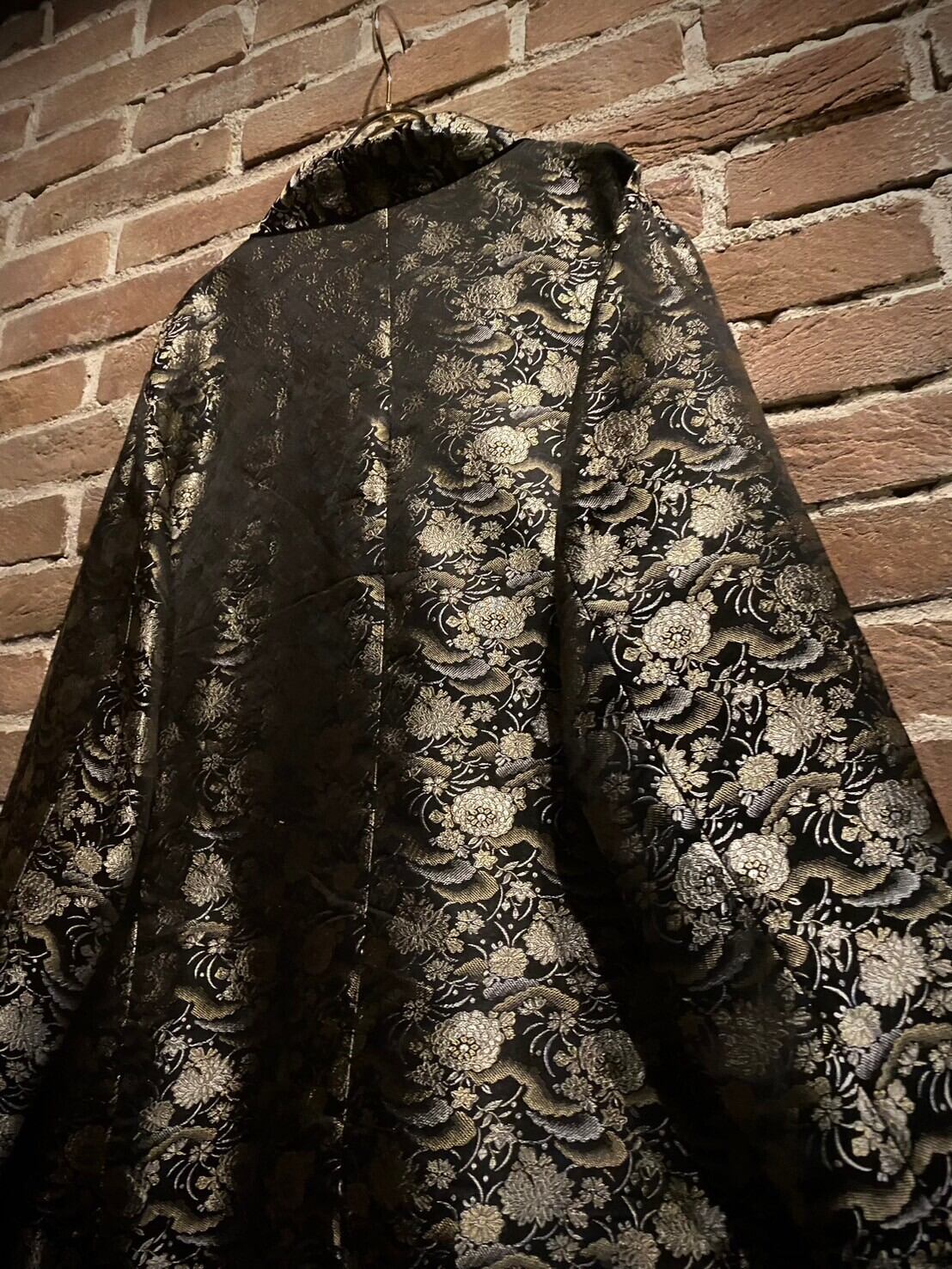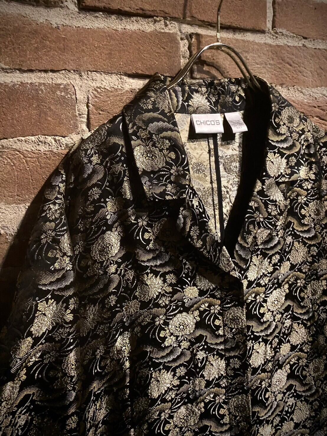 艶やかなブラックのボディをベースに、光沢を放つ金糸と銀糸の織りで花を表現した非常〜に美しいジャケット。
