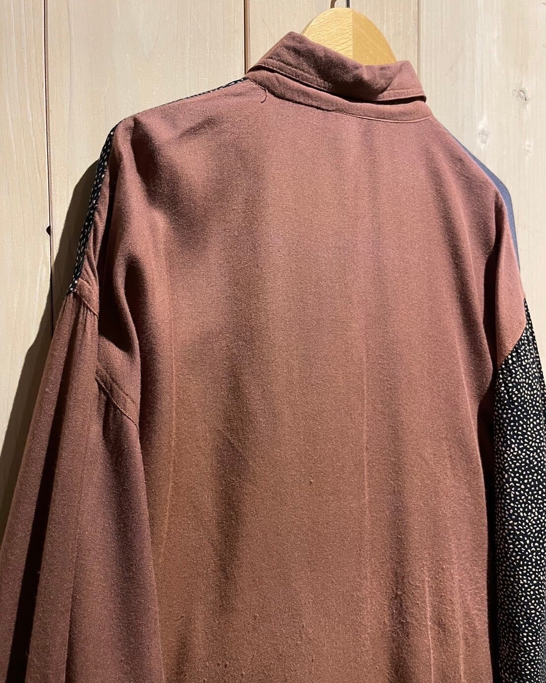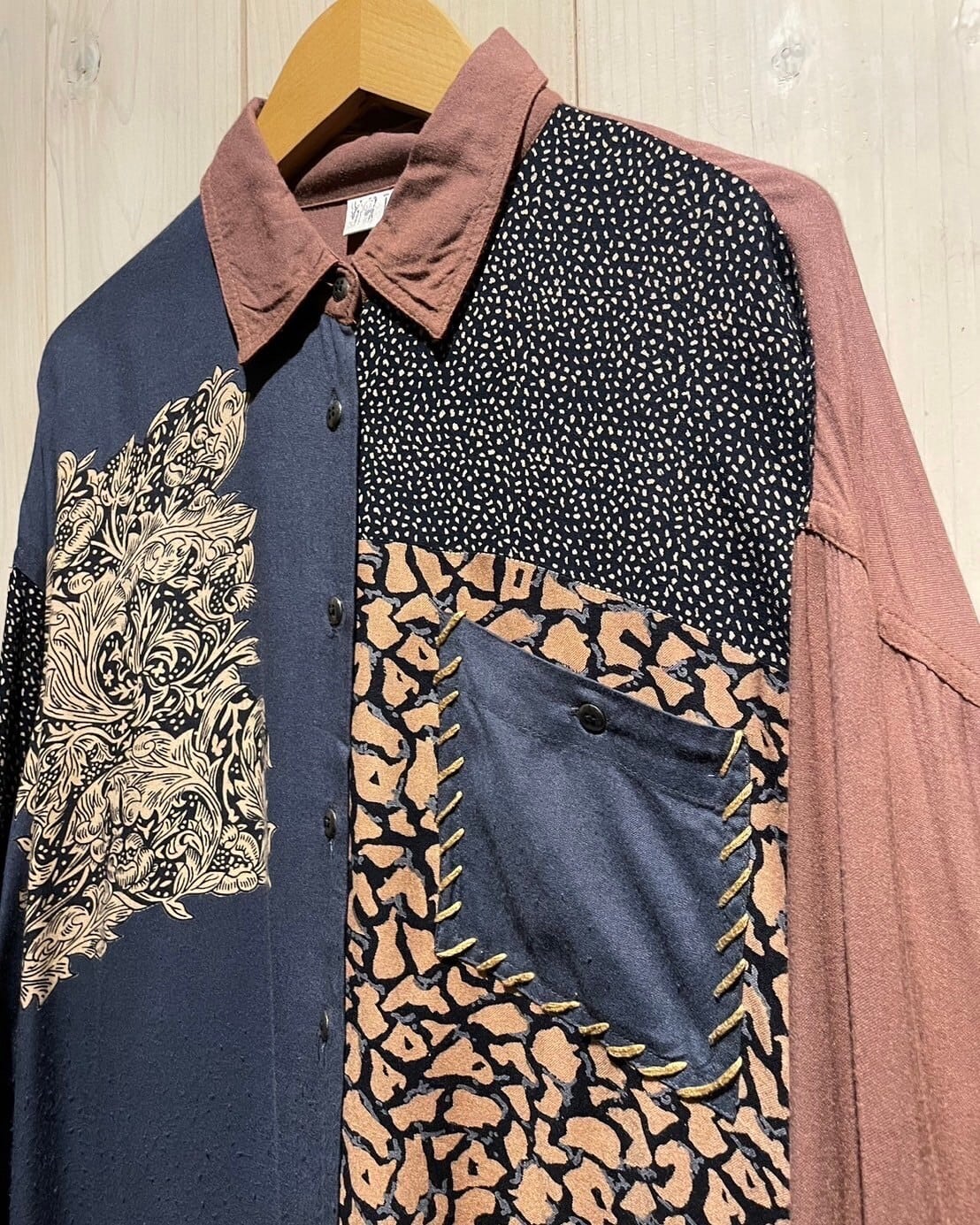 それぞれデザインが異なる4パターンの生地をパッチワーク風に切り替え、アシンメトリーに落とし込まれた、ご覧の通り“唯一無二”の1着。