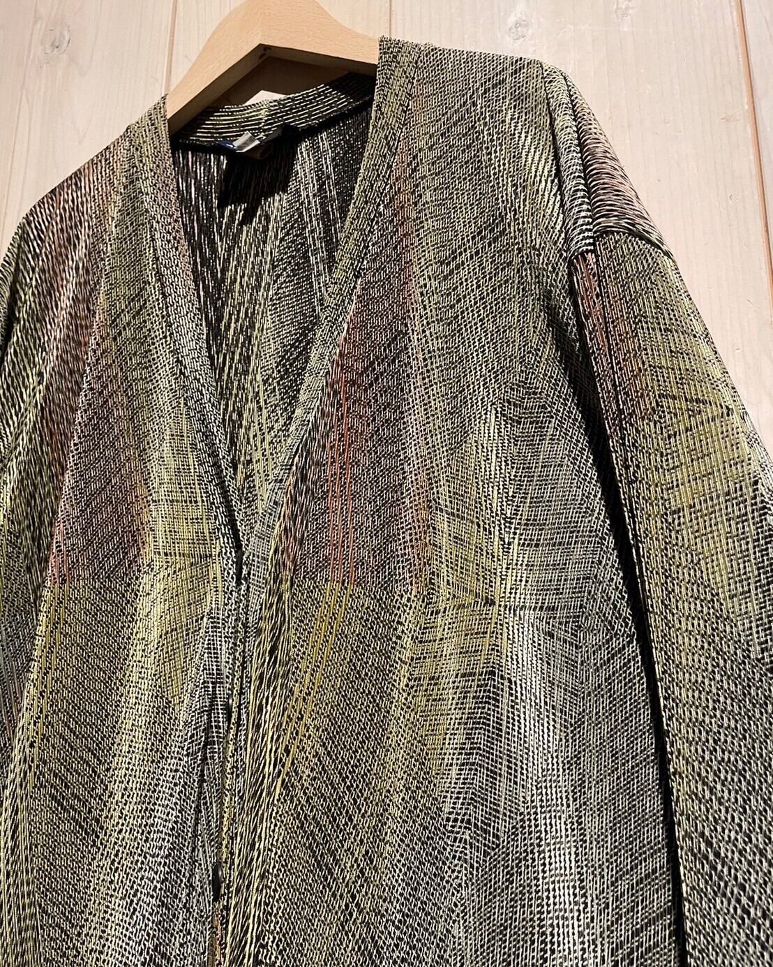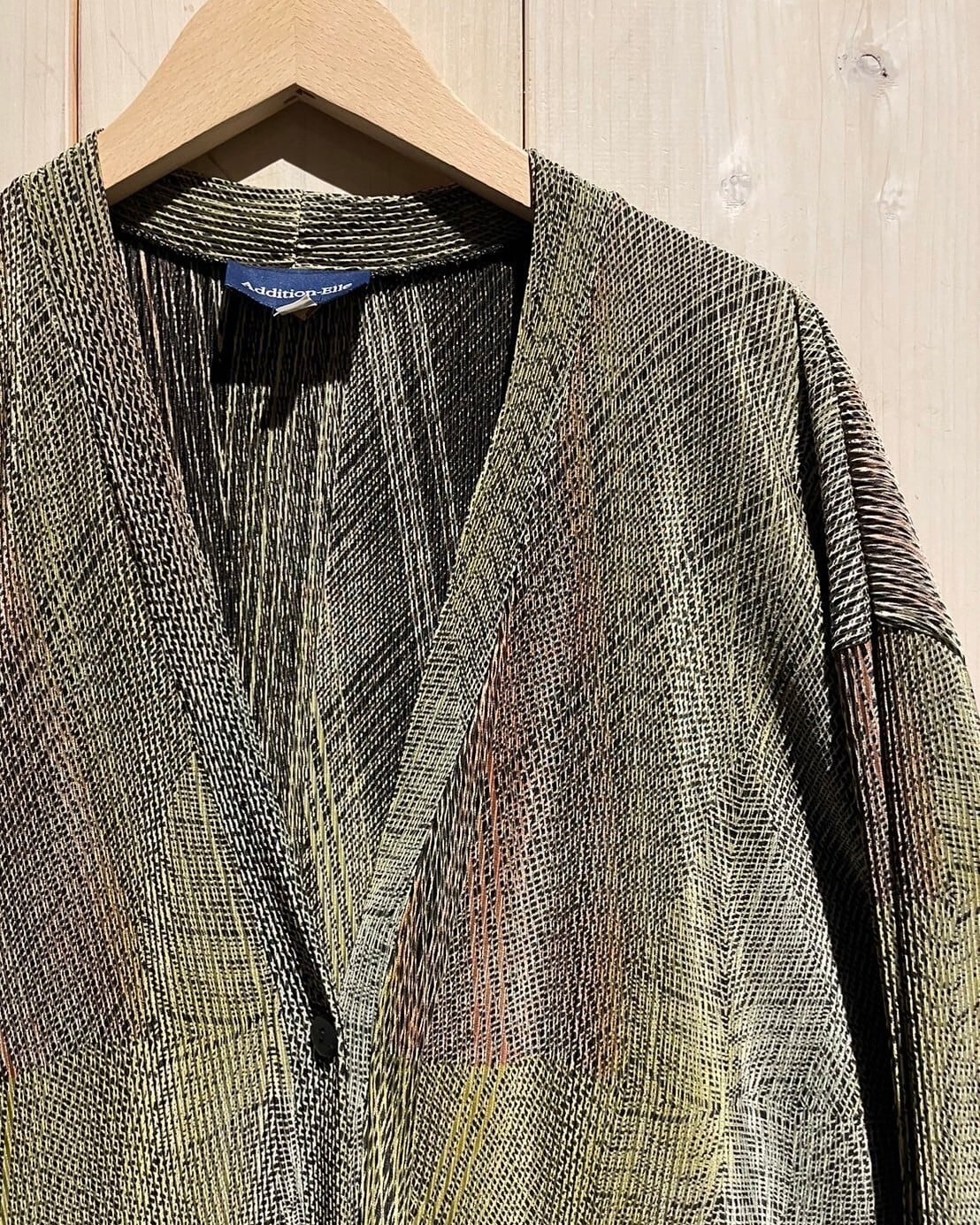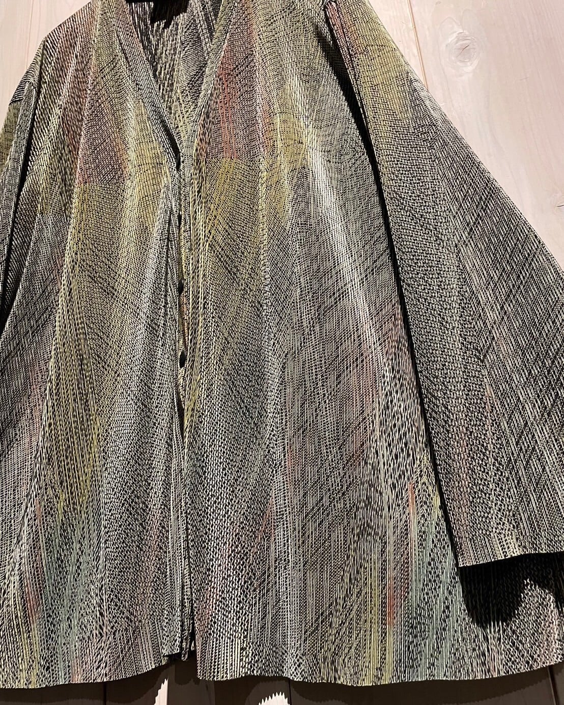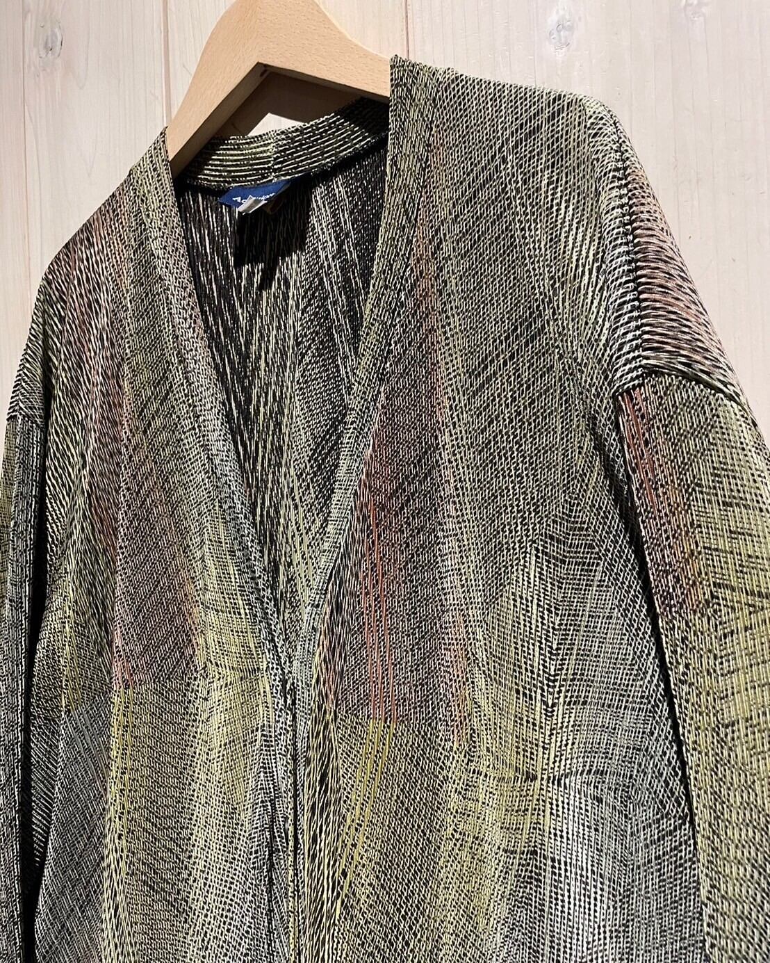 細やかなラインを施し立体感を見事に表現したプリーツ生地を採用。その上から抽象的な柄を載せたカーディガンジャケット。