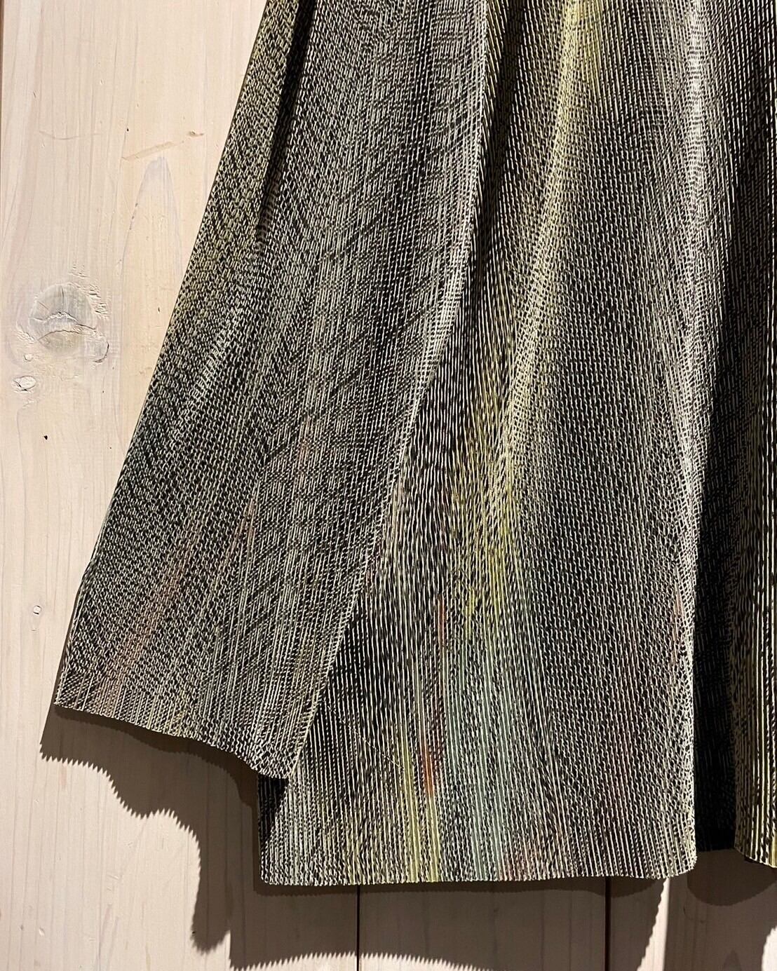 稀有なプリーツ素材も相まって、見る角度によって、柄の感じや光沢感も変化。奥行きを感じられコーディネートをのっぺりとさせず、絶妙な存在感を発揮。