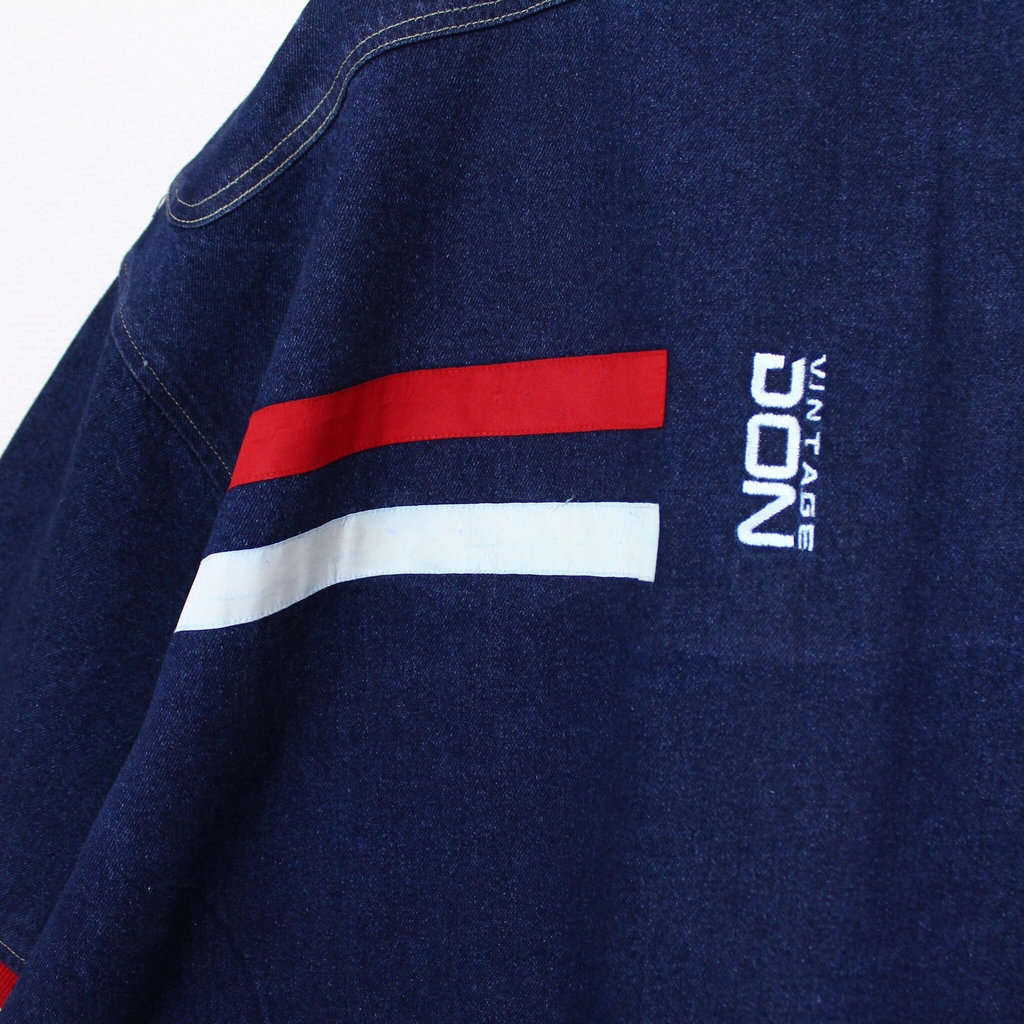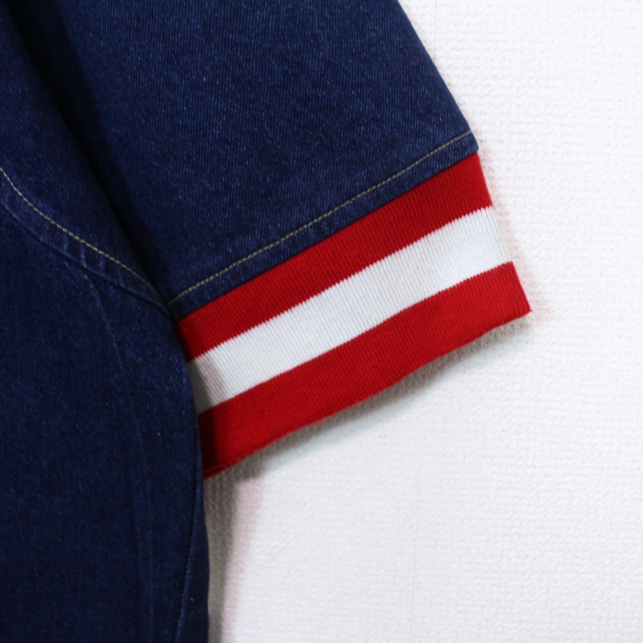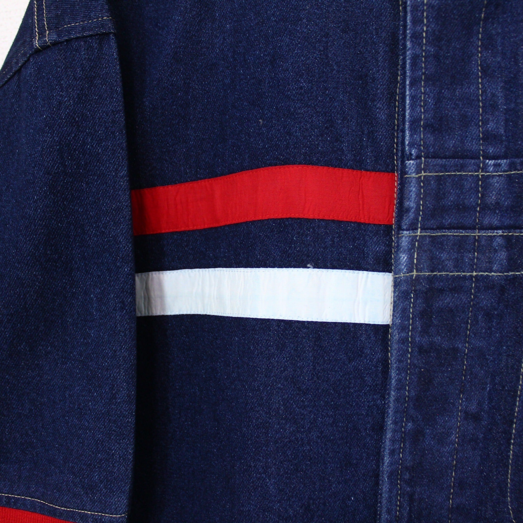 コシのあるインディゴデニムをベースに、右胸、背面には赤×白のライン、リブも同じカラーで切り替えた1着。