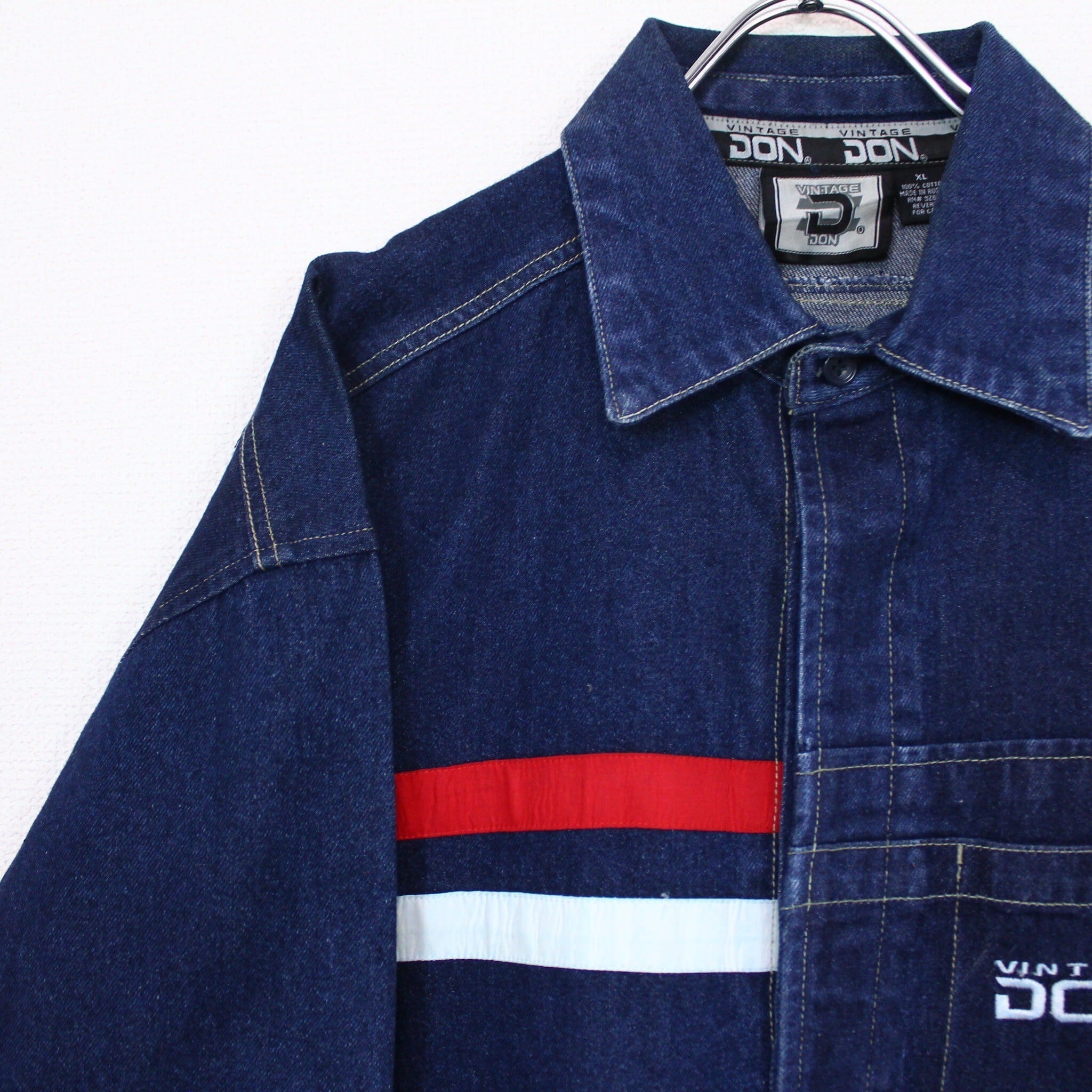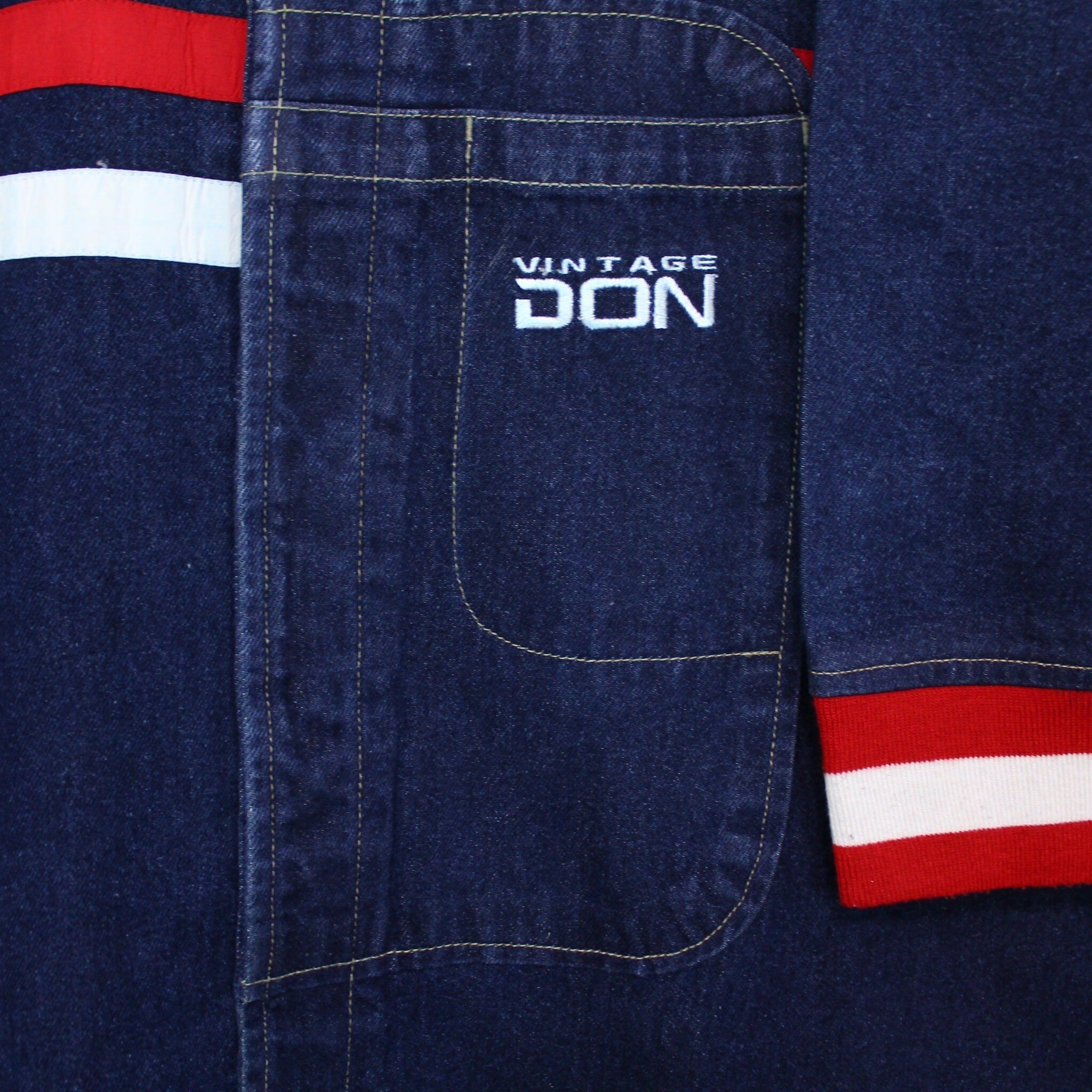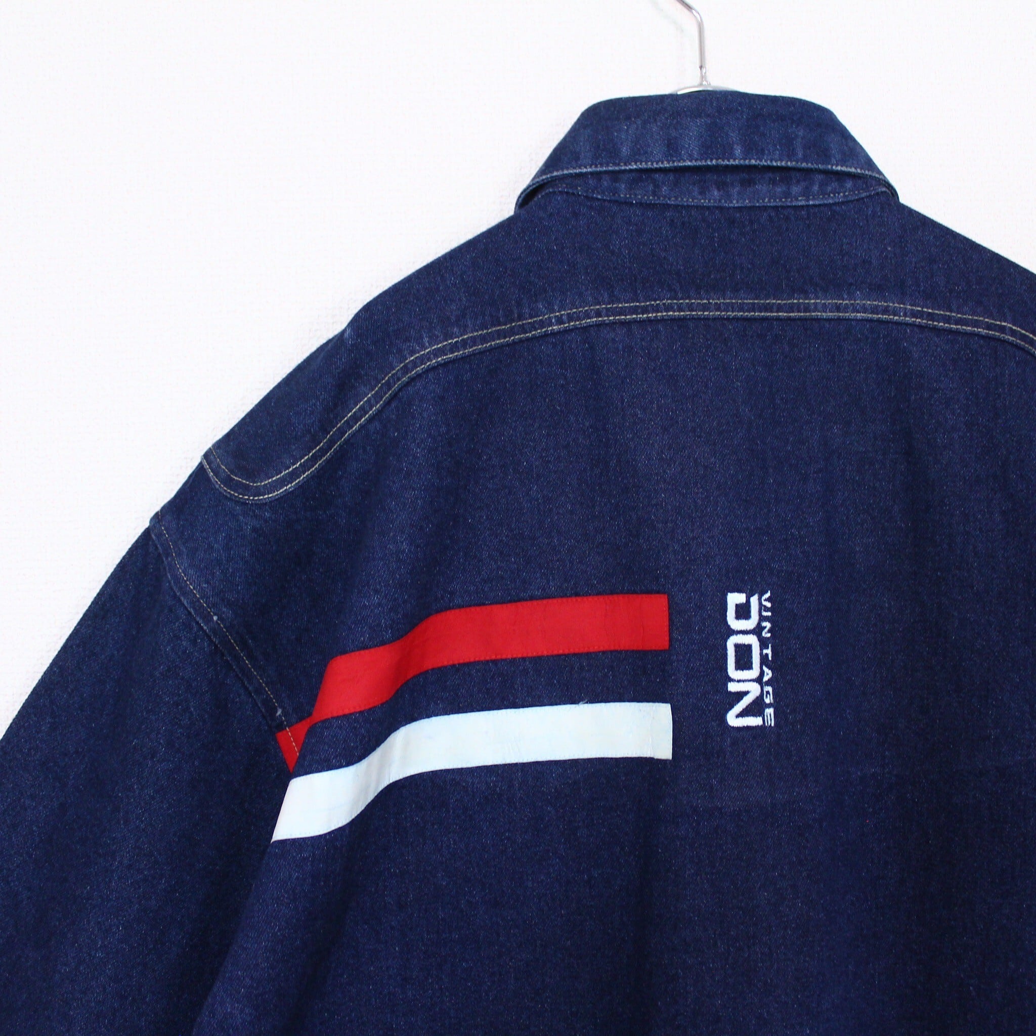 コシのあるインディゴデニムをベースに、右胸、背面には赤×白のライン、リブも同じカラーで切り替えた1着。
