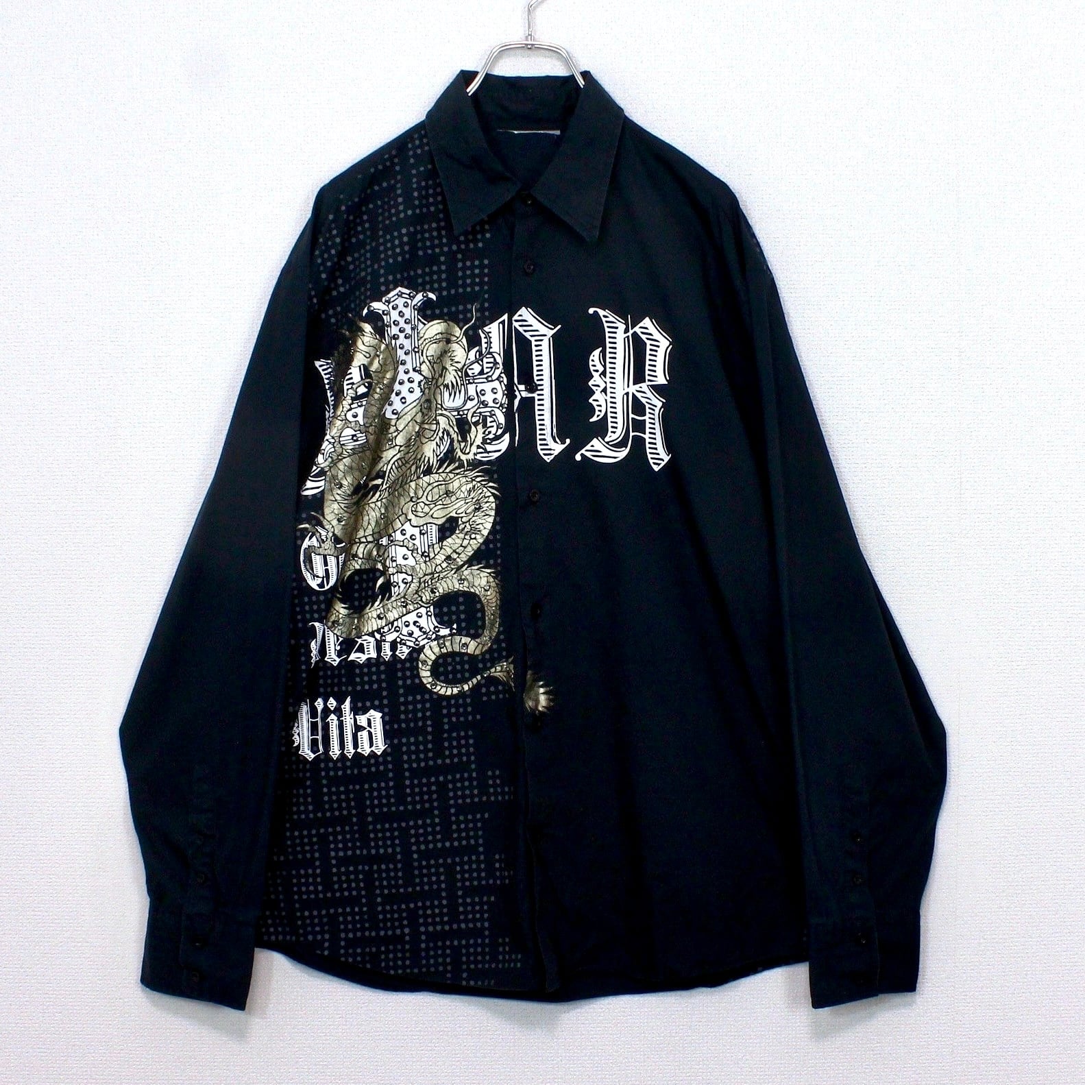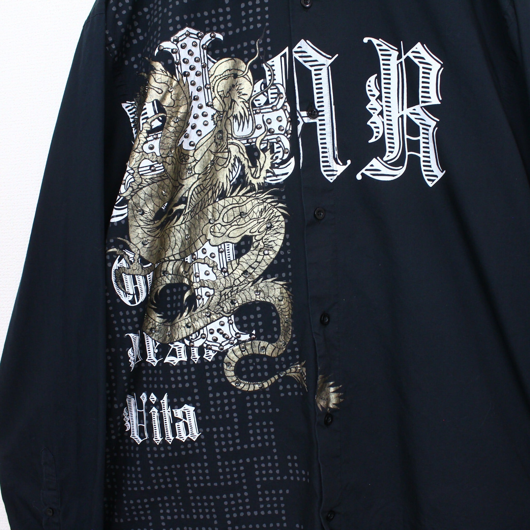 柔らかなコットンを用いたボディに、オールドイングリッシュでブランドロゴを、鋭い光沢を放つゴールドカラーで龍、そしてクロスをプリントした、昨今のトレンドでもあるY2Kな雰囲気を漂わせる長袖シャツ。