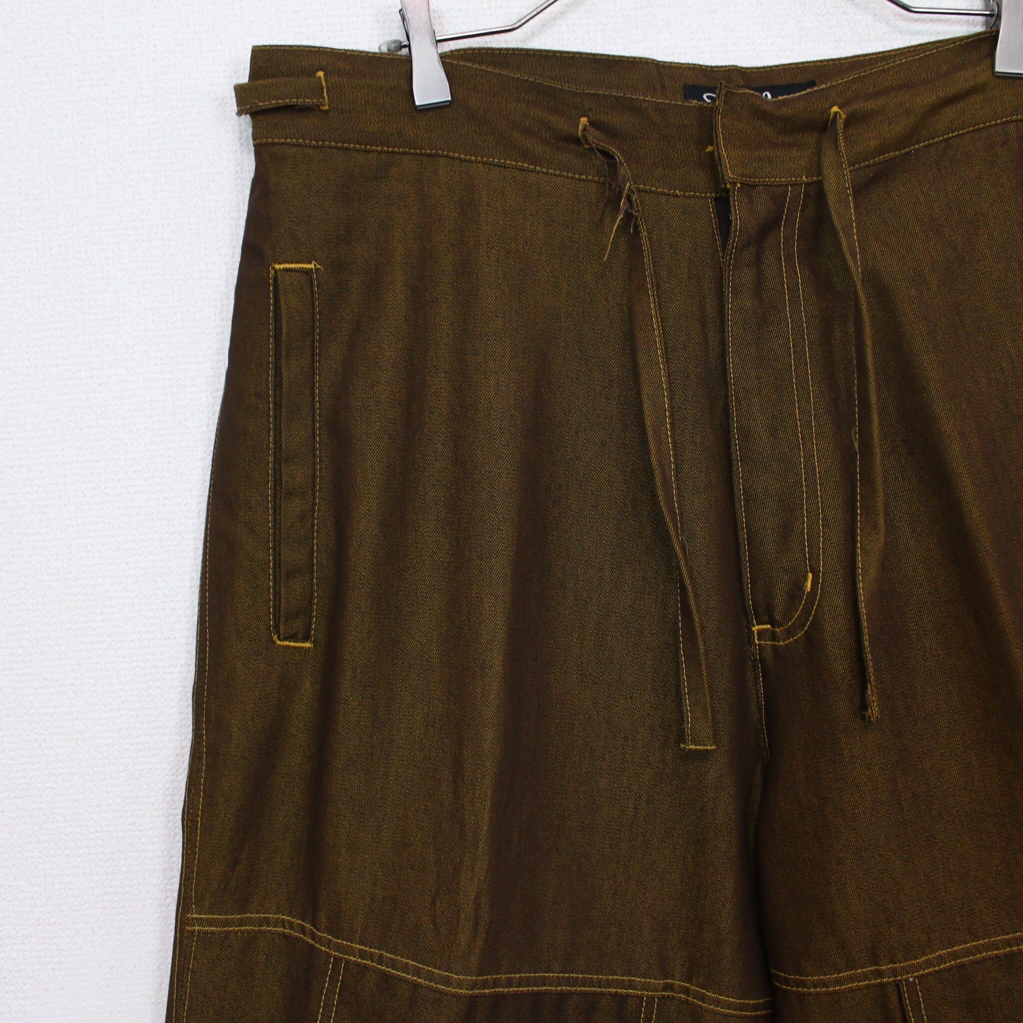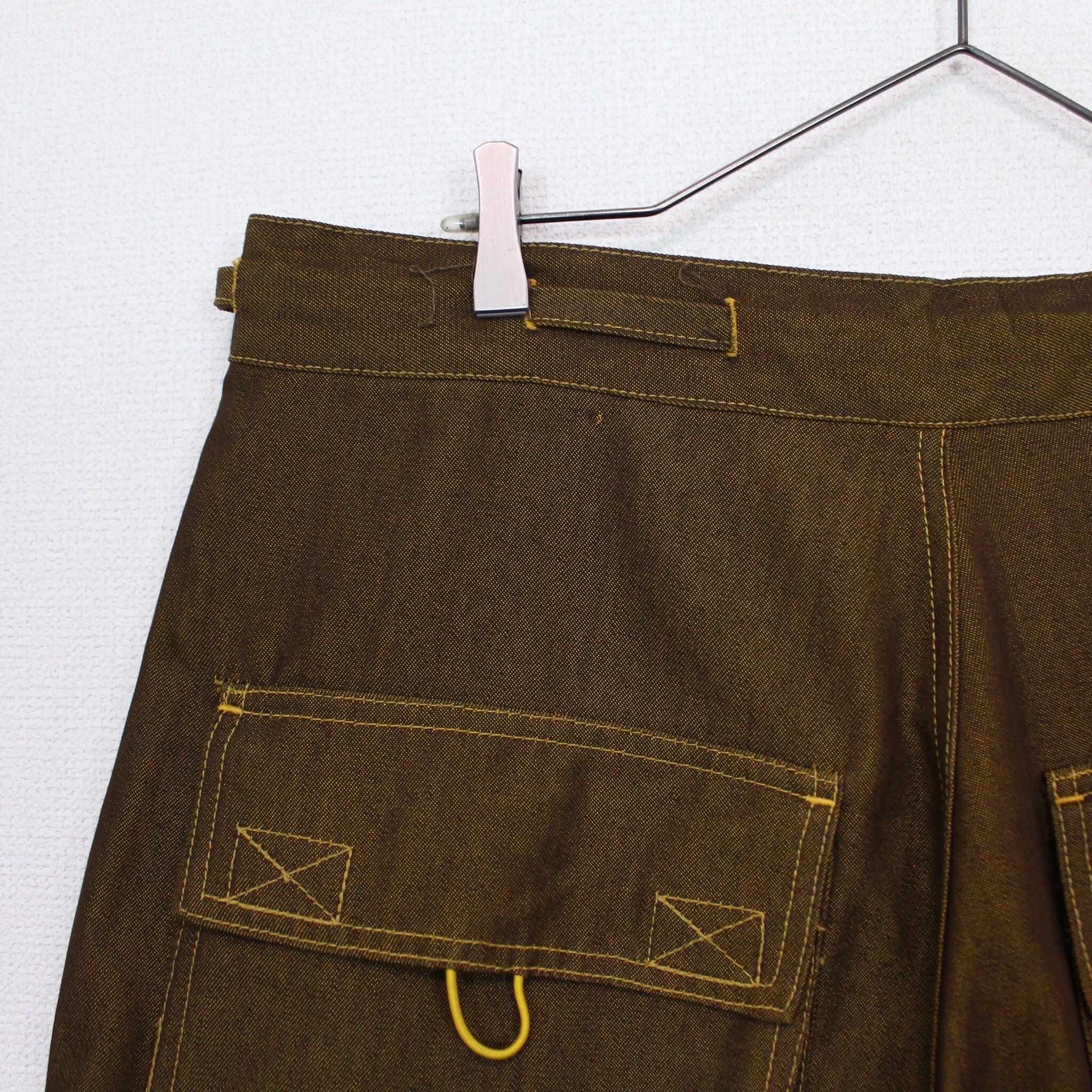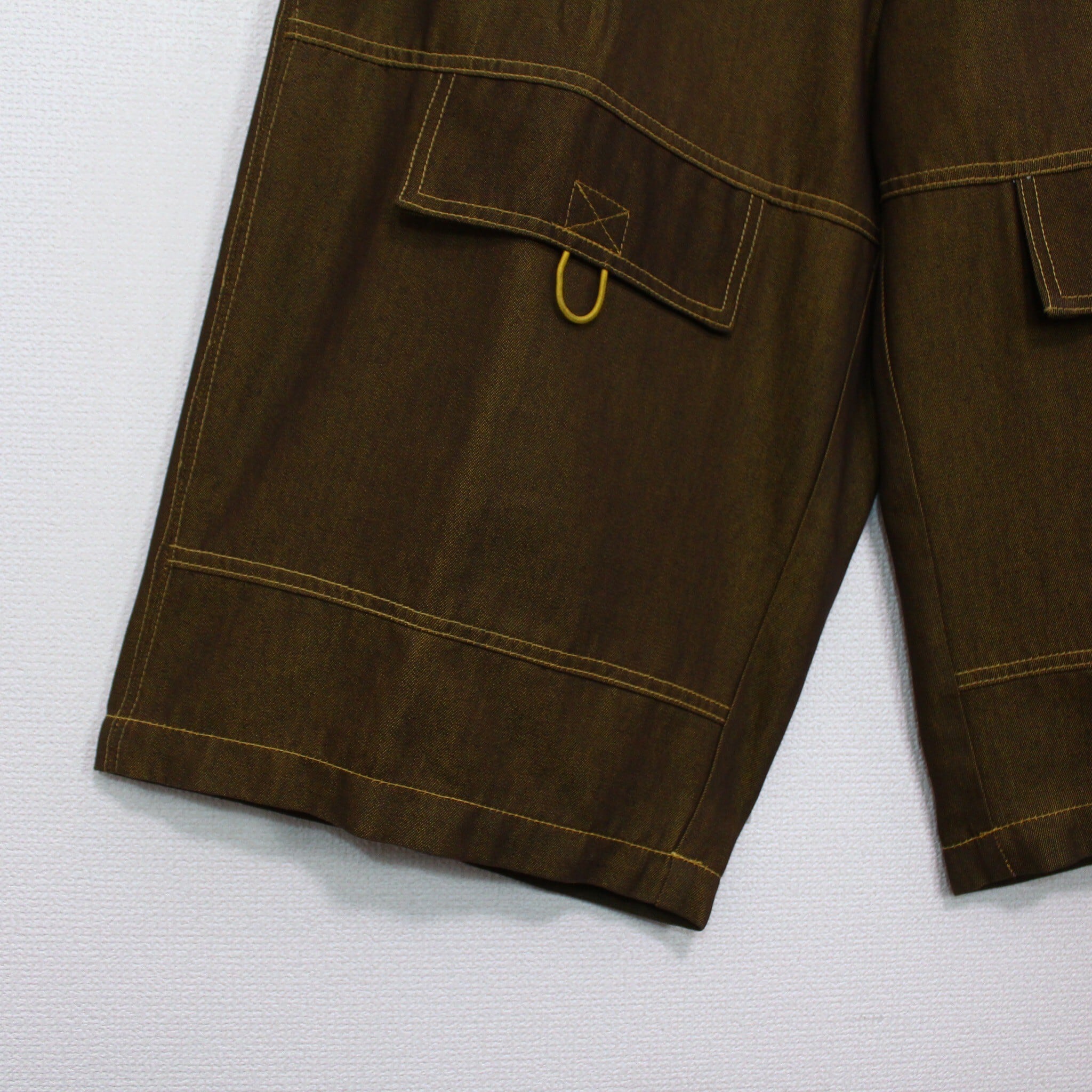 若干の光沢があるハリ、コシのあるブラウンのデニムを用いたボディに、フロントにフラップ、背面には大きめのフラップポケットを載せた超ワイドなデニムショーツ。