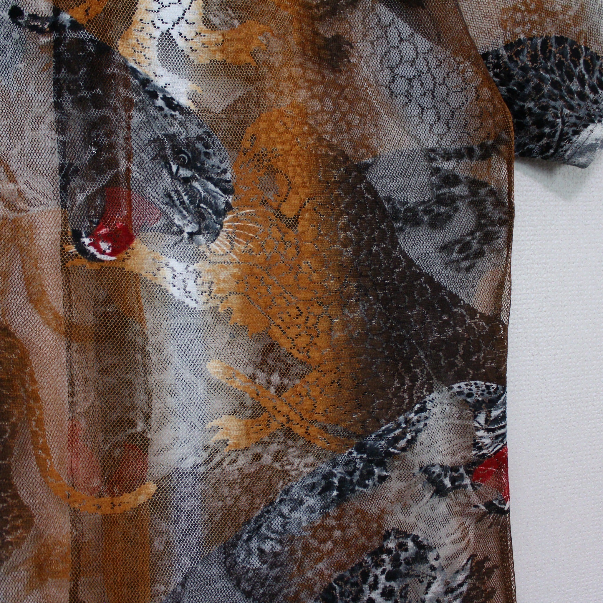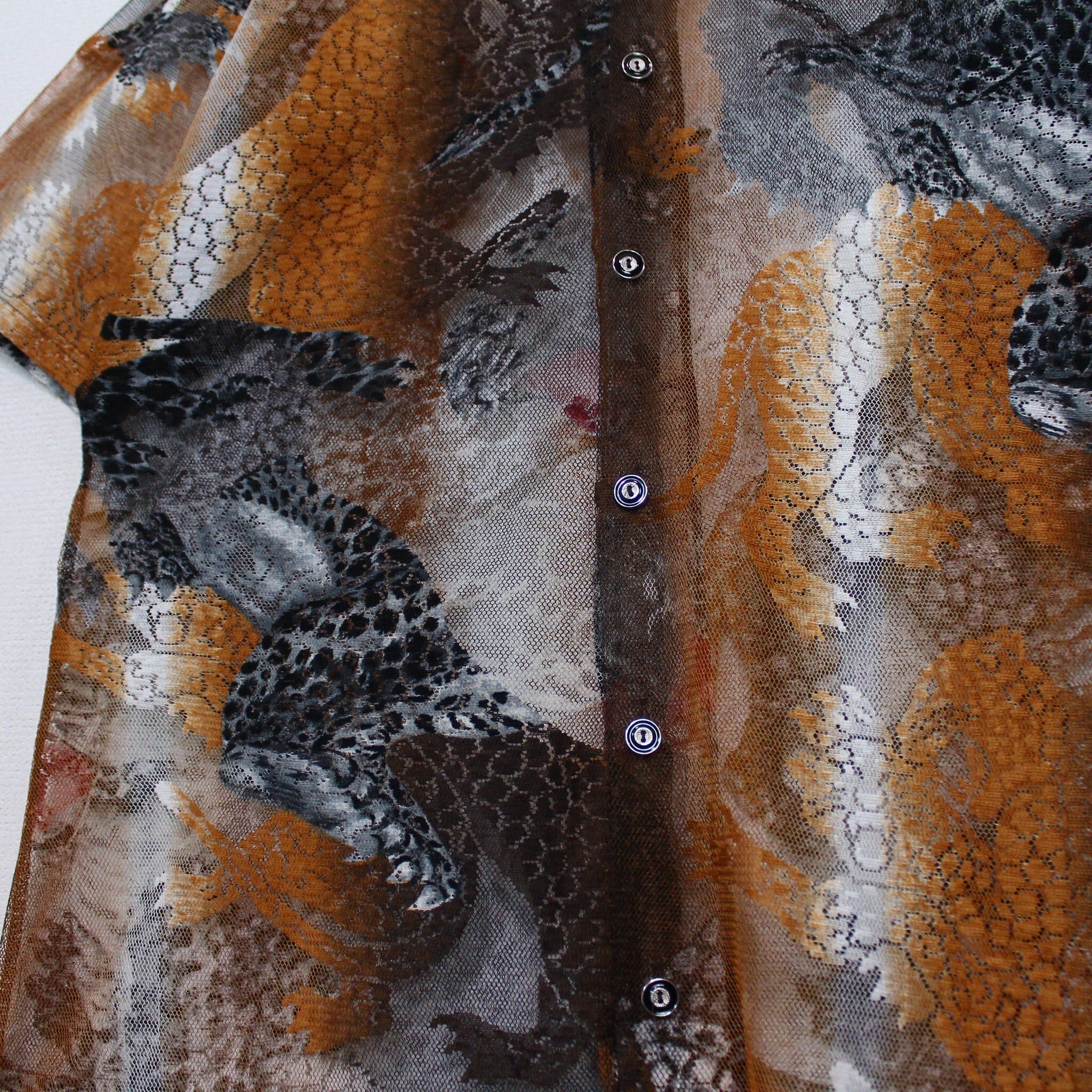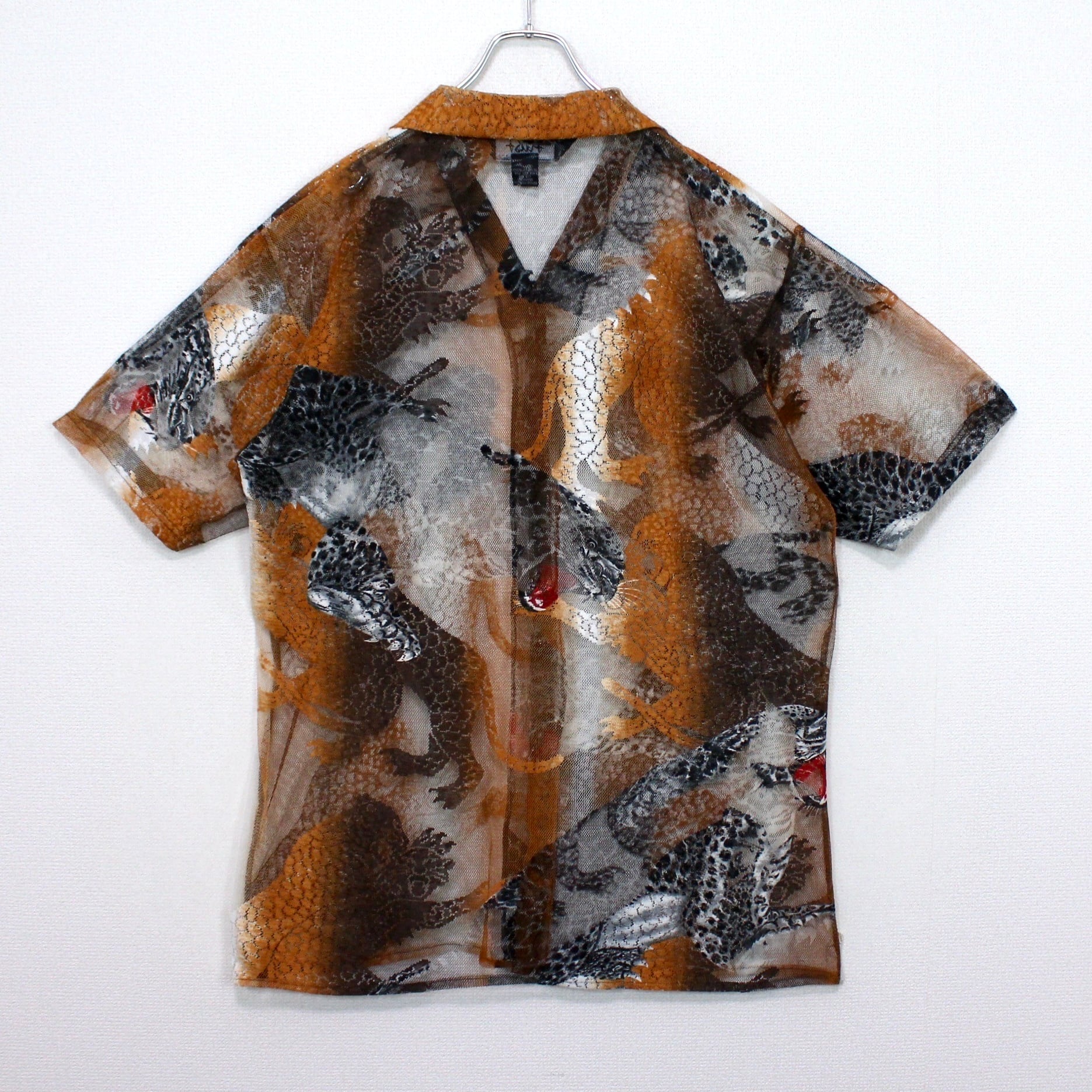 涼しげな透け感のあるメッシュ素材をベースにに、勇ましい虎を載せた半袖シャツ。