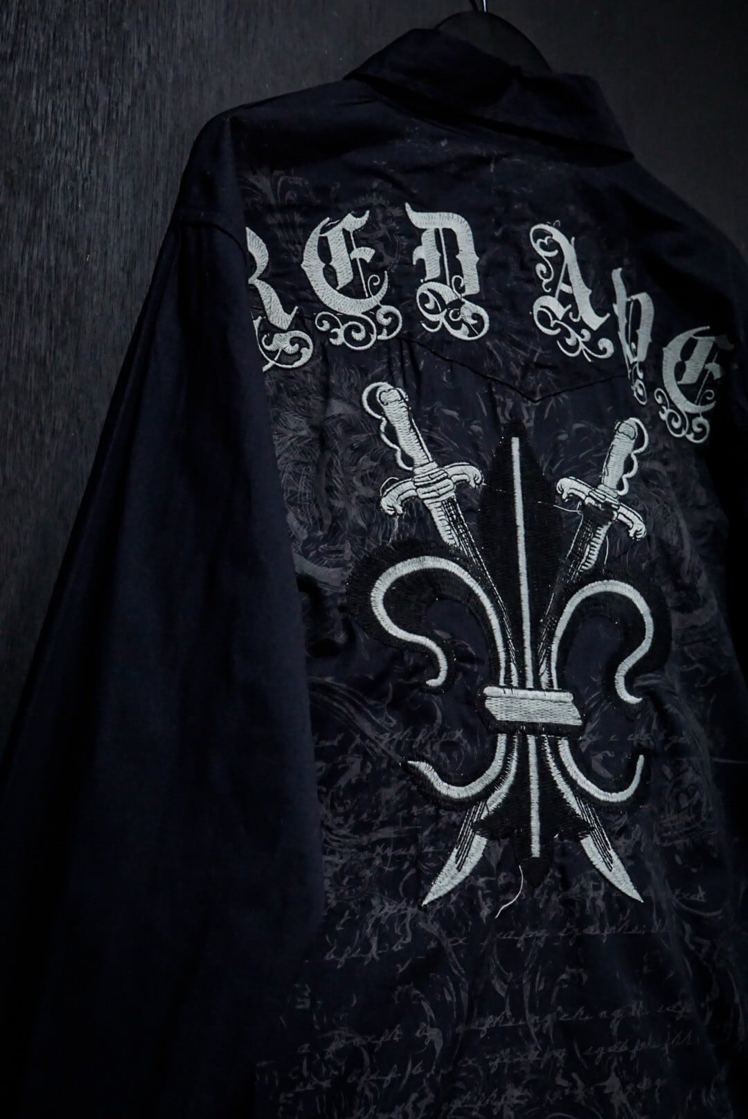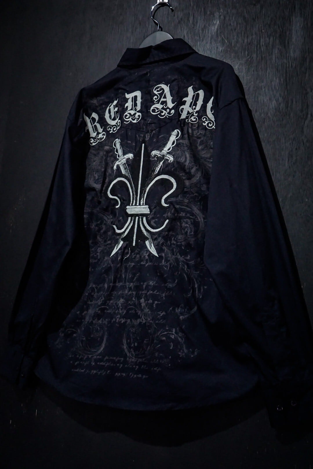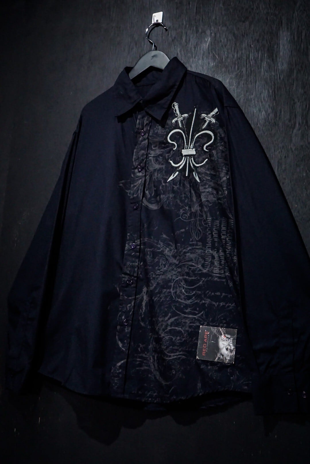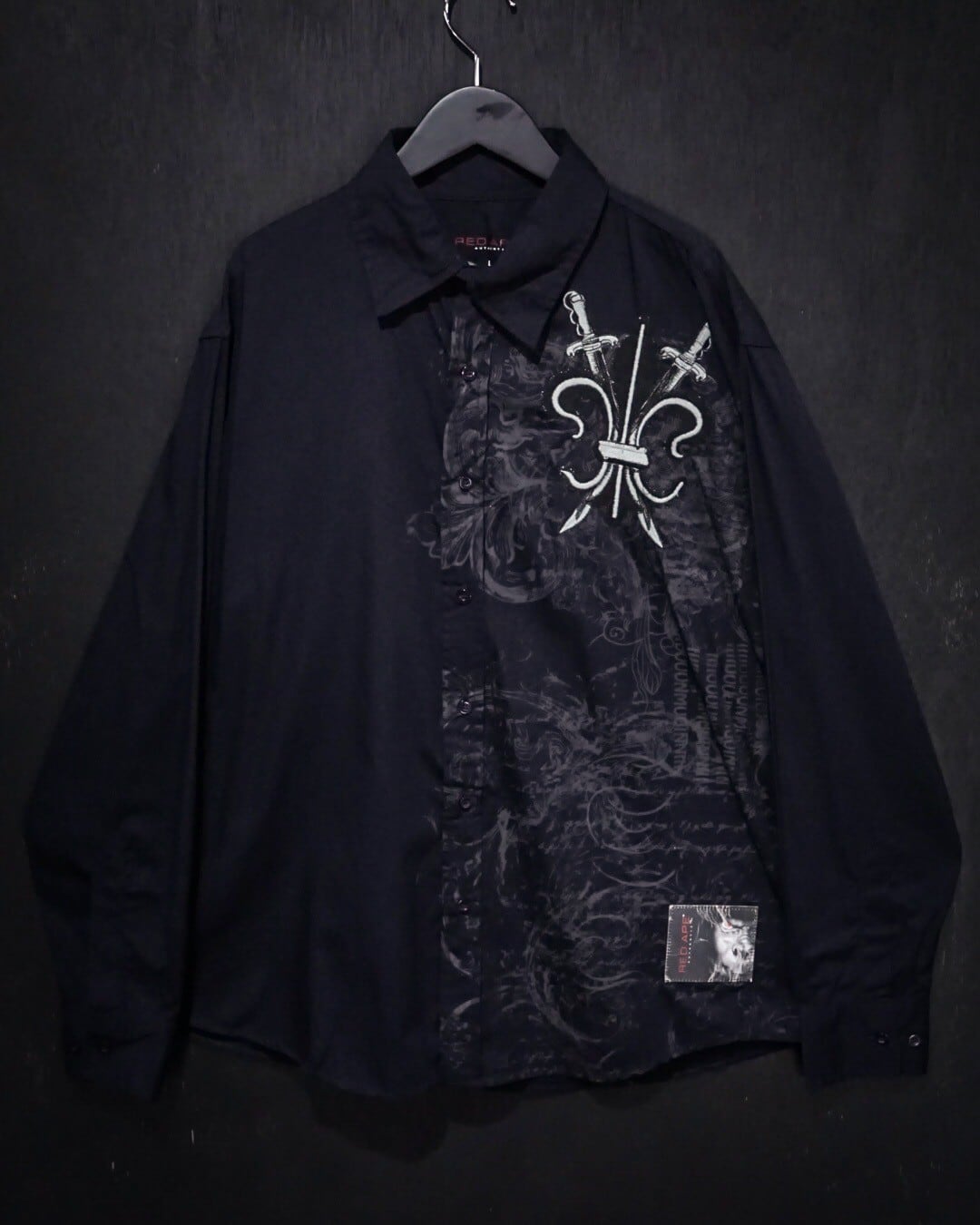 ブラックのボディをベースに、剣を組み込んだゴシック調のデザインをプリントした長袖シャツ。