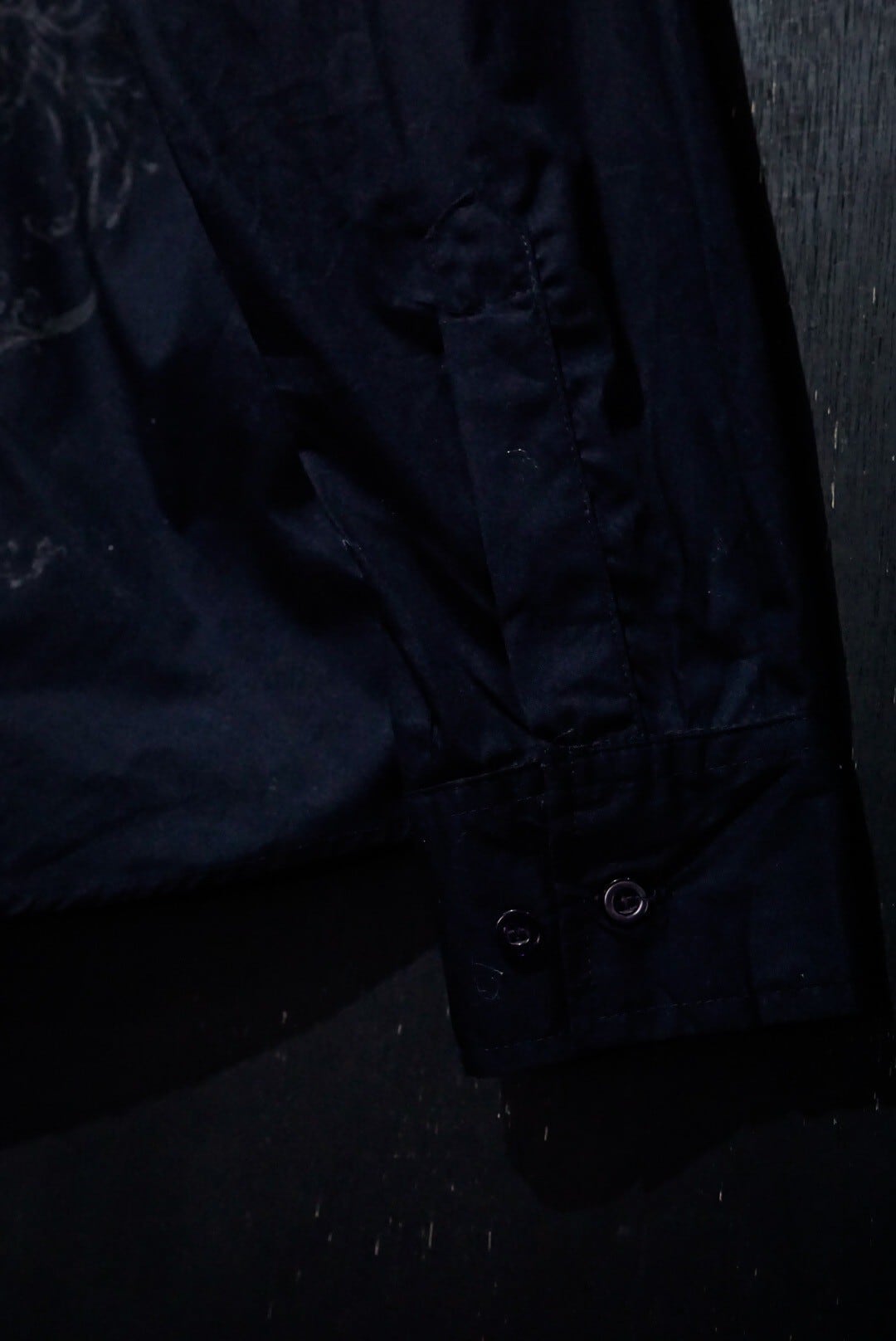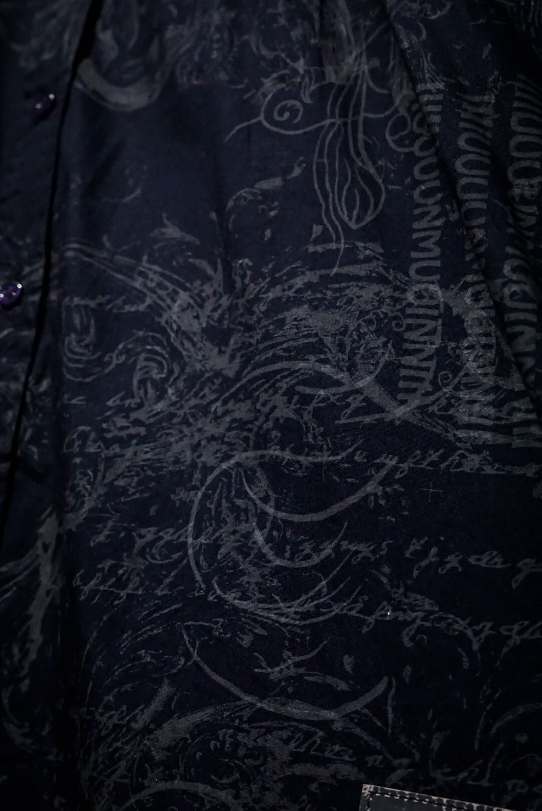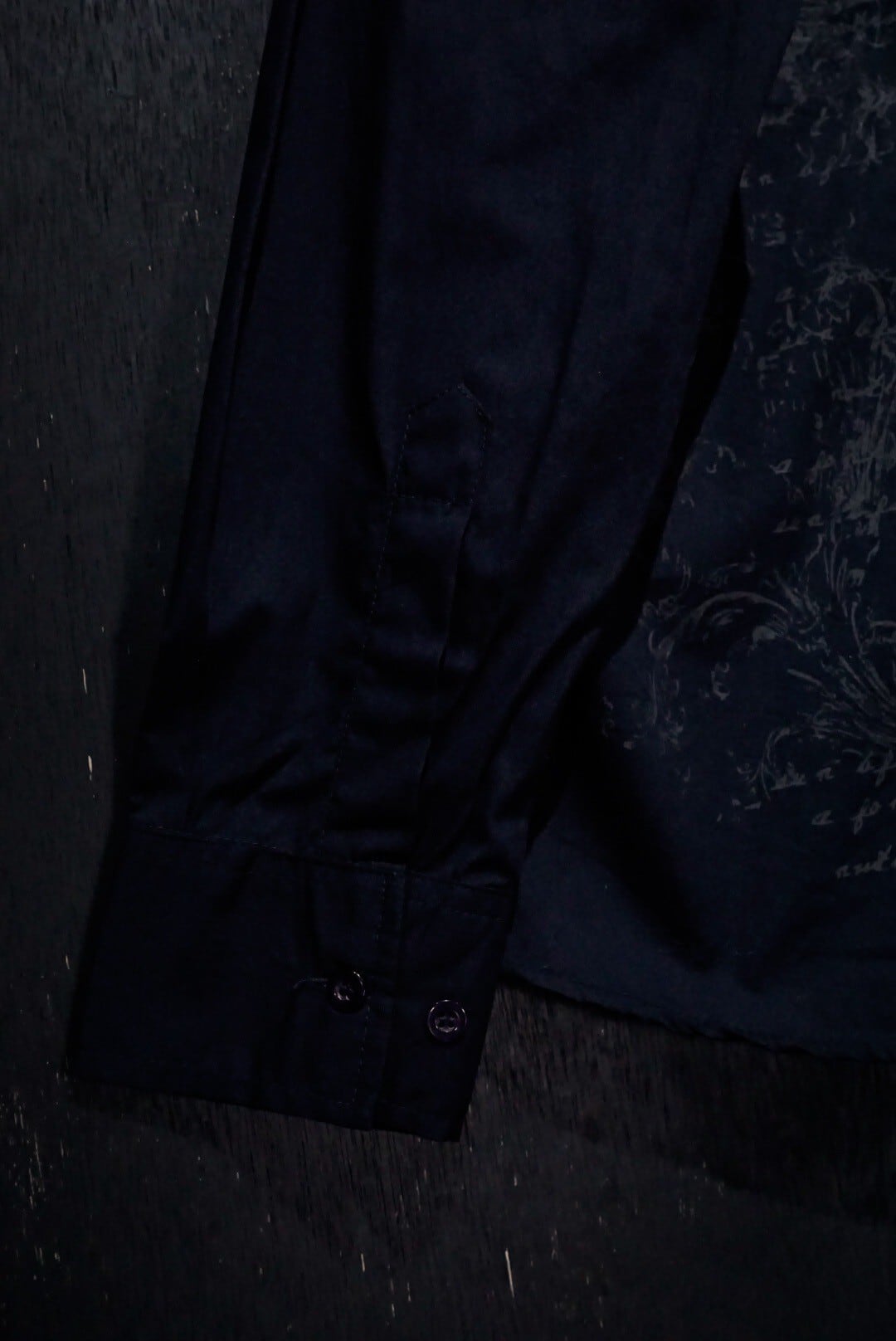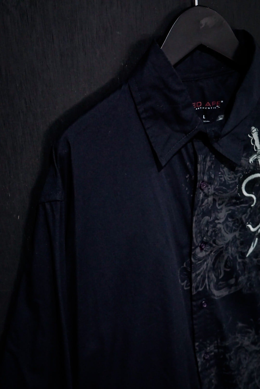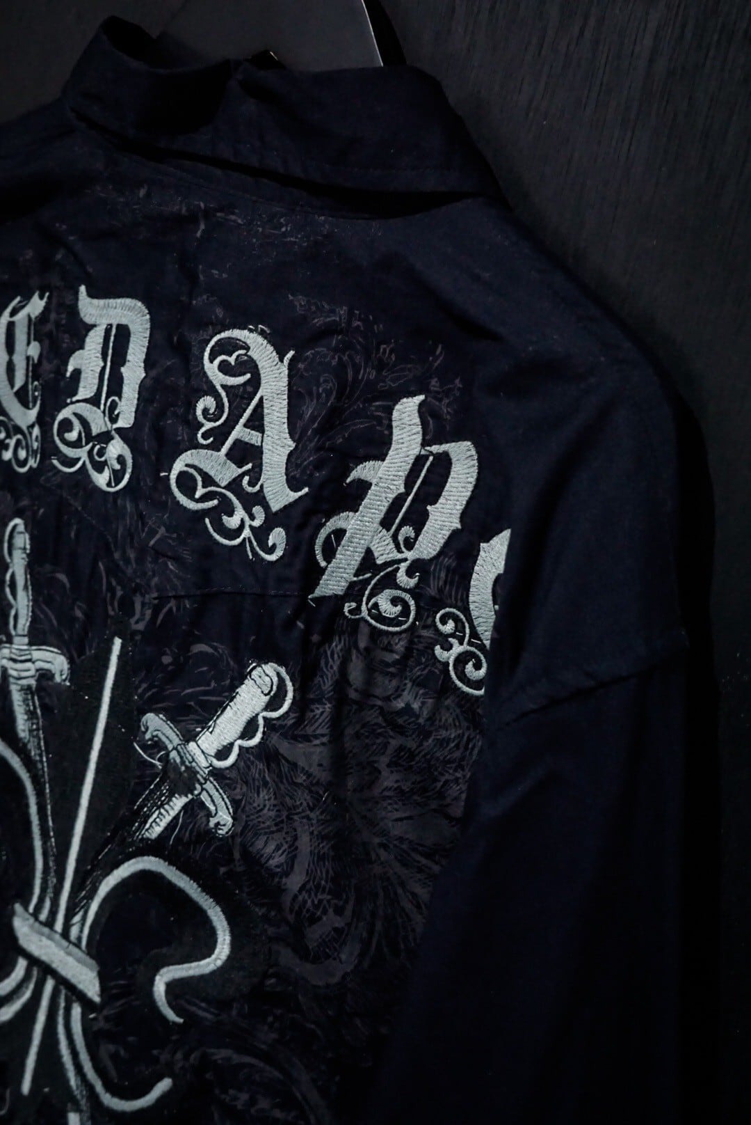 ブラックのボディをベースに、剣を組み込んだゴシック調のデザインをプリントした長袖シャツ。