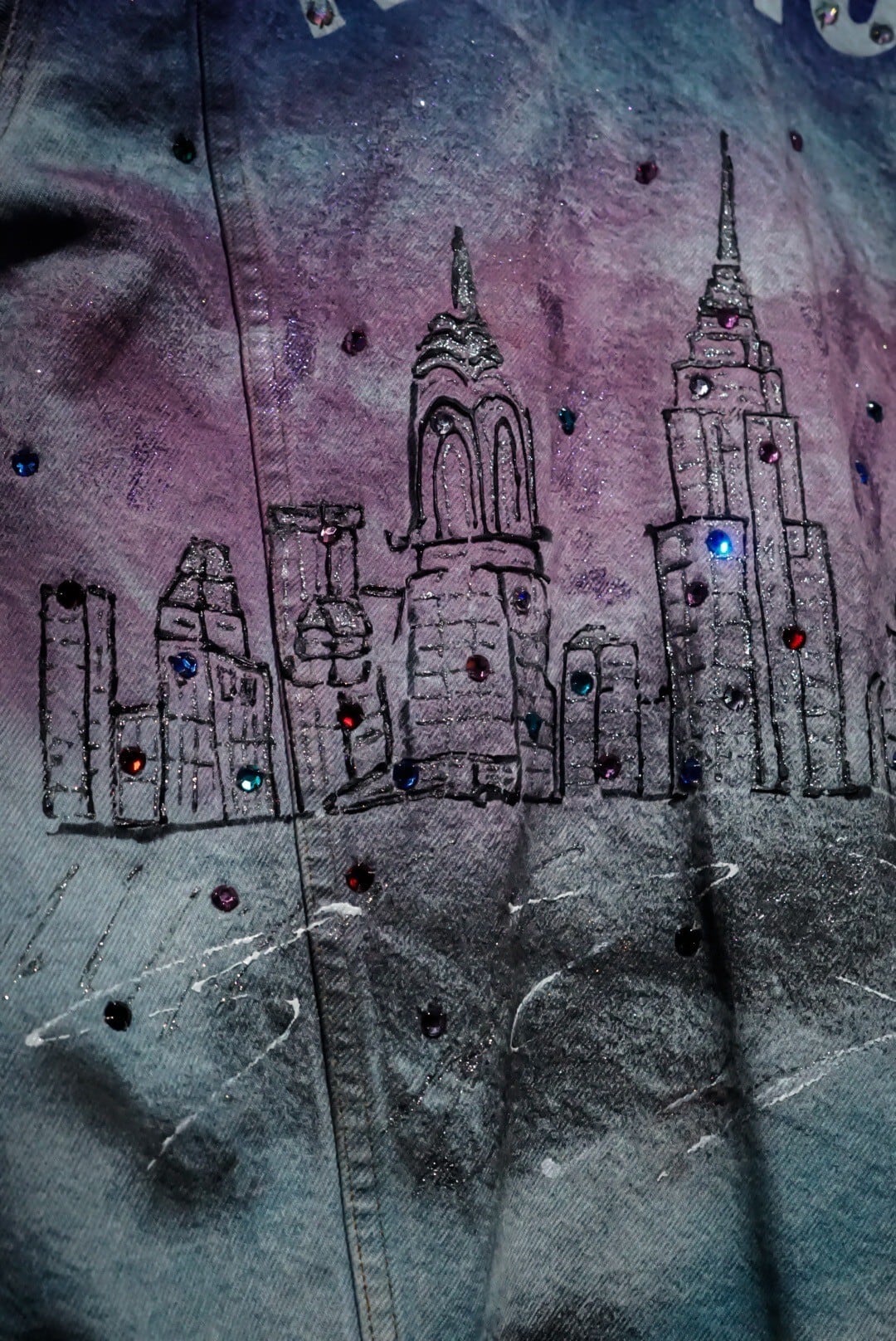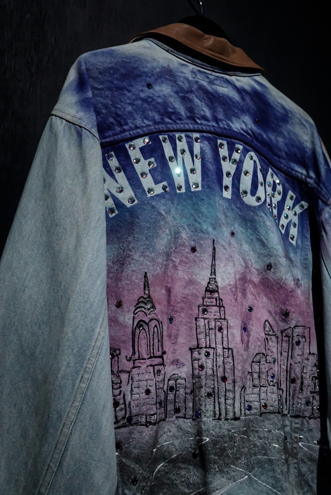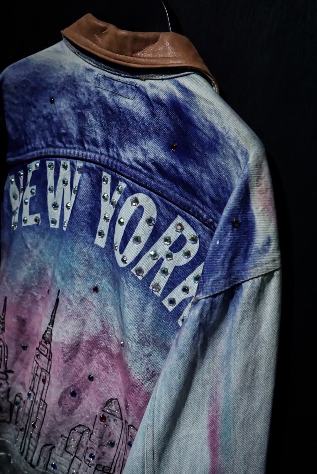 背面には美しいグラデーションにニューヨークの街並みを、右肩にはニューヨークの愛称"Big Apple"を表現したリンゴをハンドペイントで施した1着。