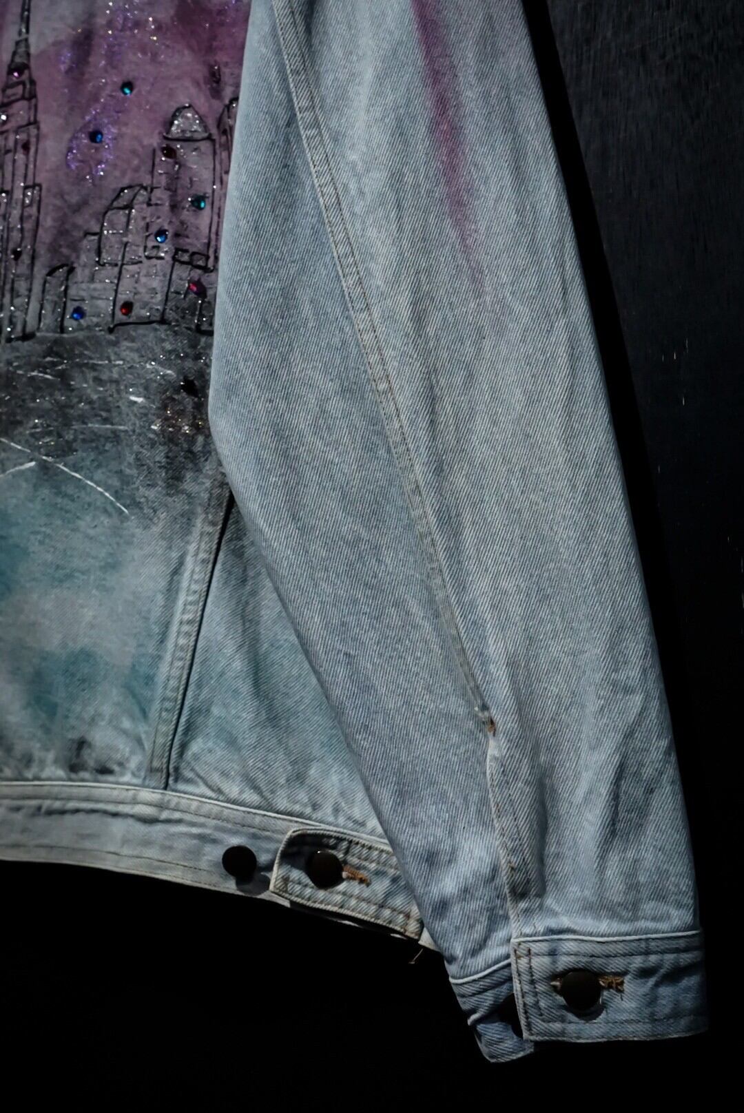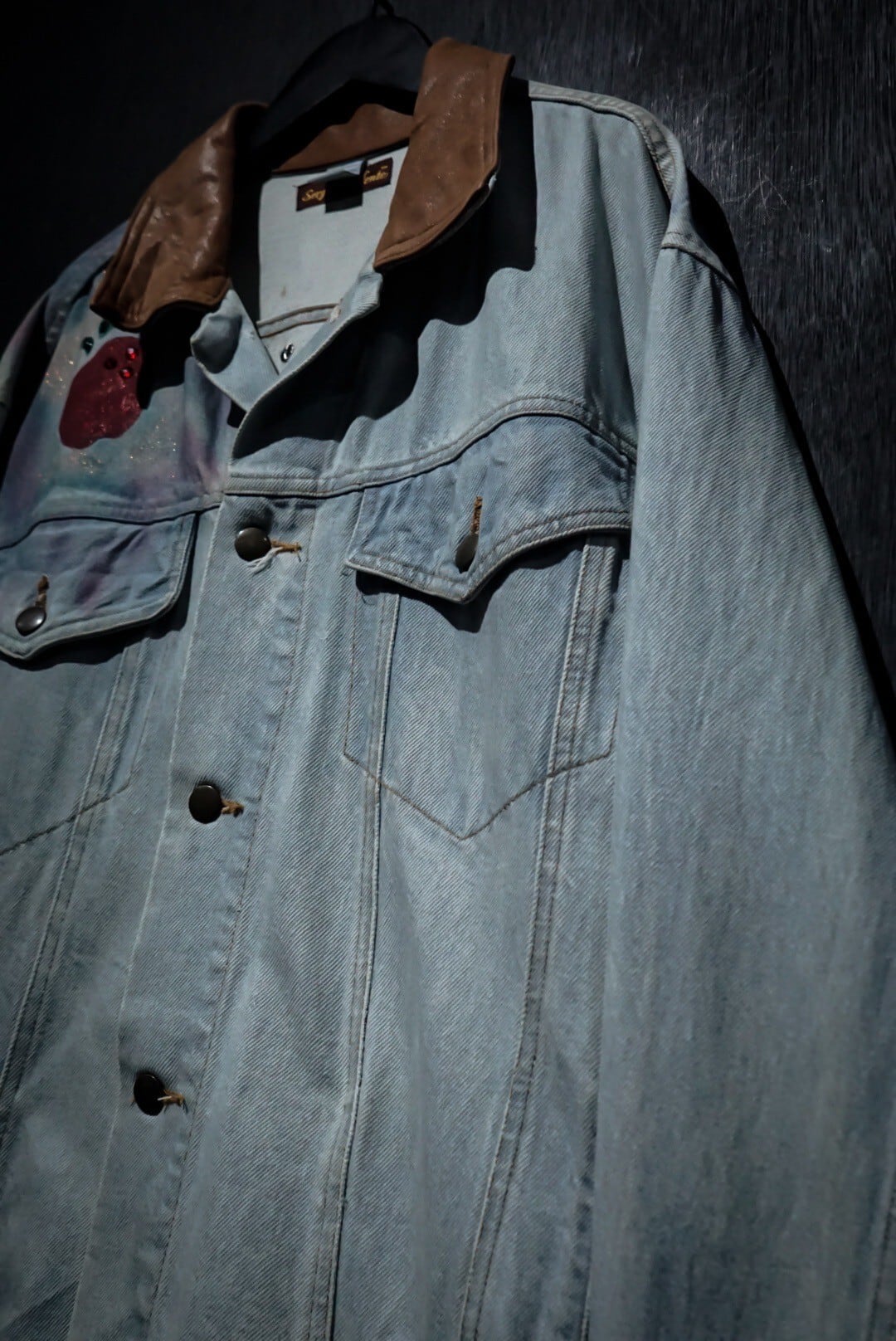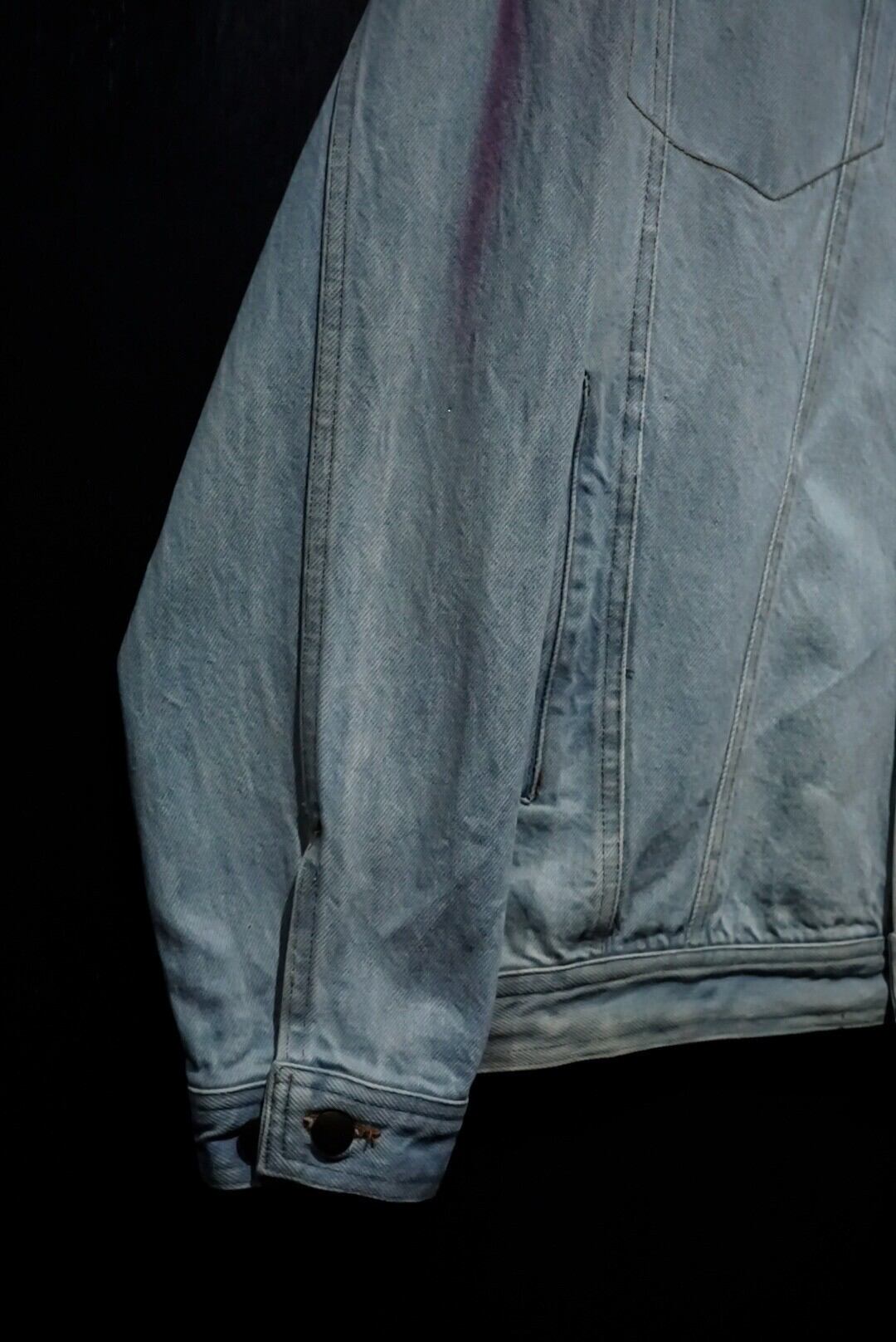襟にレザーを切り替えた、アイスブルーにフェードしたデニムジャケットをベースに、前所有者によるペイントのカスタムが施されたスペシャルな1着をご紹介致します。