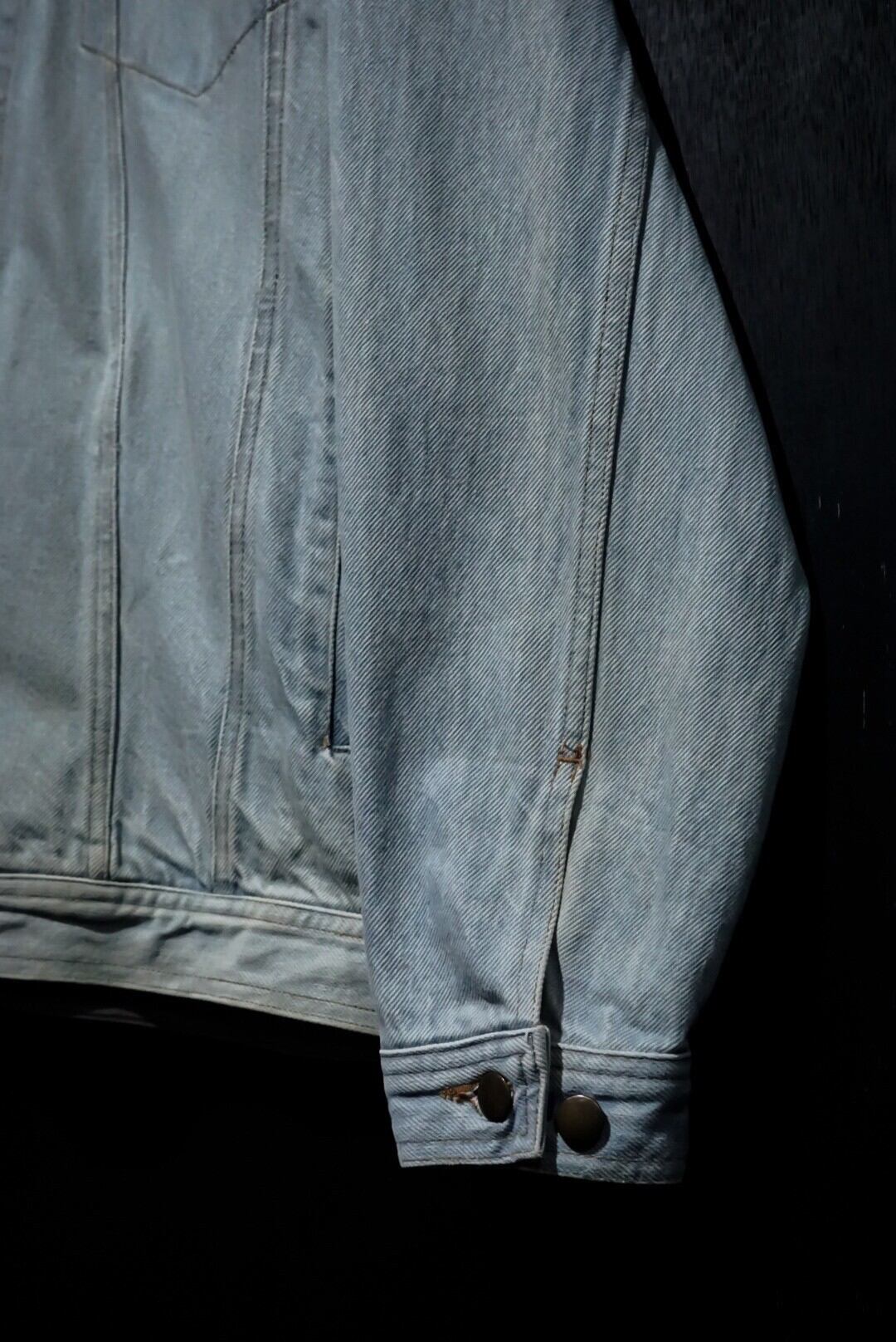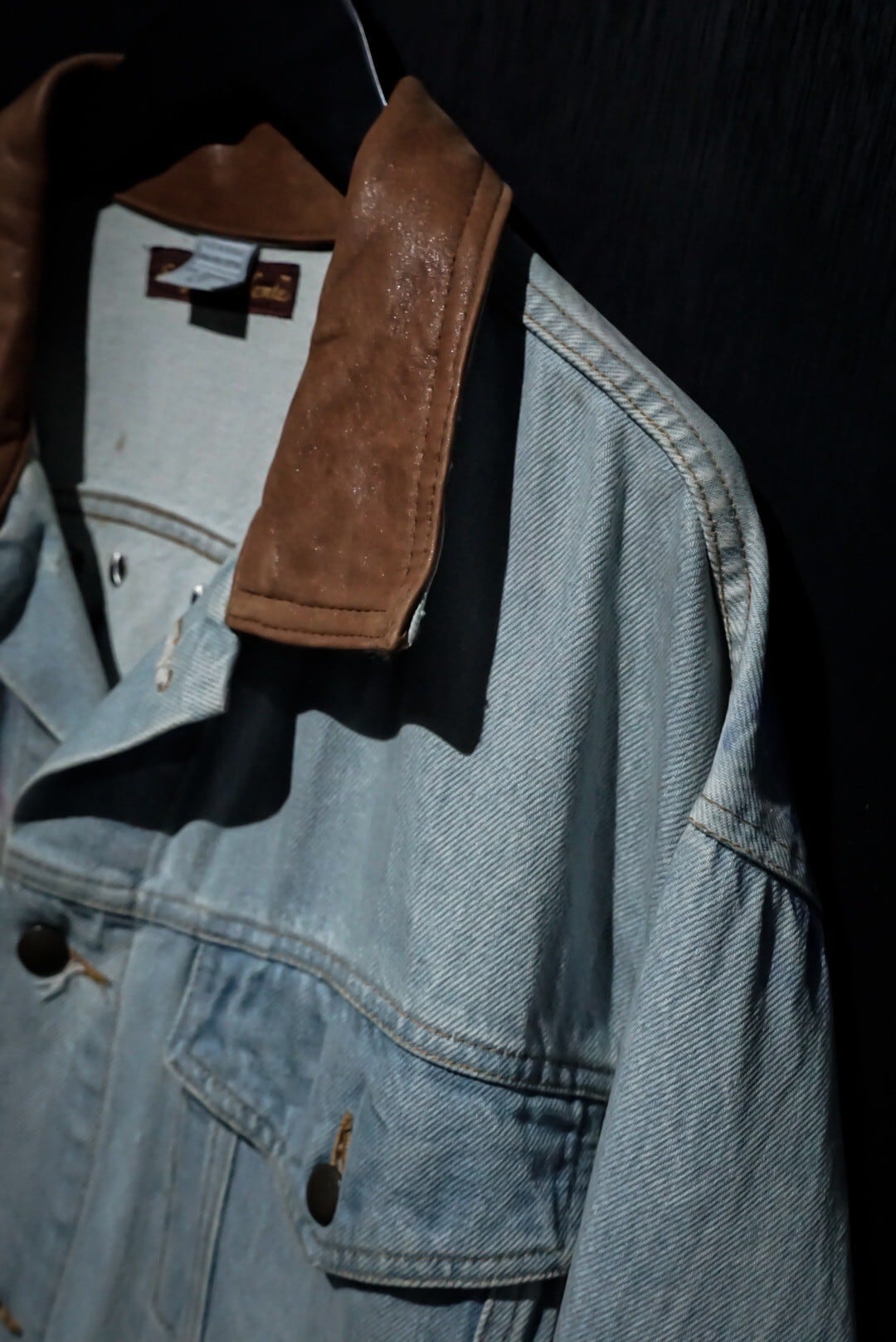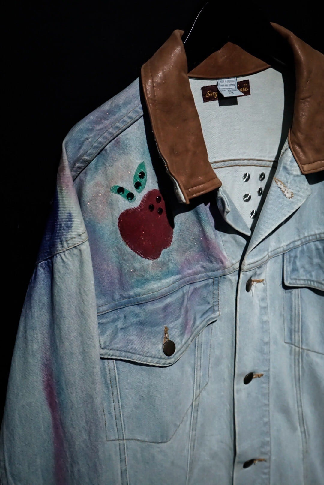 襟にレザーを切り替えた、アイスブルーにフェードしたデニムジャケットをベースに、前所有者によるペイントのカスタムが施されたスペシャルな1着をご紹介致します。