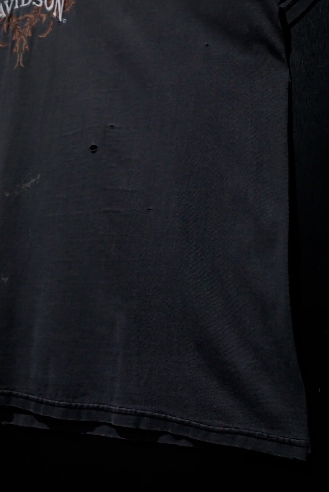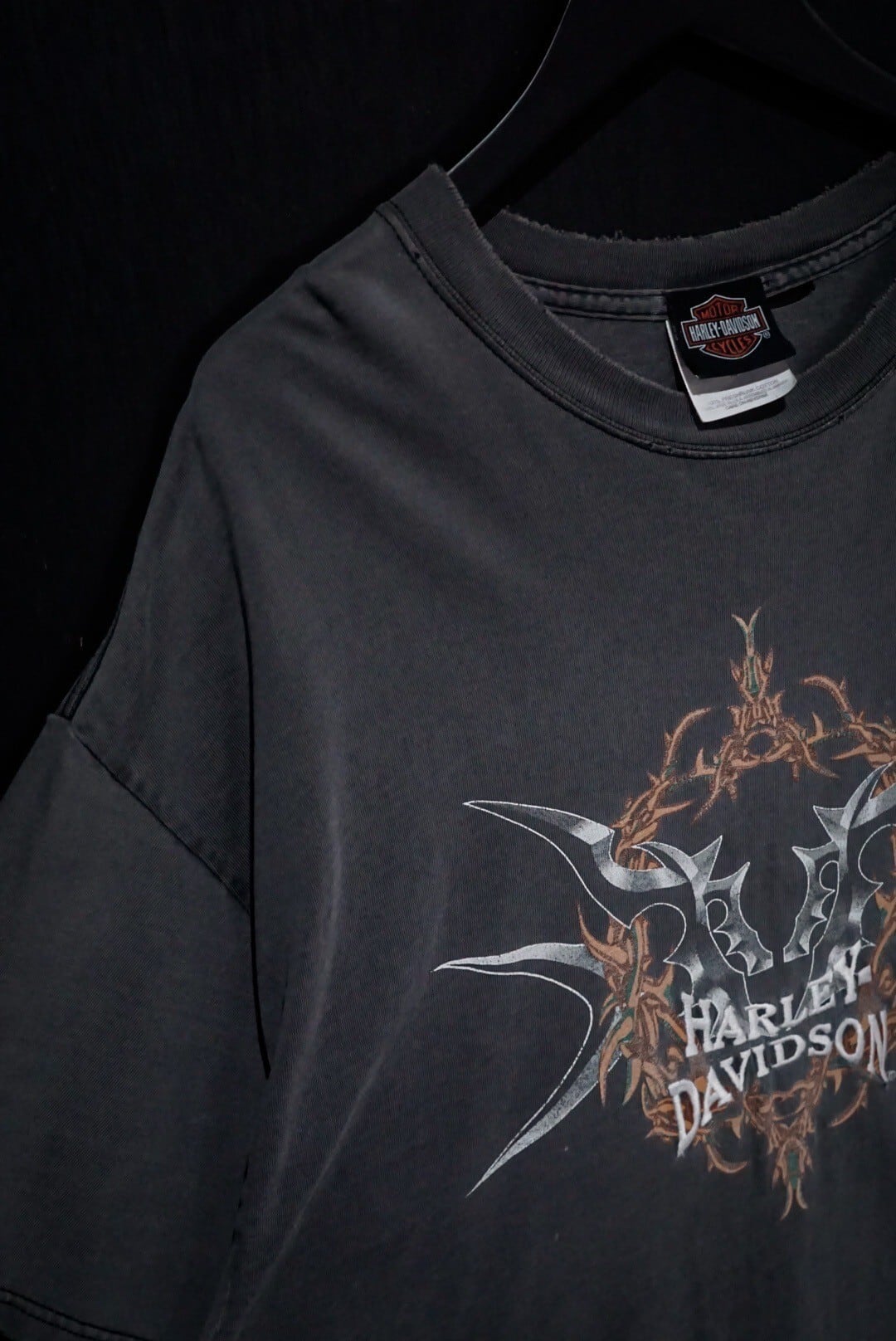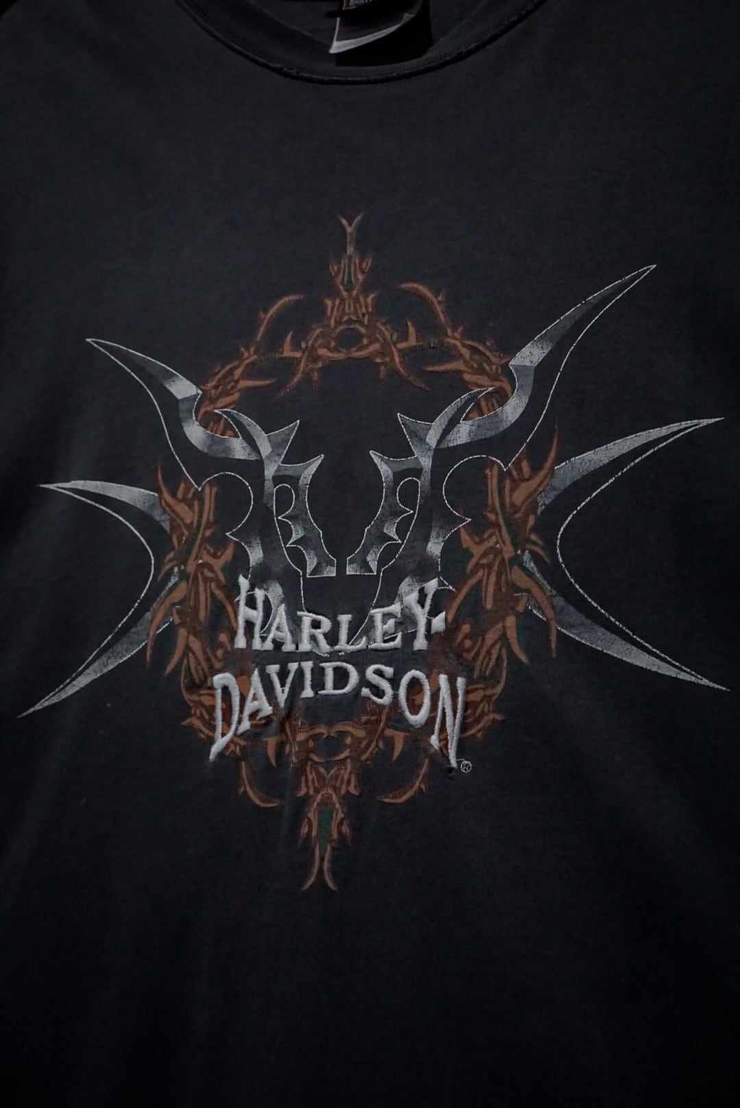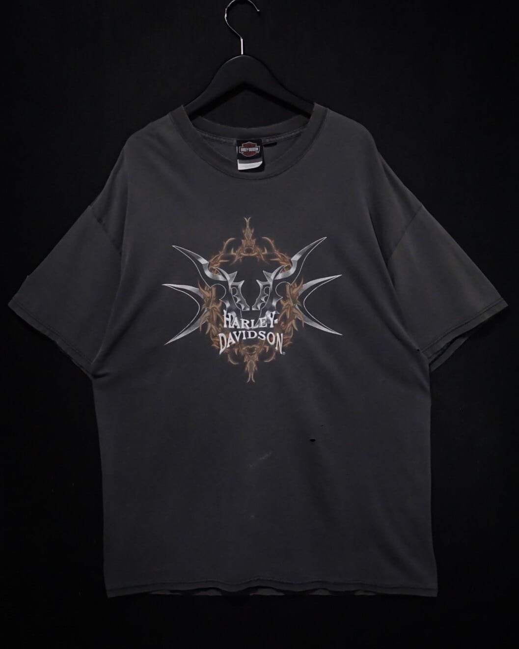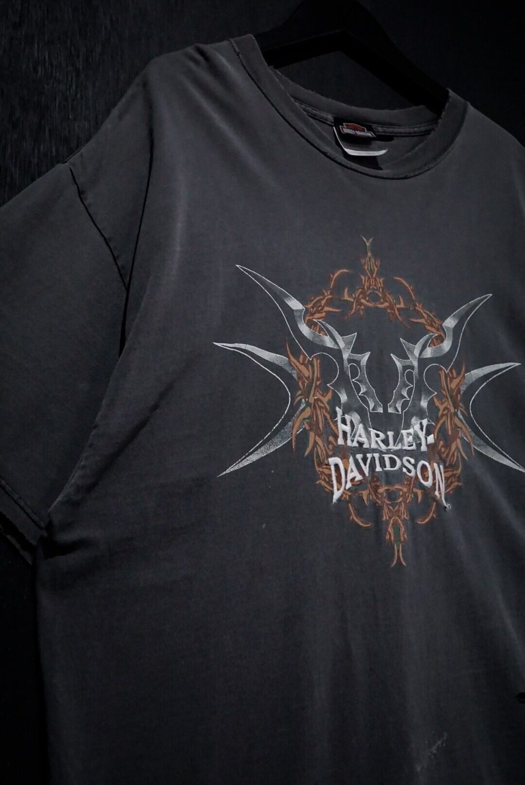 フェードしたブラックのボディをベースに、フロントにトライバル調のアートワーク、ブランドネームをプリントした1着。ハーレーでこのノリのデザイン、珍しいですね。