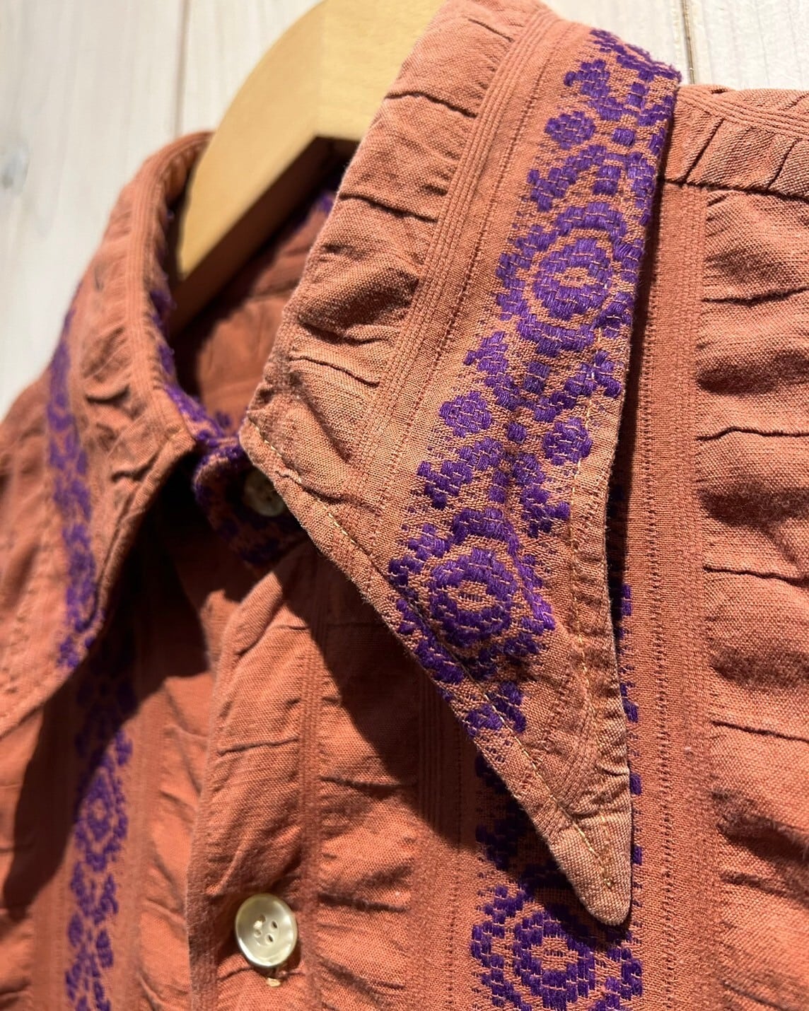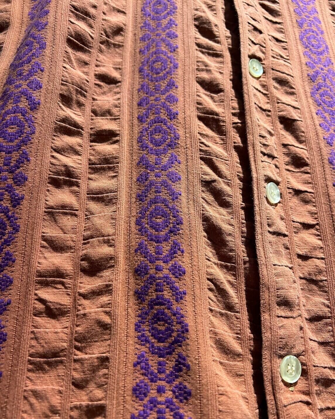 肌触りの良いコットンを用いたボディに、エスニックなフレーバーを漂わせる刺繍をストライプ状に刻んだ70'sの長袖シャツ。
