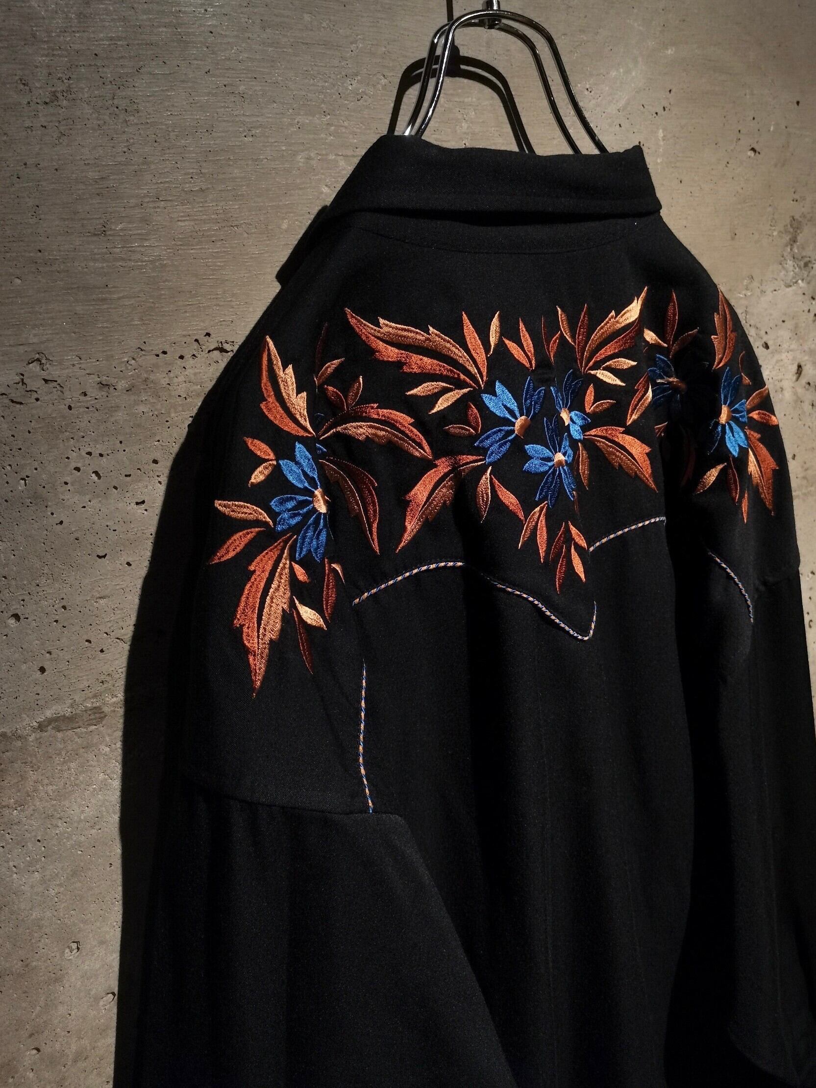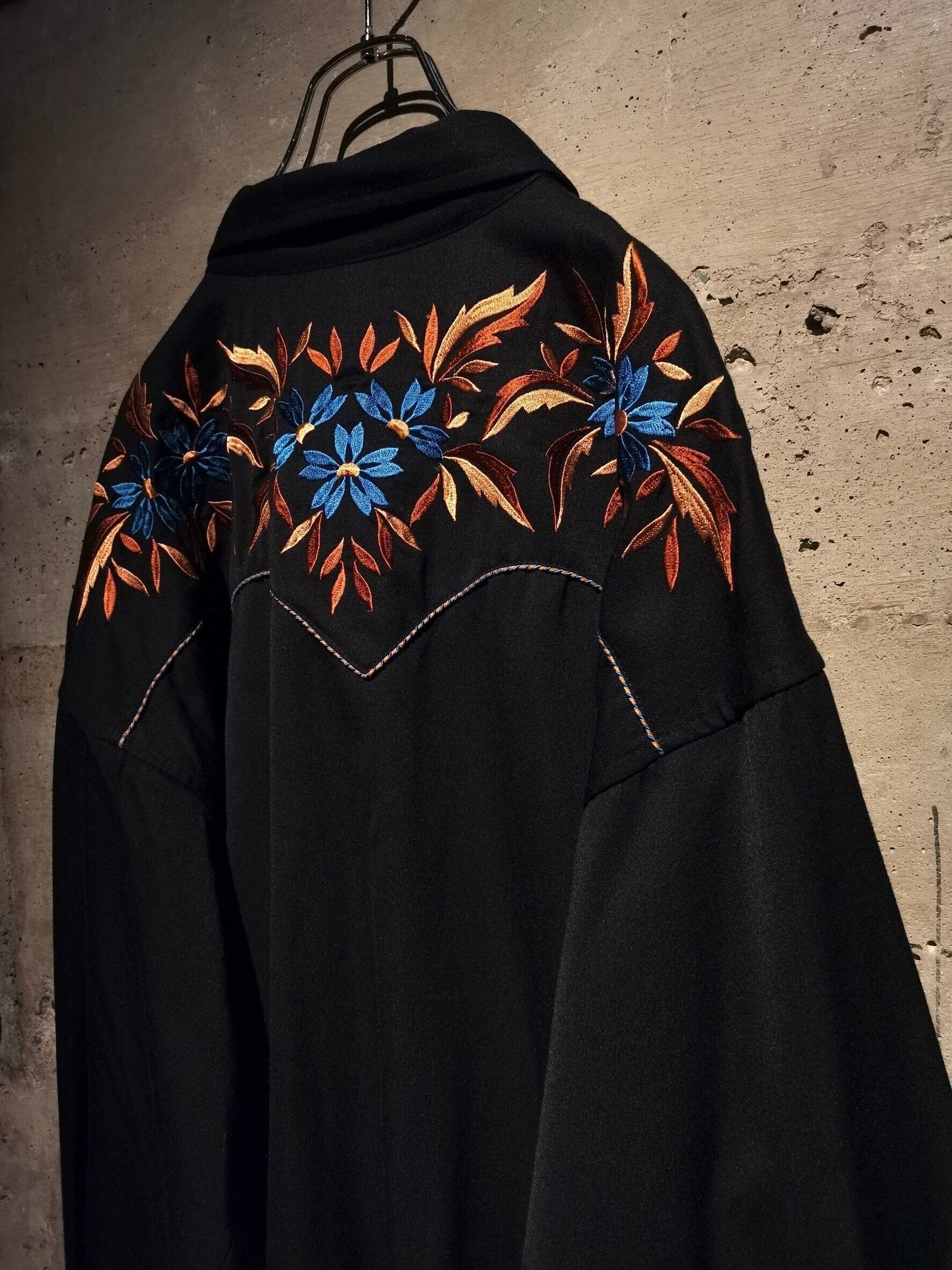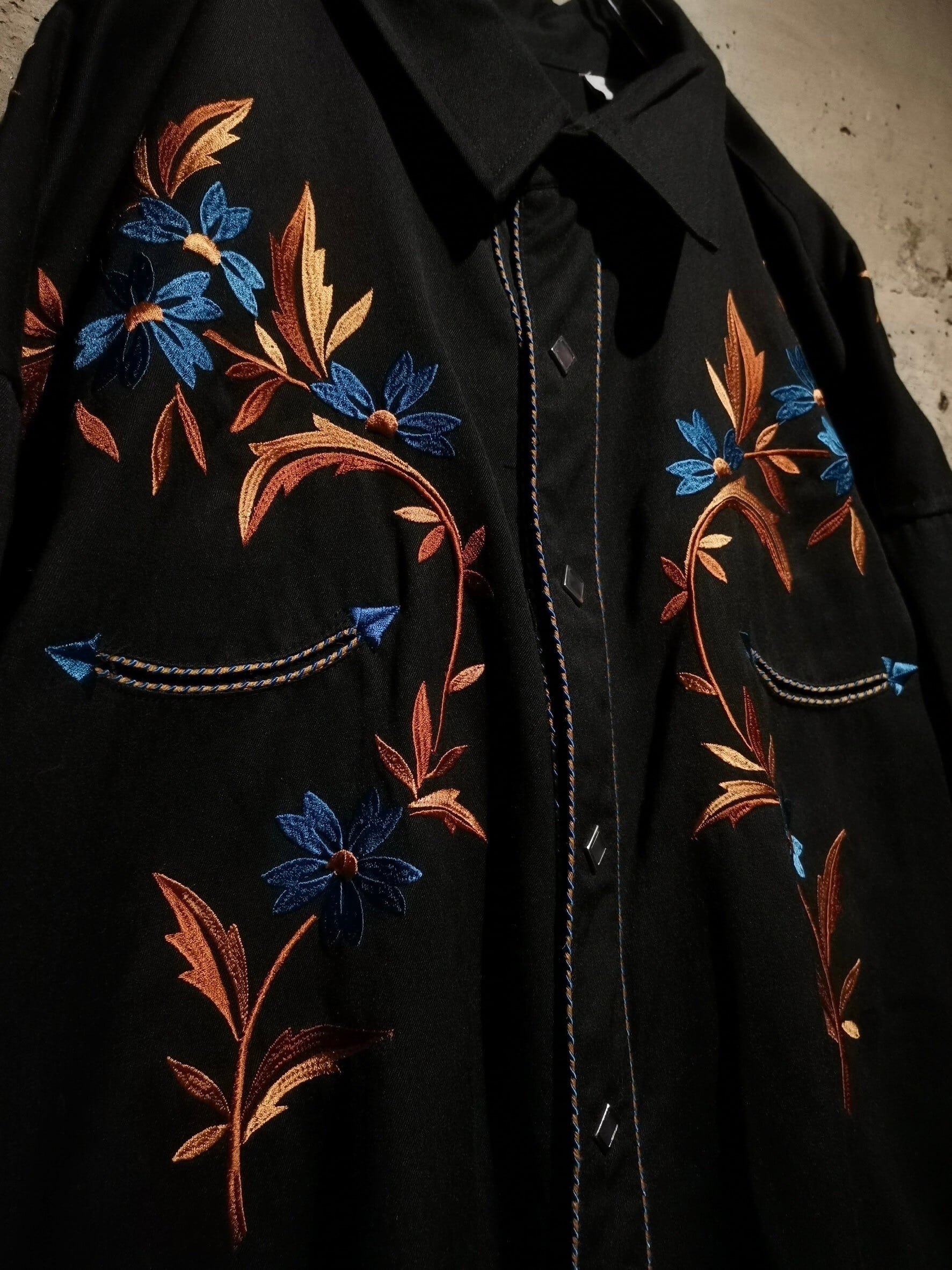 柔らかく、コシのある上質なブラックボディに、オレンジ×ブルーのカラーリングで美しい花の刺繍を刻んだウエスタンシャツ。