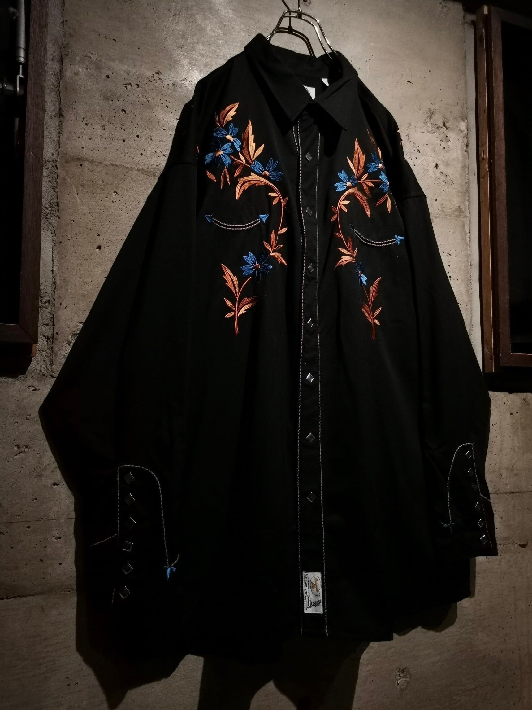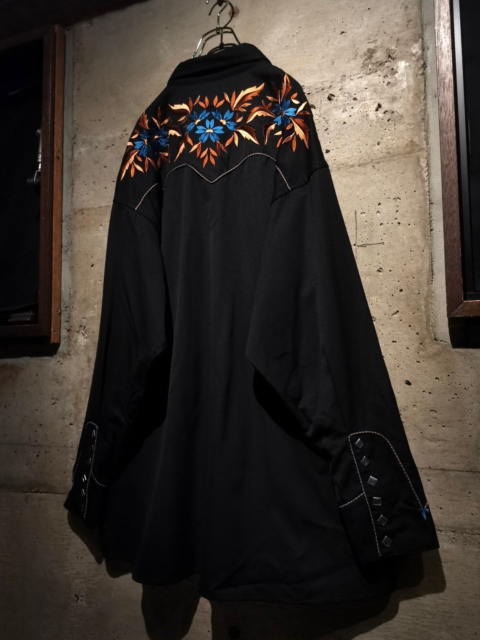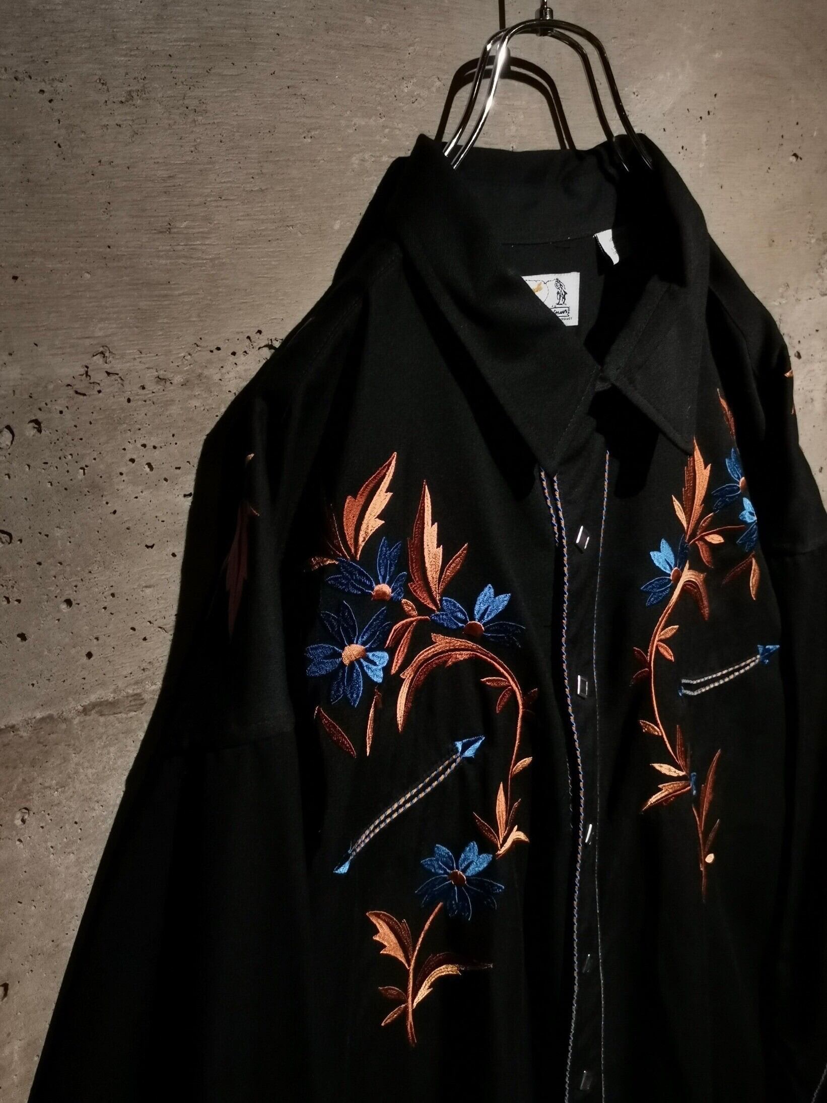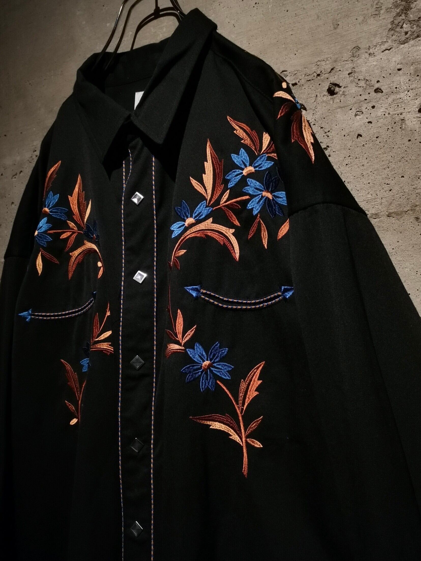 柔らかく、コシのある上質なブラックボディに、オレンジ×ブルーのカラーリングで美しい花の刺繍を刻んだウエスタンシャツ。