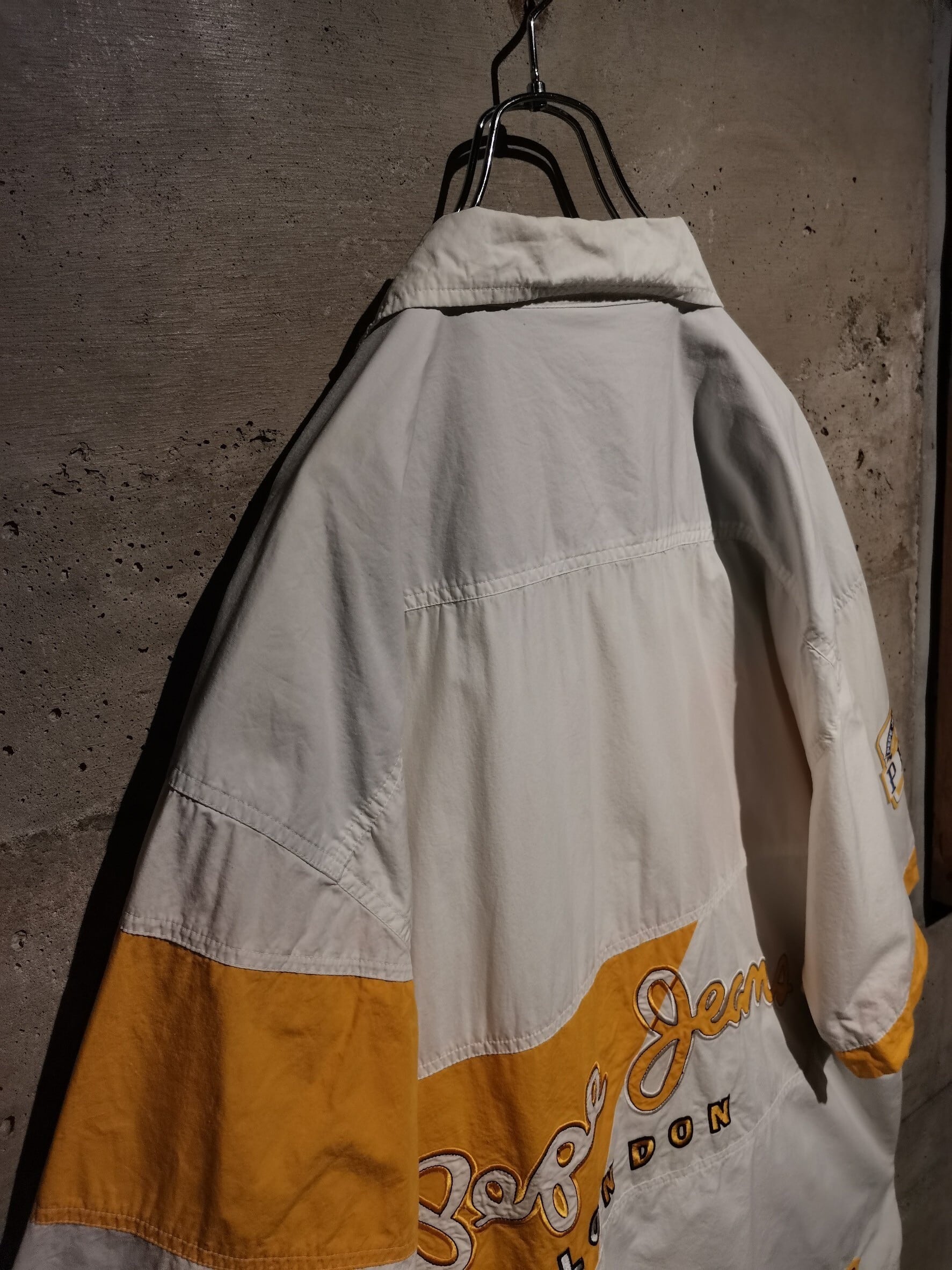 ホワイトをベースに、鮮やかなイエローのカラーリングで巧みに切り替え。身頃や袖、背面にブランドロゴを刺繍やパッチで表現した半袖シャツジャケット。