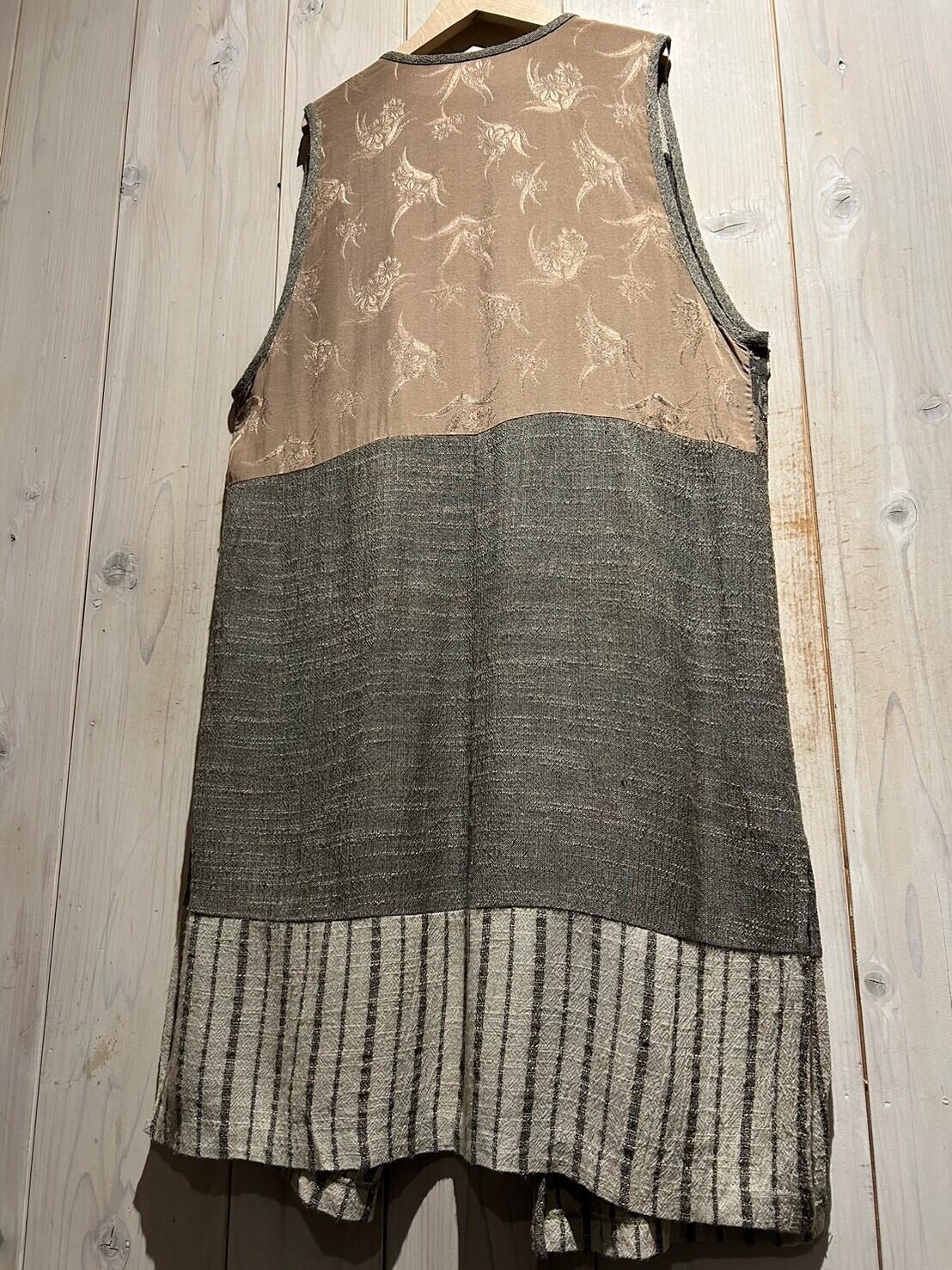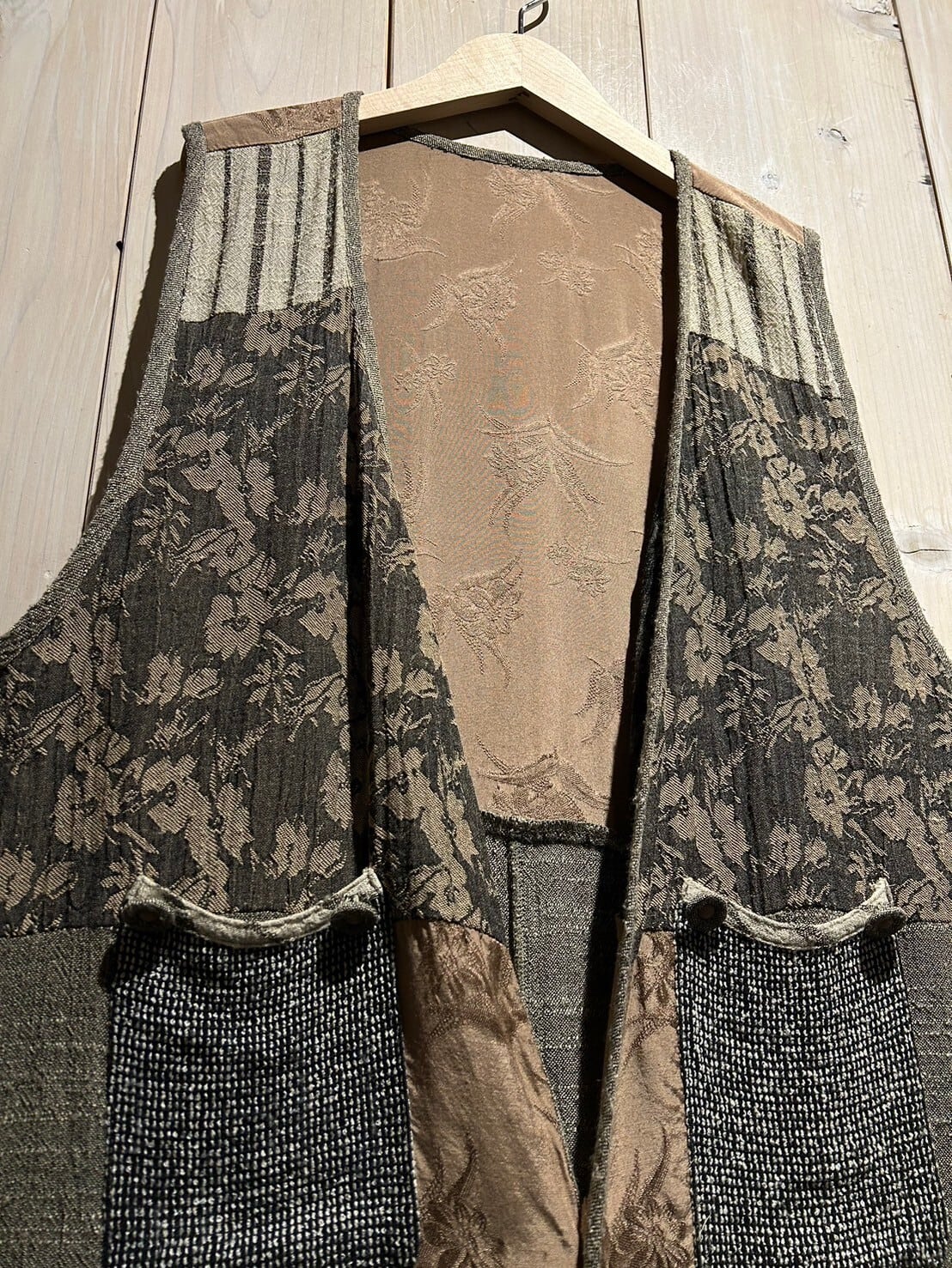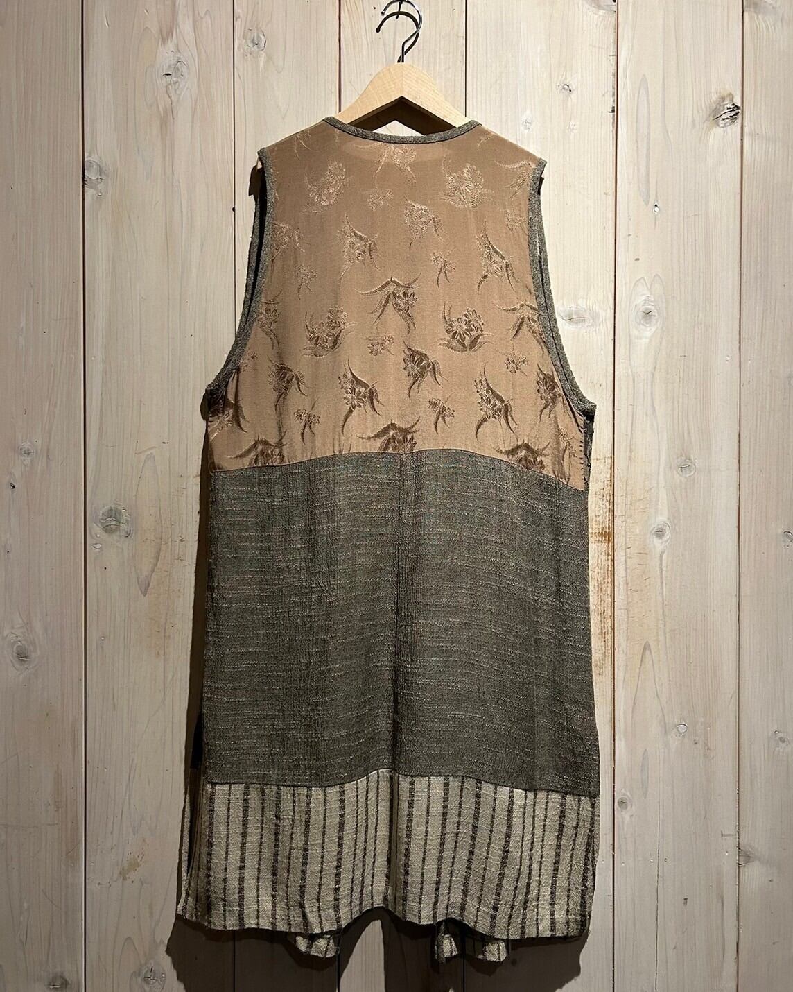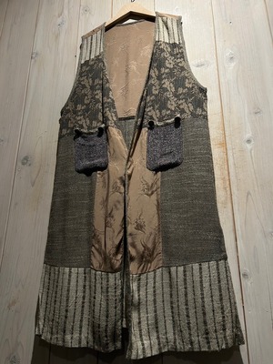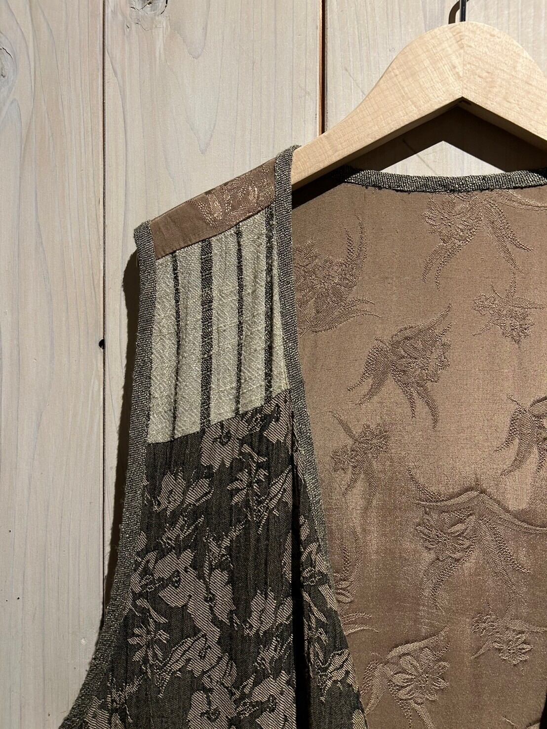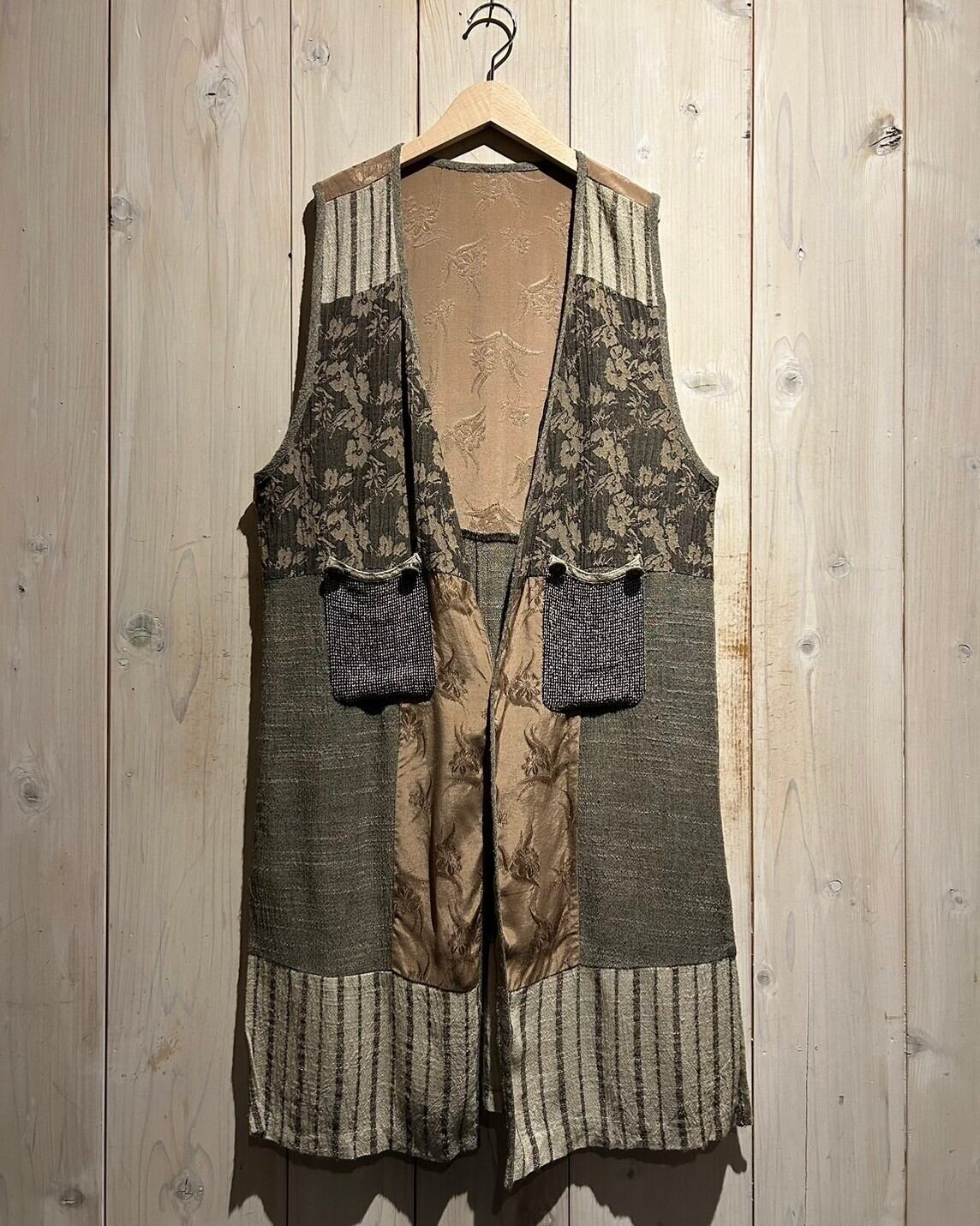 花やストライプなどを織りで表現した、様々な生地を用いてパッチワークで仕上げたロングベスト。