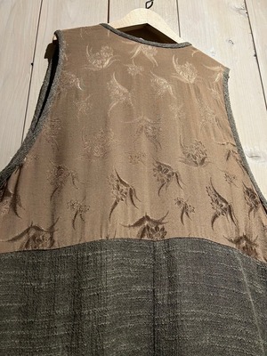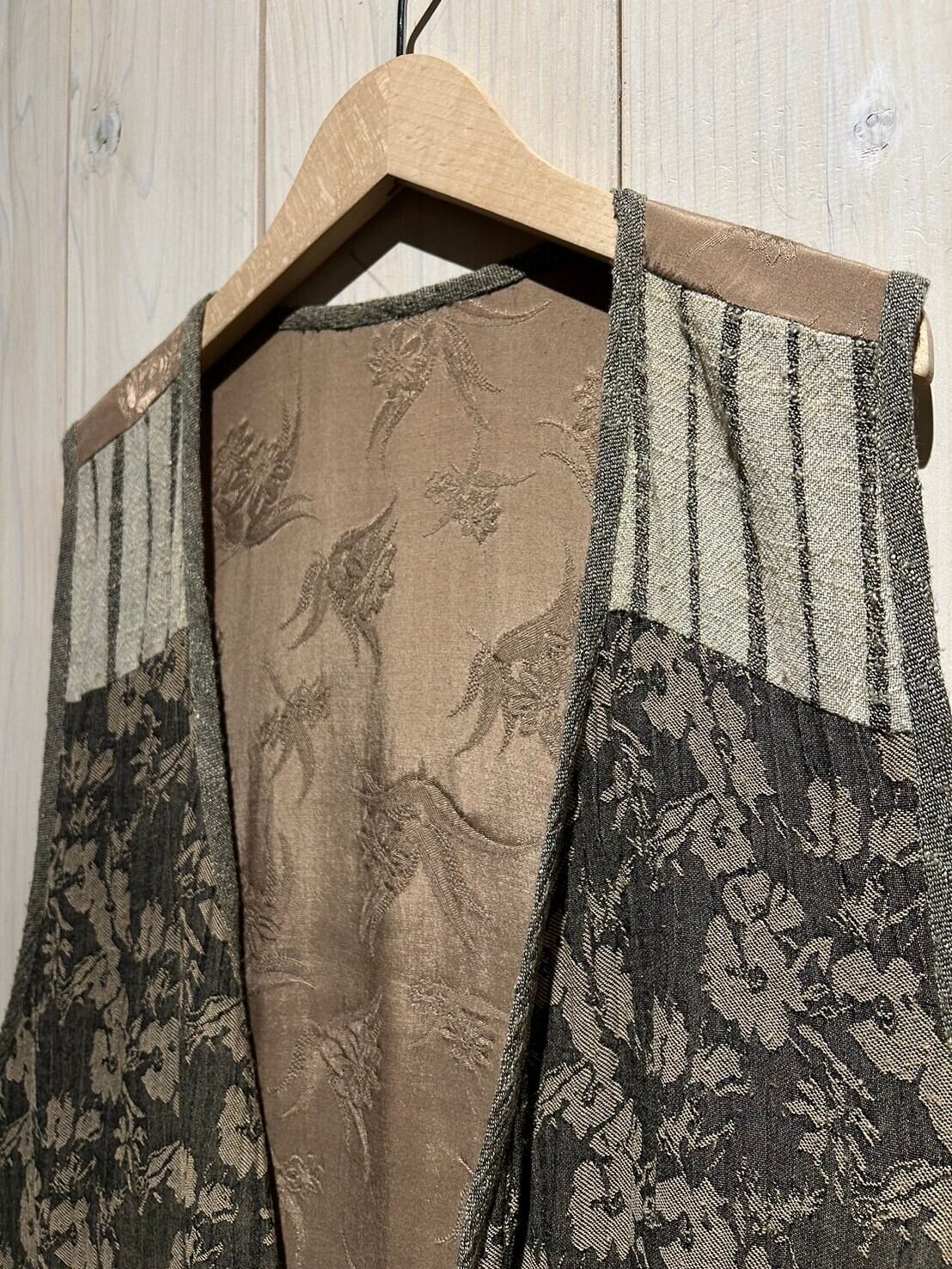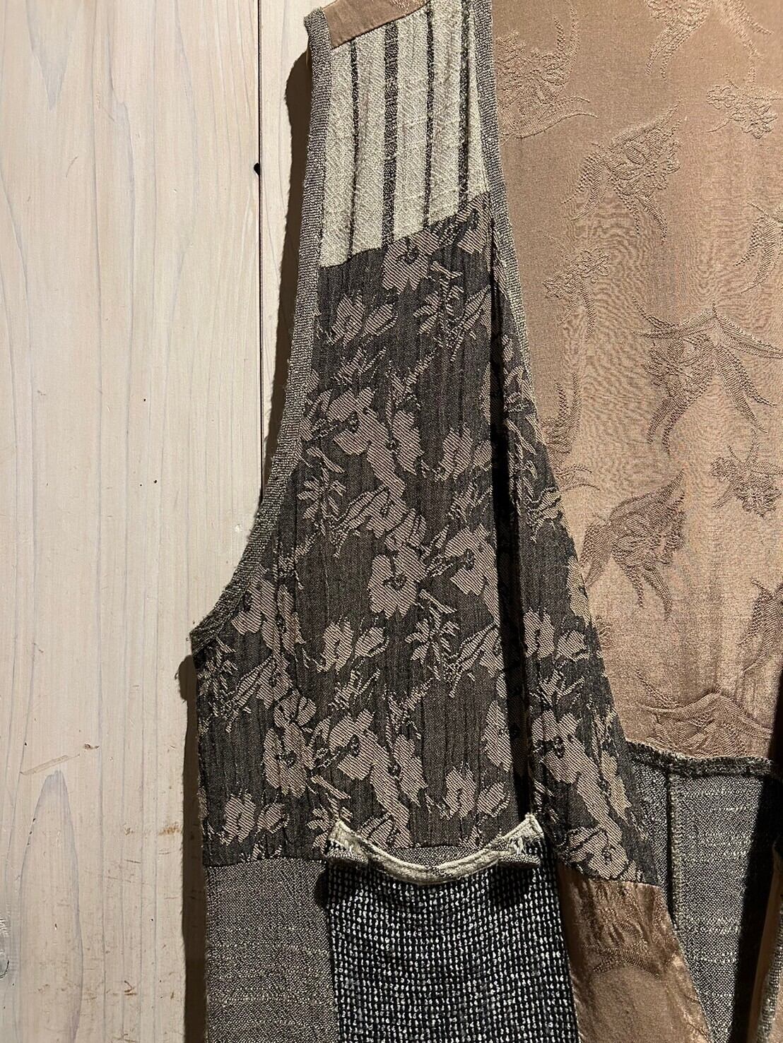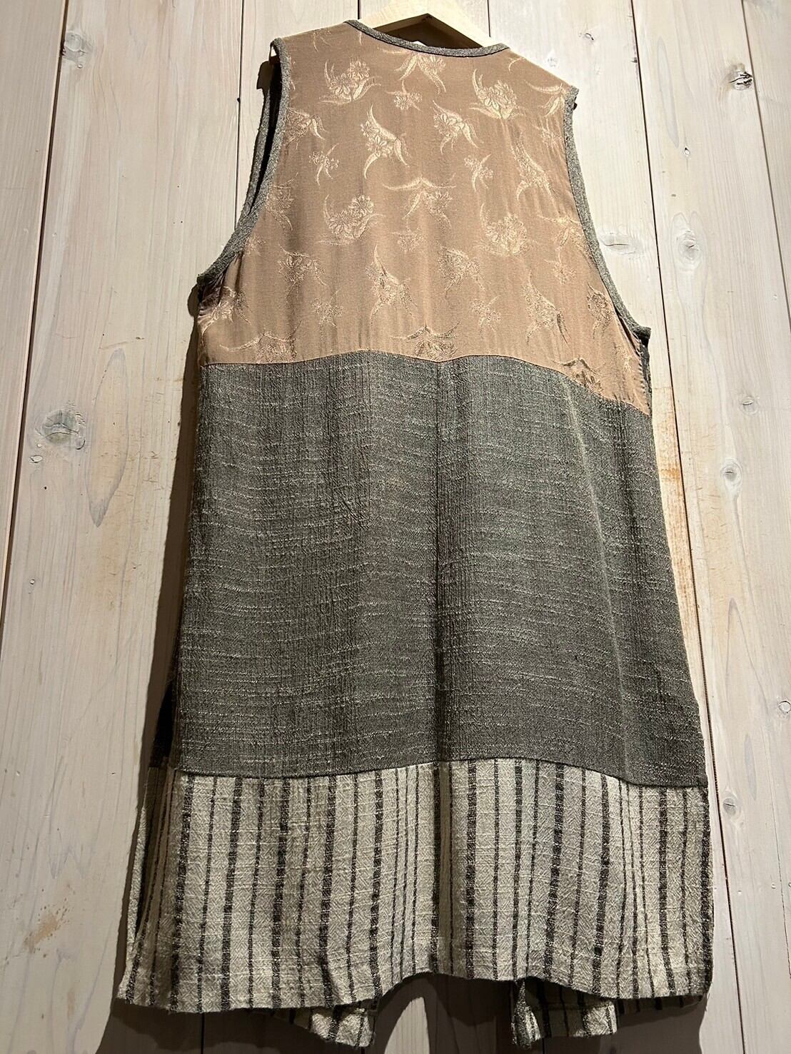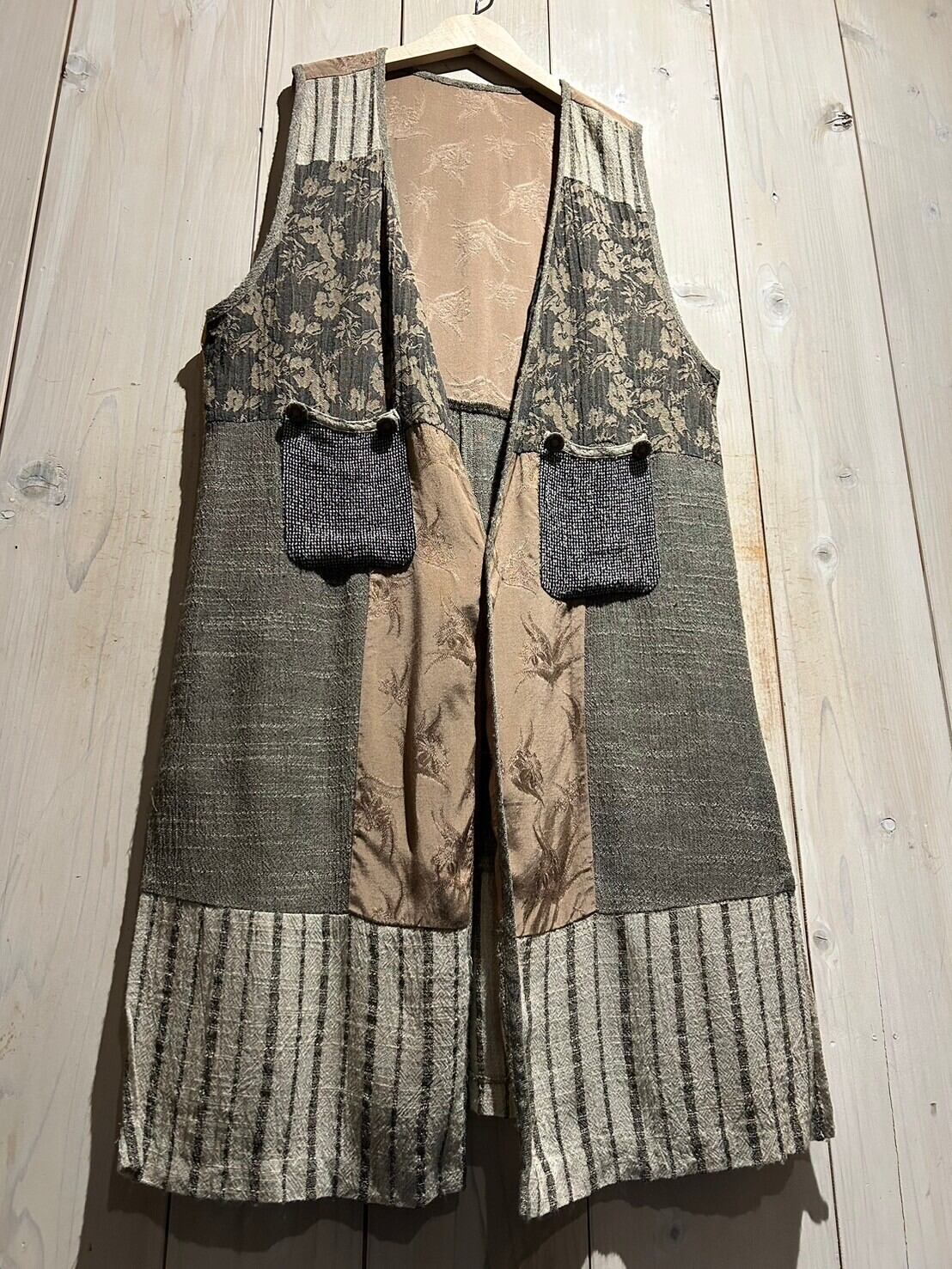 花やストライプなどを織りで表現した、様々な生地を用いてパッチワークで仕上げたロングベスト。