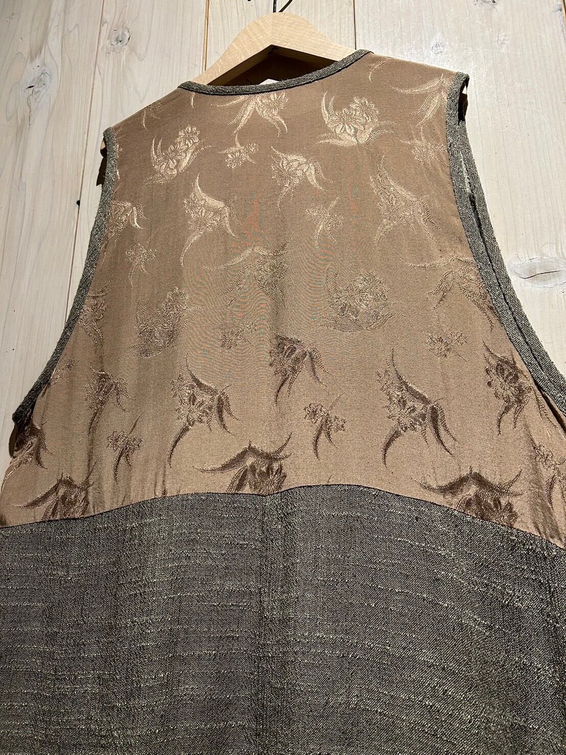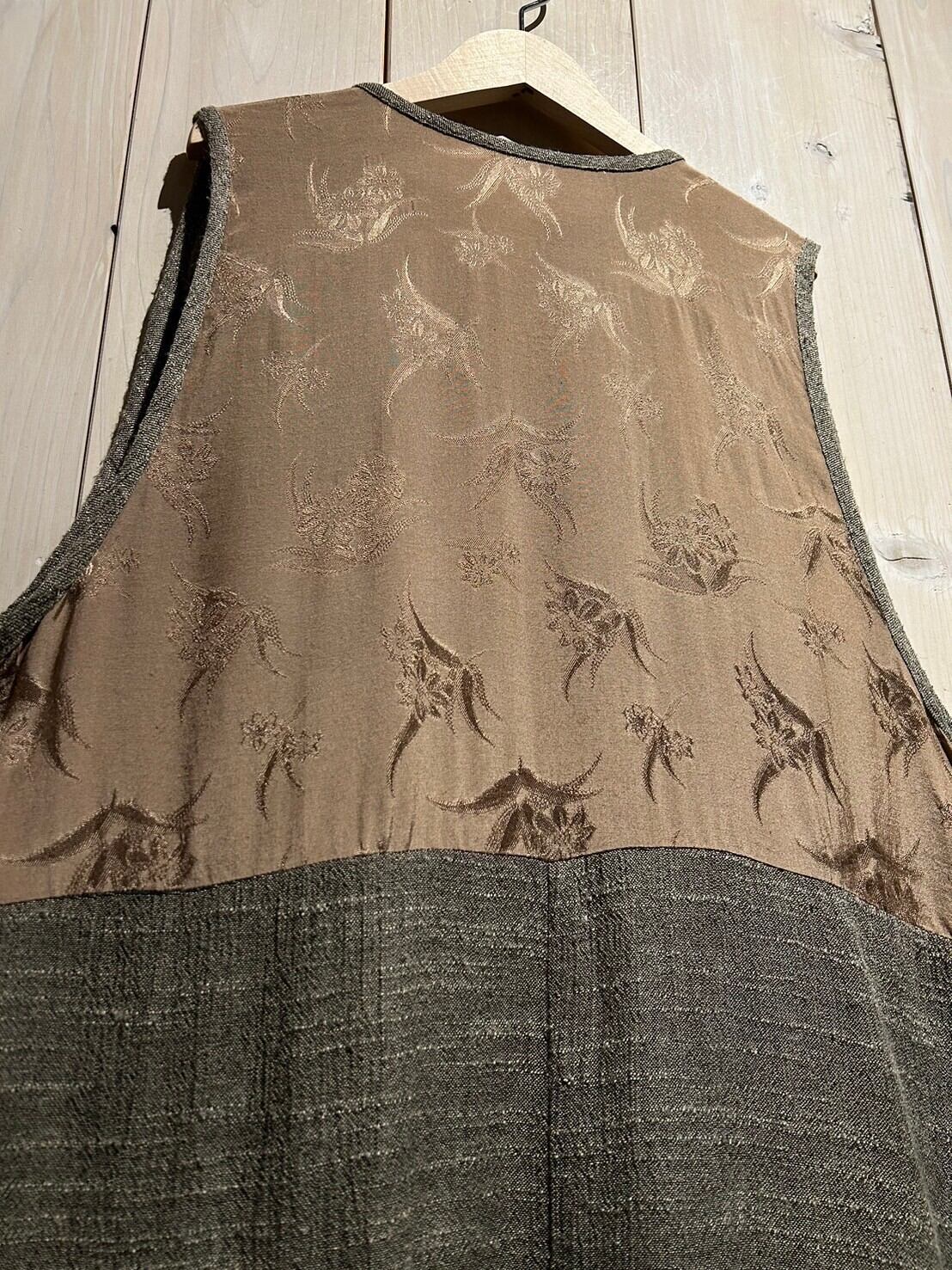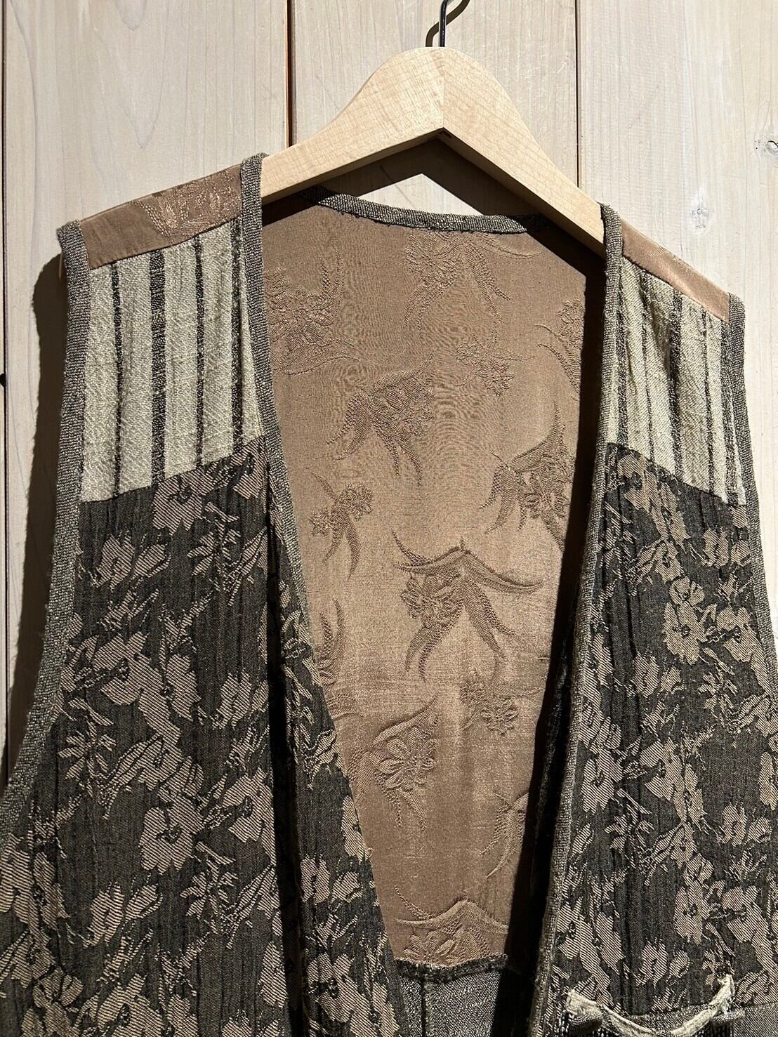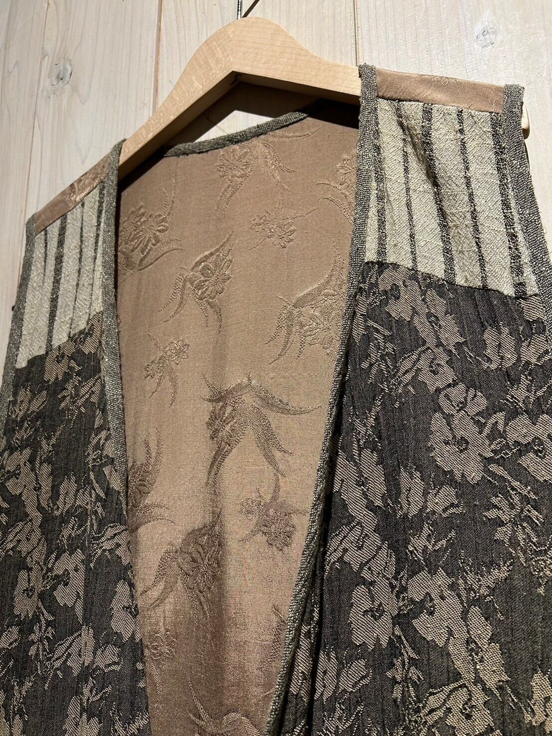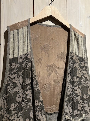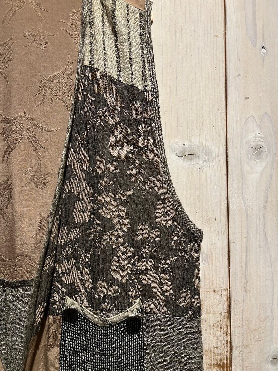 花やストライプなどを織りで表現した、様々な生地を用いてパッチワークで仕上げたロングベスト。