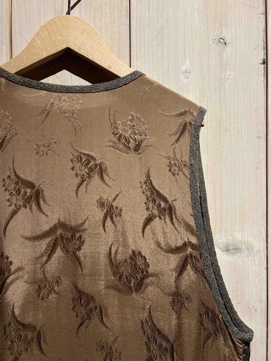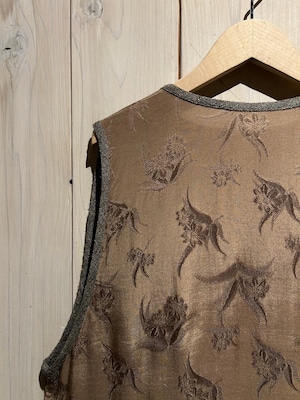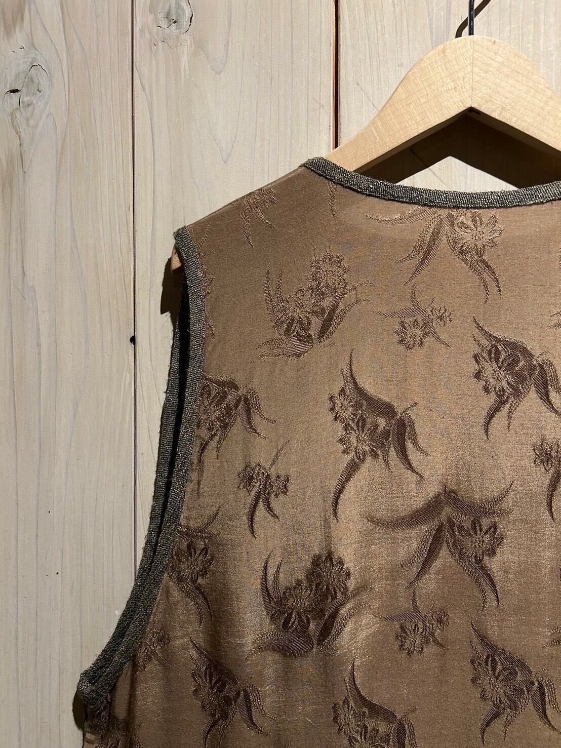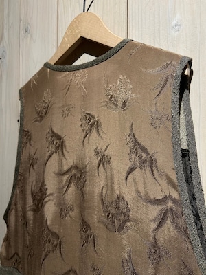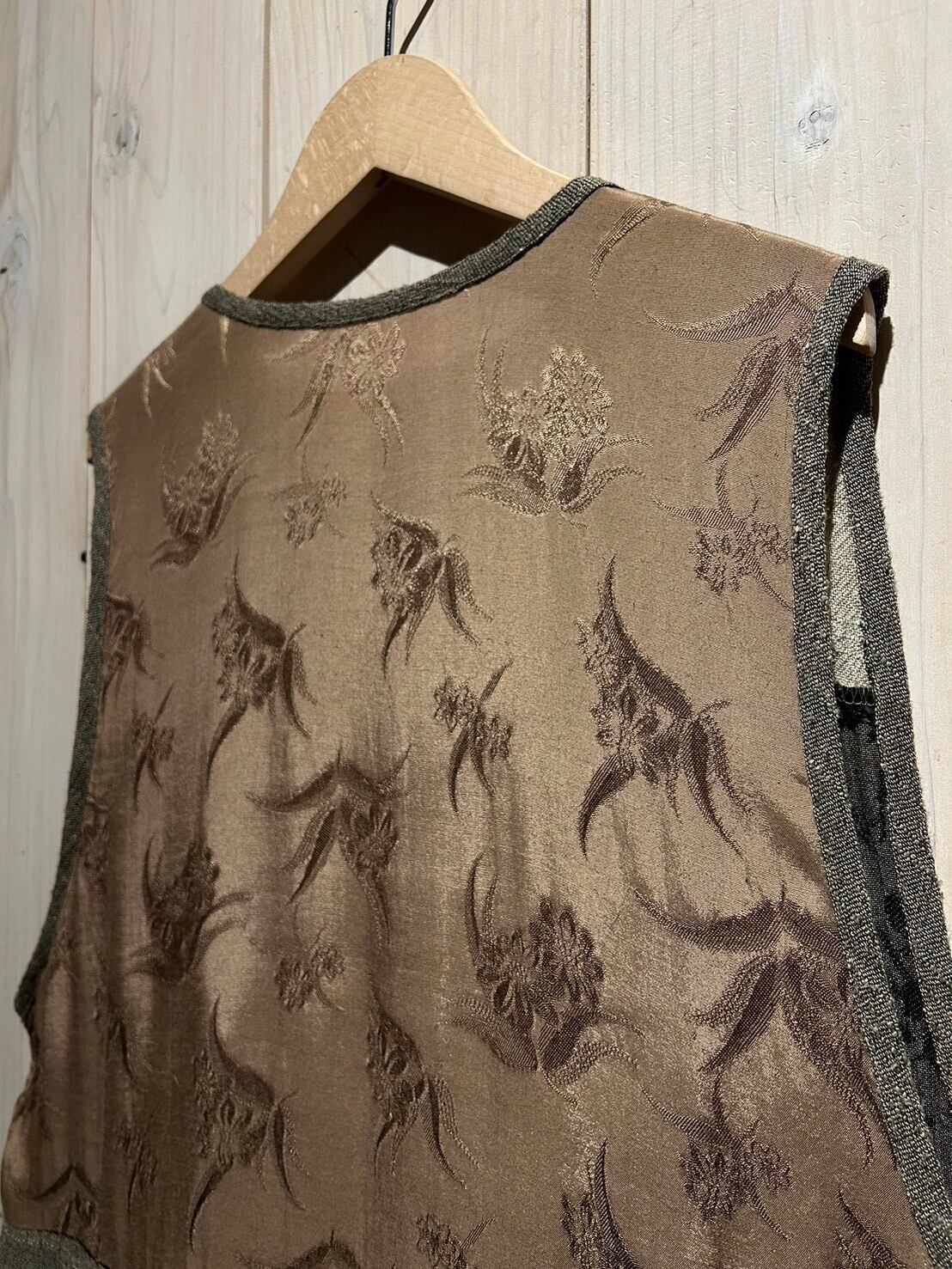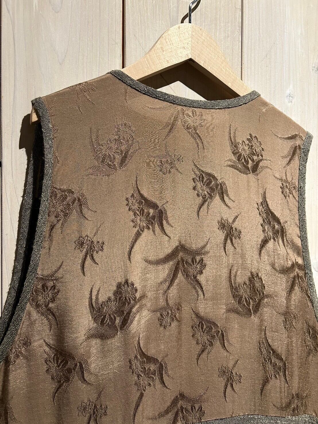 花やストライプなどを織りで表現した、様々な生地を用いてパッチワークで仕上げたロングベスト。