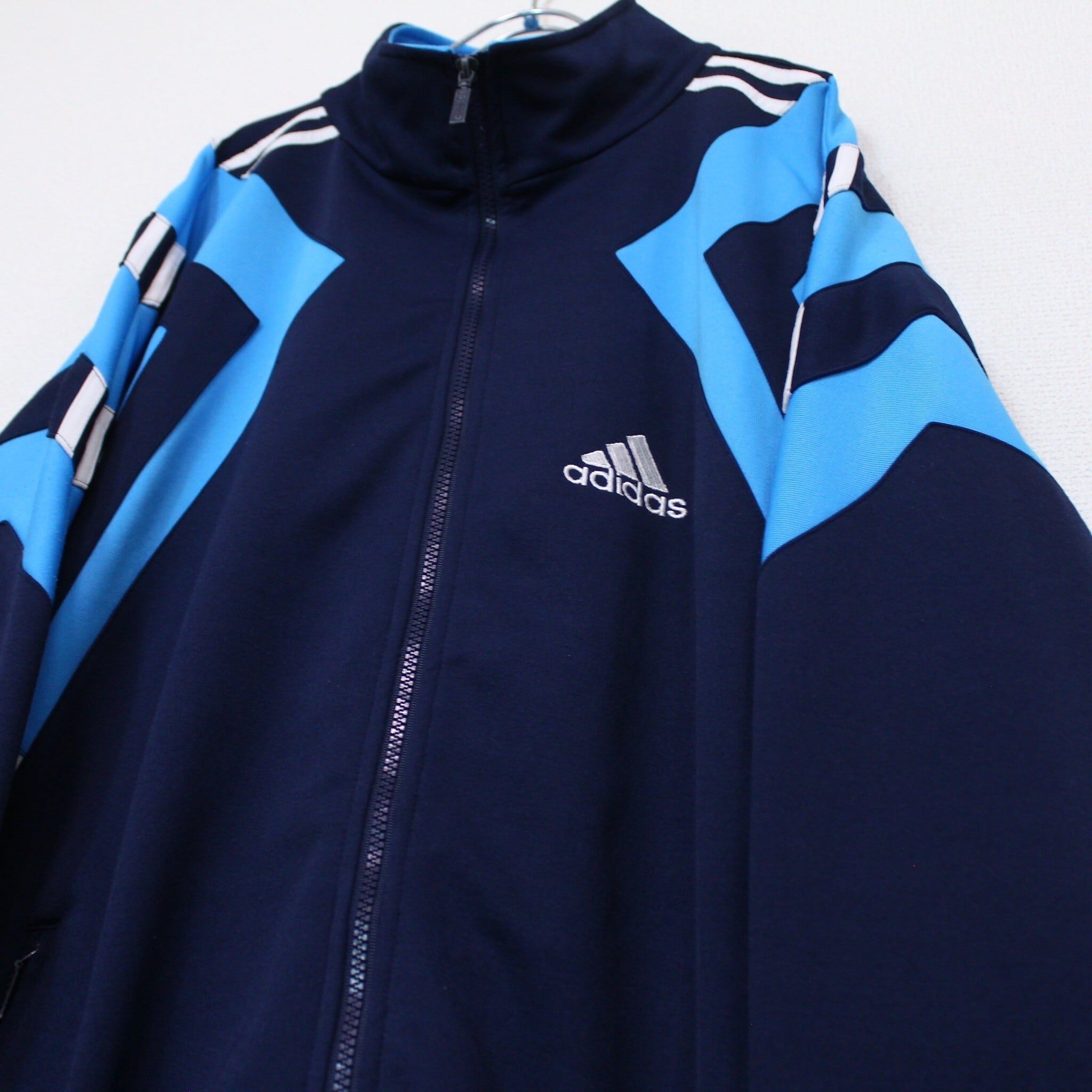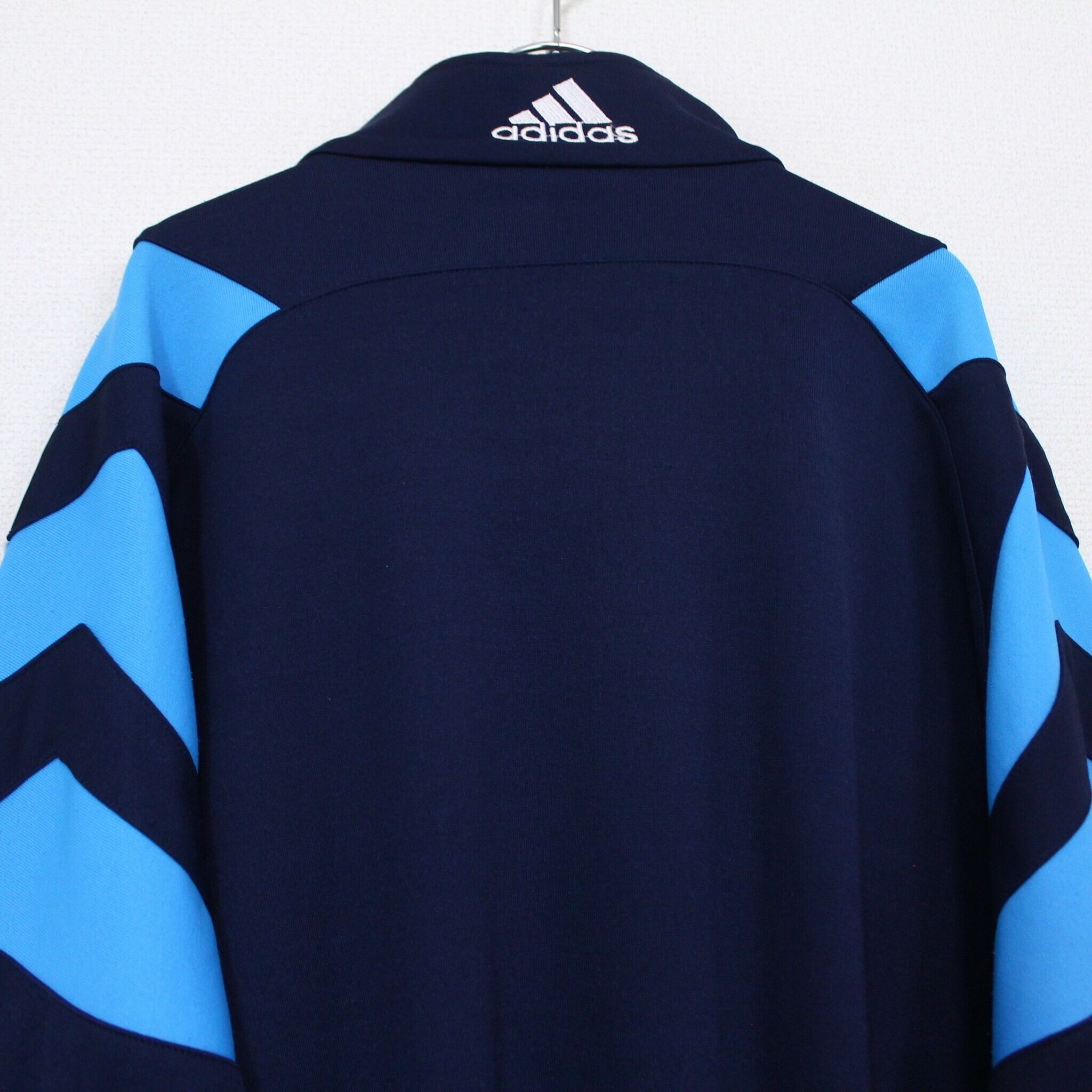 ネイビーのボディをベースに、肩周りに3ストライプス、さらに幾何学的に水色のラインを重ねたこの年代らしいデザインが光る1着。