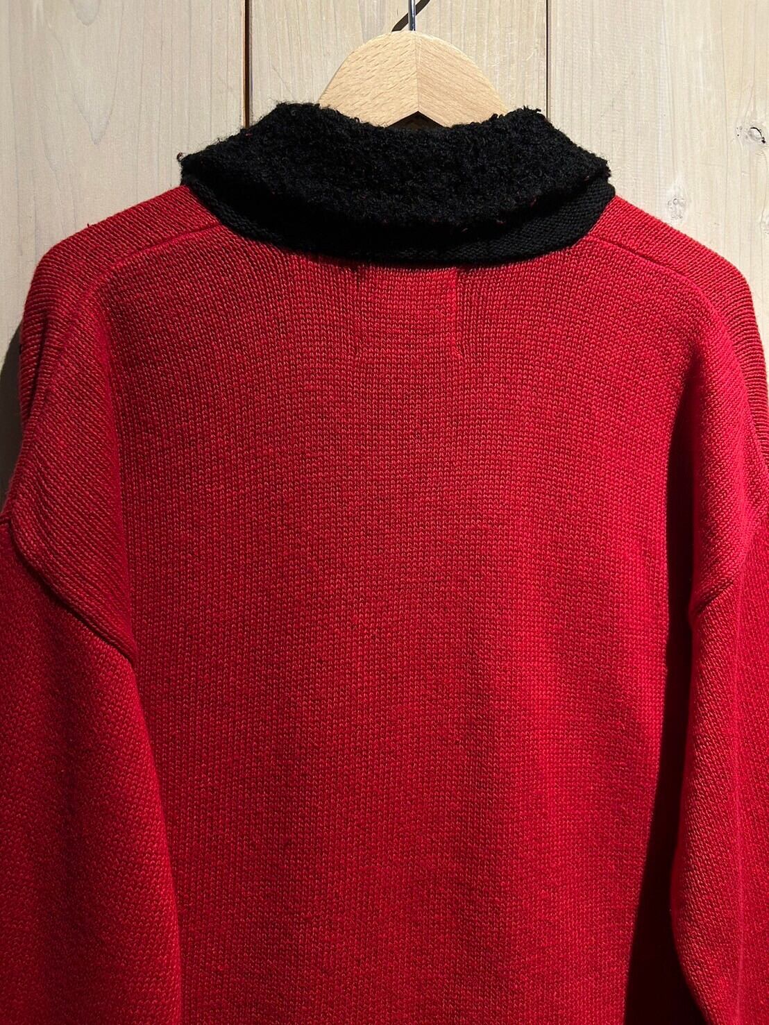 真紅のボディに、猫が虎視眈々とネズミを狙う様子をデザインに落とし込んだ面白味のあるニットジャケット。