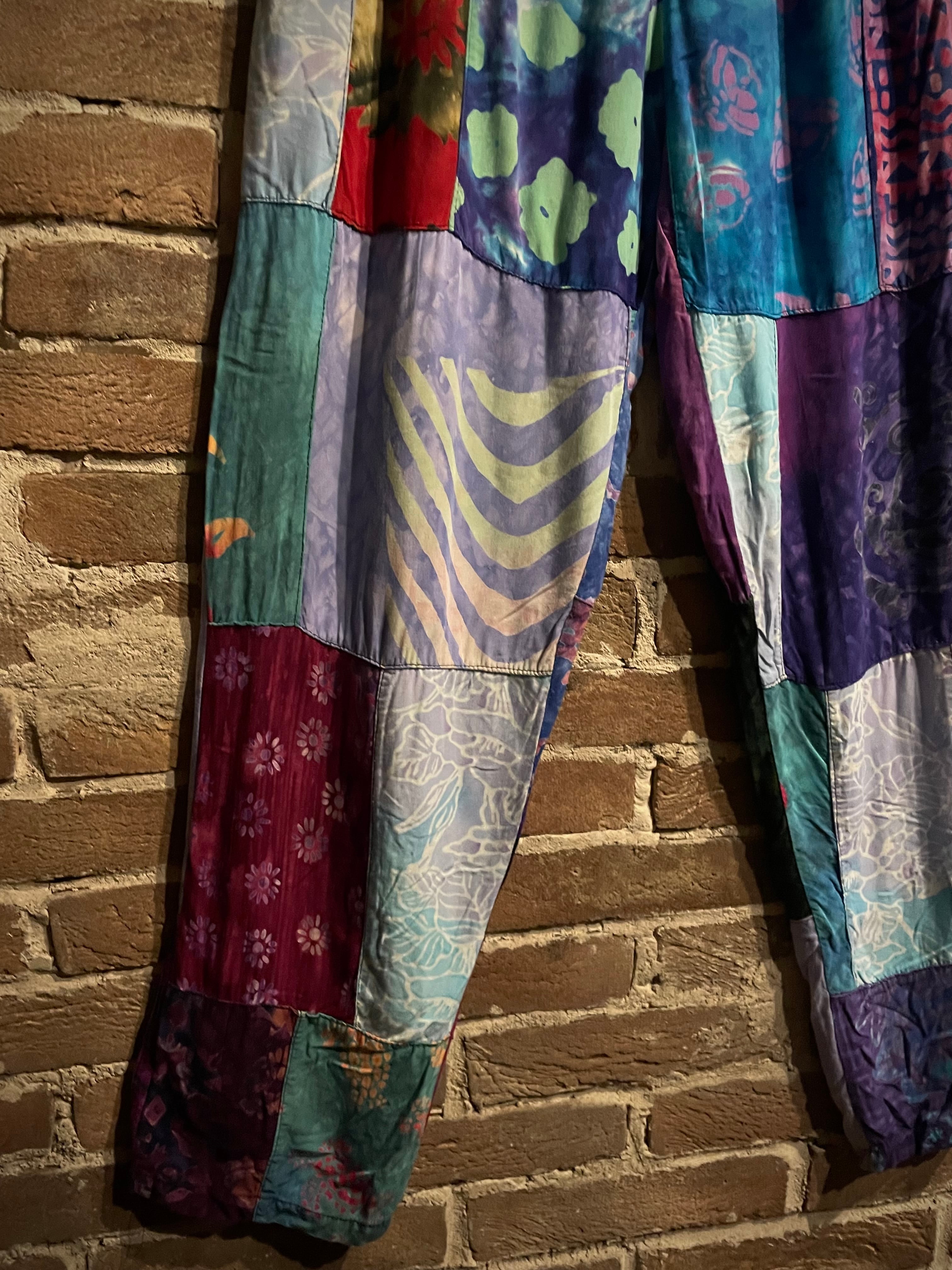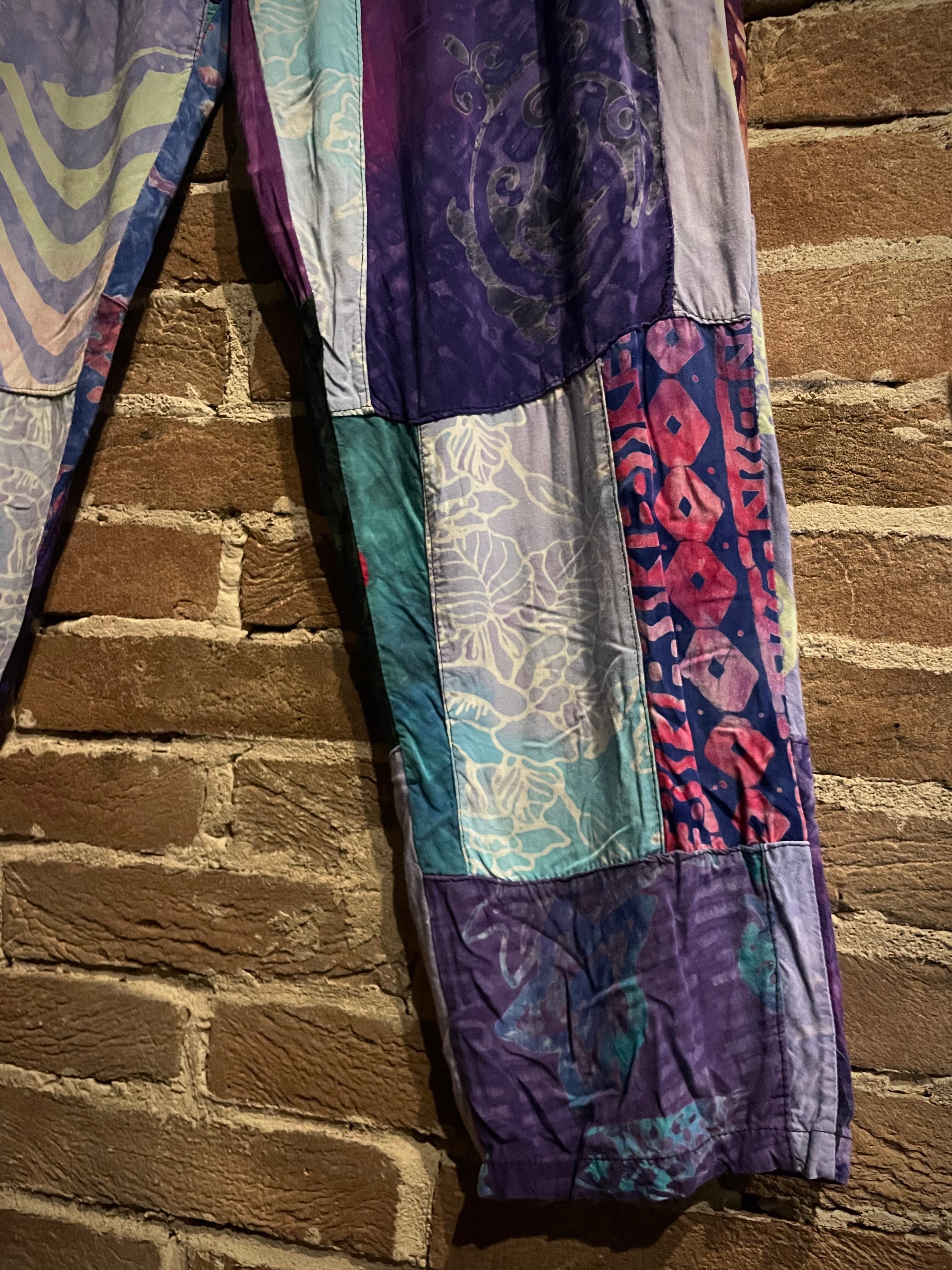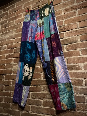染めを施した生地や、民族柄をランダムにパッチワークで切り替えたイージーパンツ。