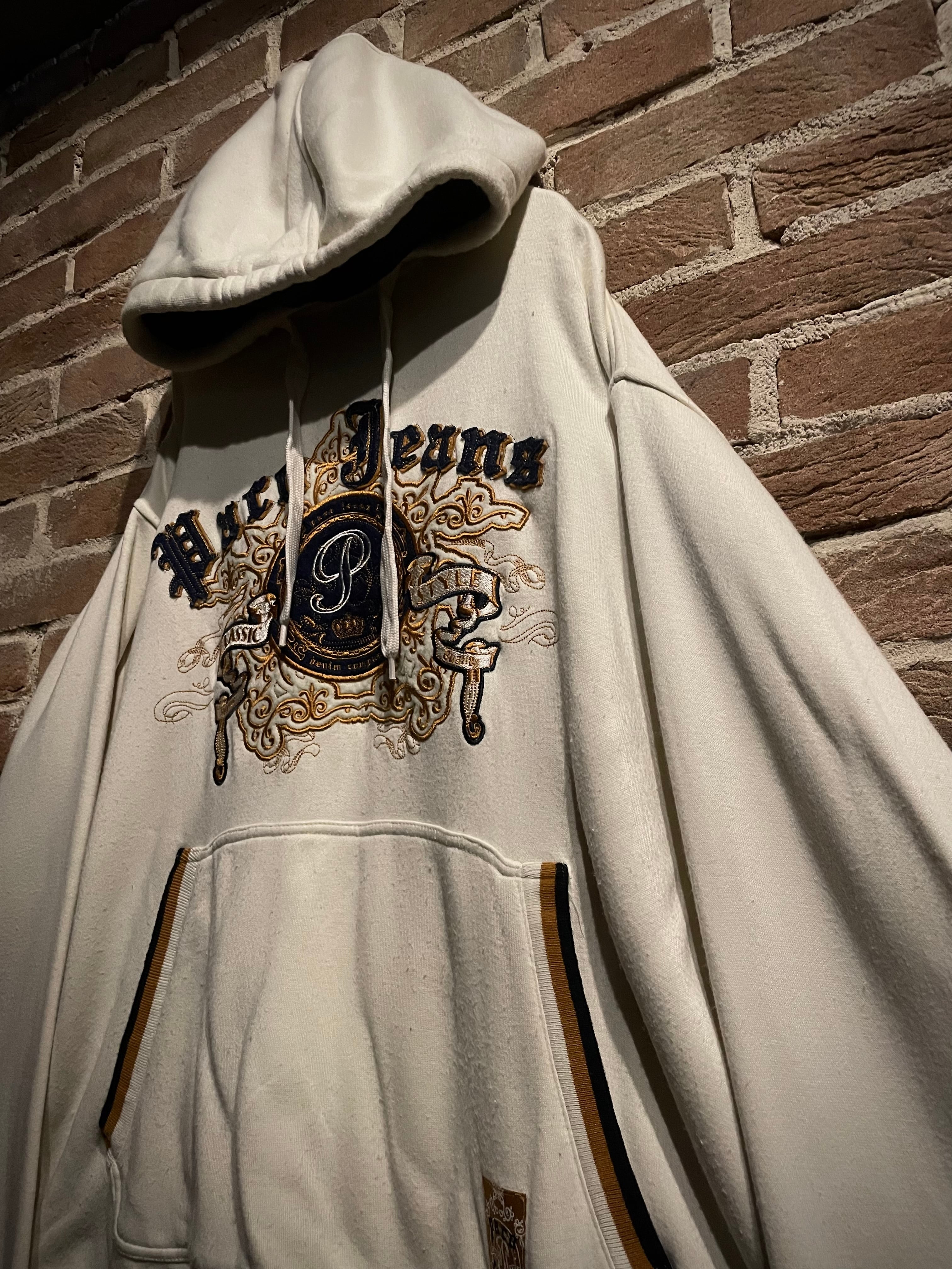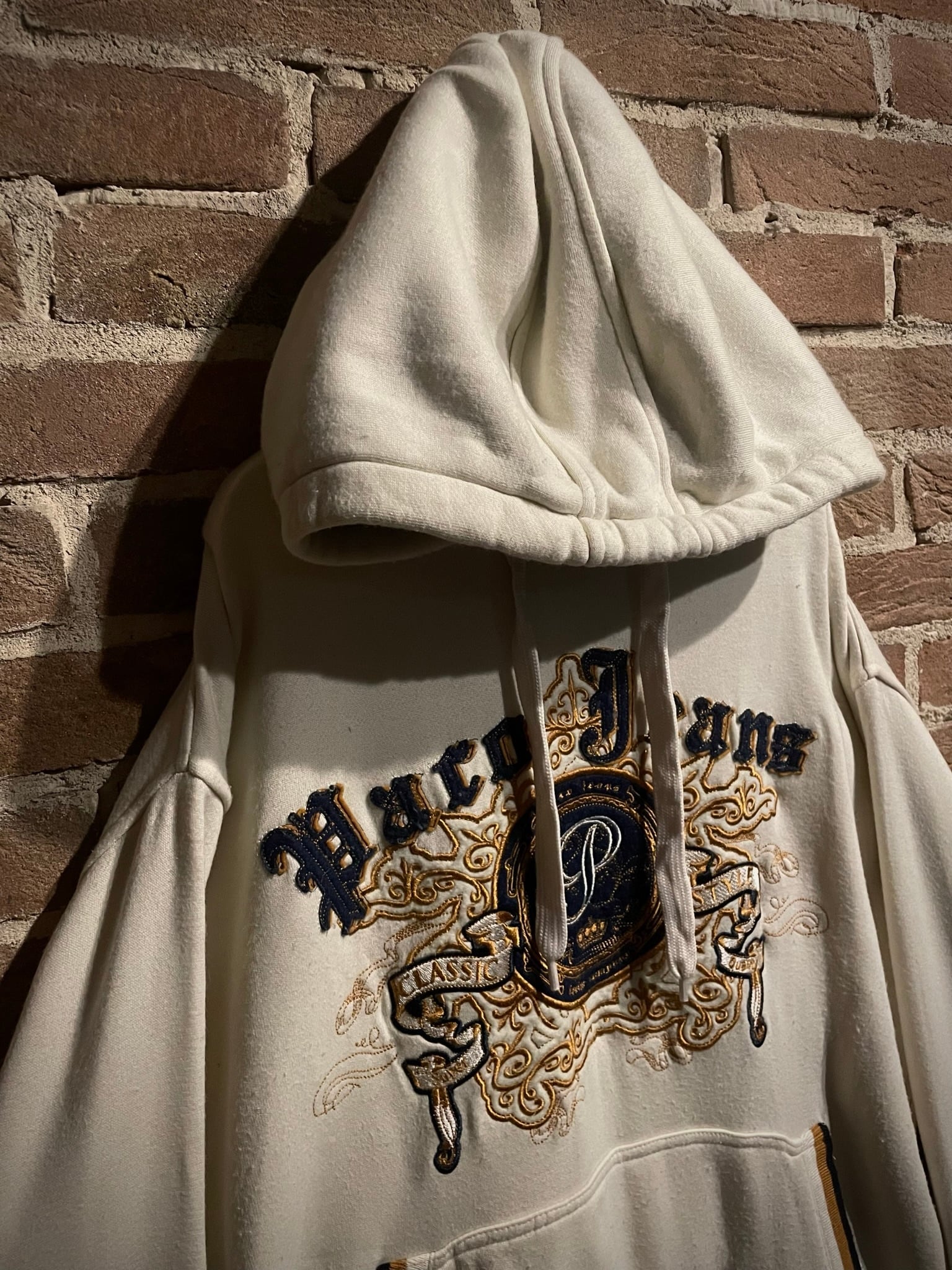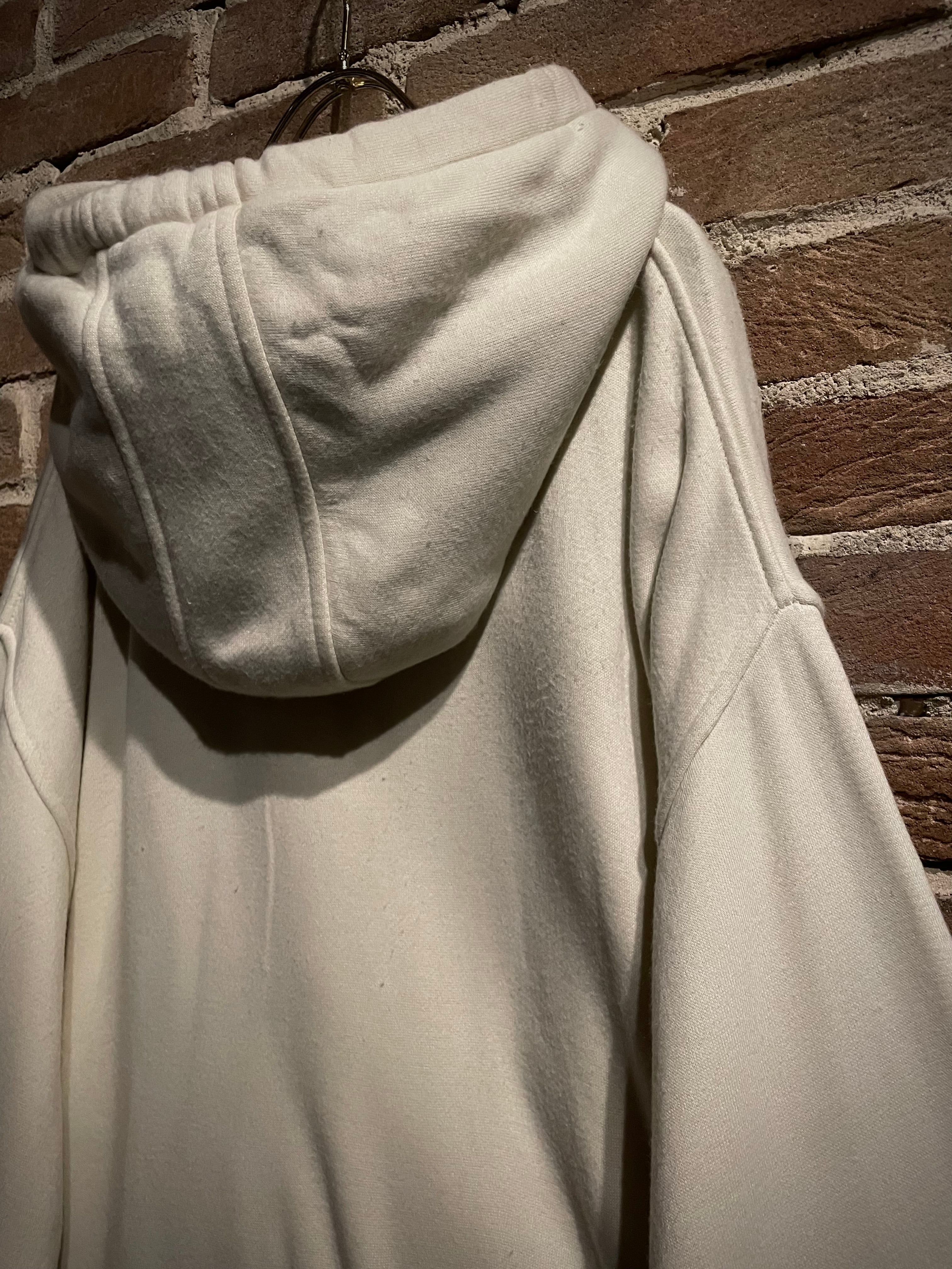 肉感のあるホワイトのボディに、当時のストリート感をヒシヒシと感じられるタッチでブランドネームの刺繍、ワッペンを載せたフーディ。