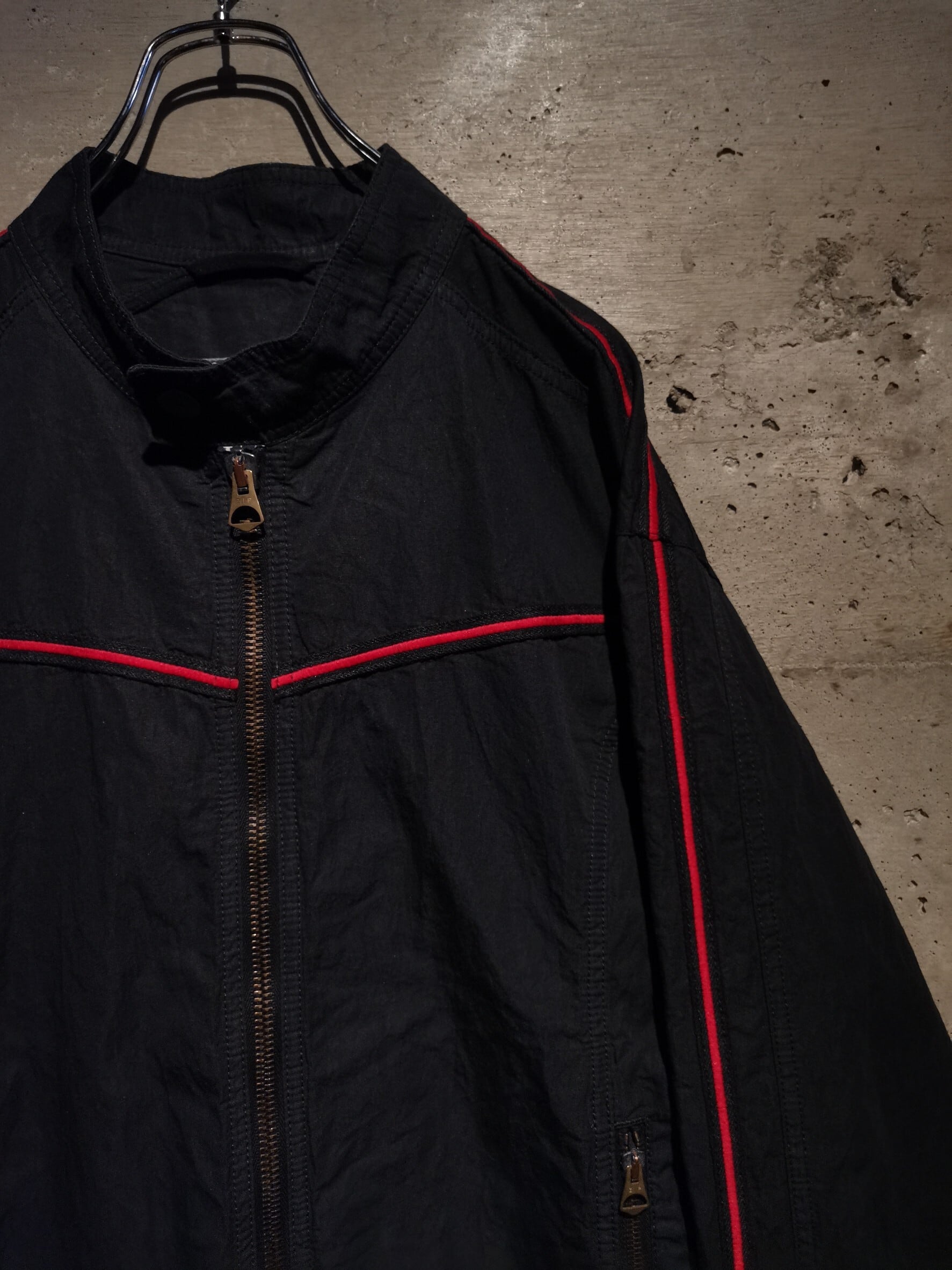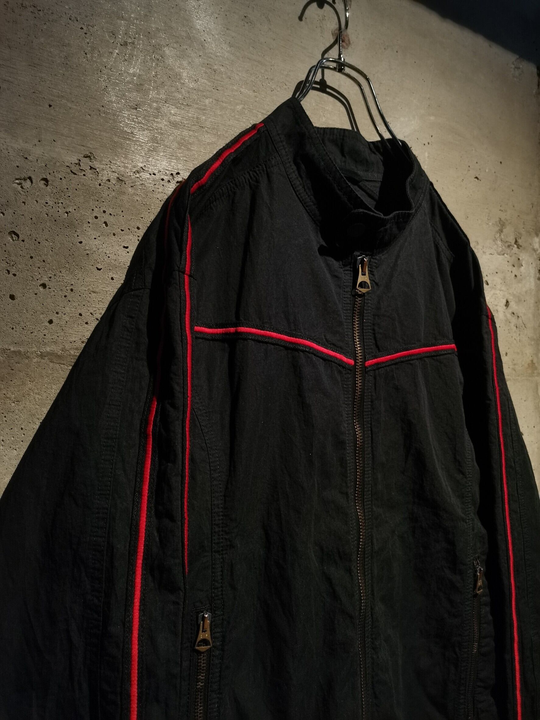 しなやかなブラックのボディをベースに、肩からスリーブにかけて、胸元、背面腕周りに赤色のラインを走らせたテープを載せた、モードな雰囲気を放つ、シングルライダースタイプのジャケット。