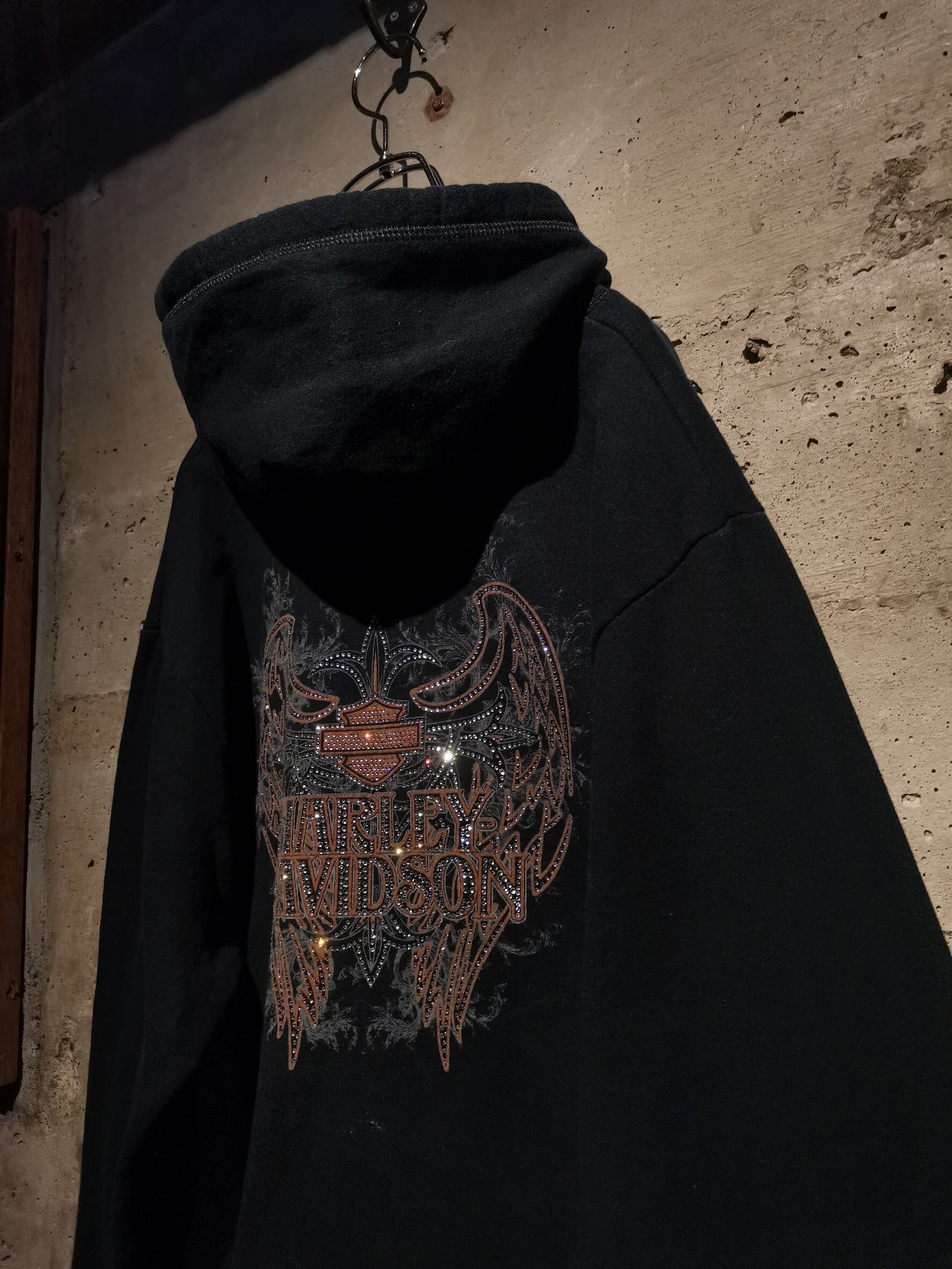 ブラックのスウェット生地のボディに、背面に翼などゴシック調のデザインをプリント。その上を模る様にラインストーンを乗せたまさに秀逸な逸品。グリッターなどの流行を背中にこのMIX感はマジでかっこいい、、