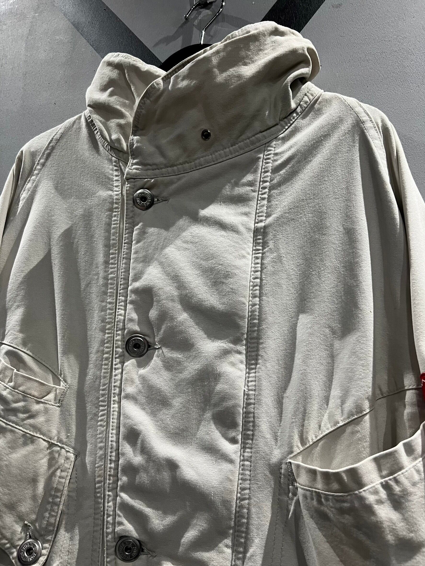 ガシッとタフなホワイトのダック地を用いたボディに、フロントにはフラップ、スラッシュ、ジップポケットをON。フロントはボタン×ジップの比翼仕立てに、袖口にはアジャスターベルト。