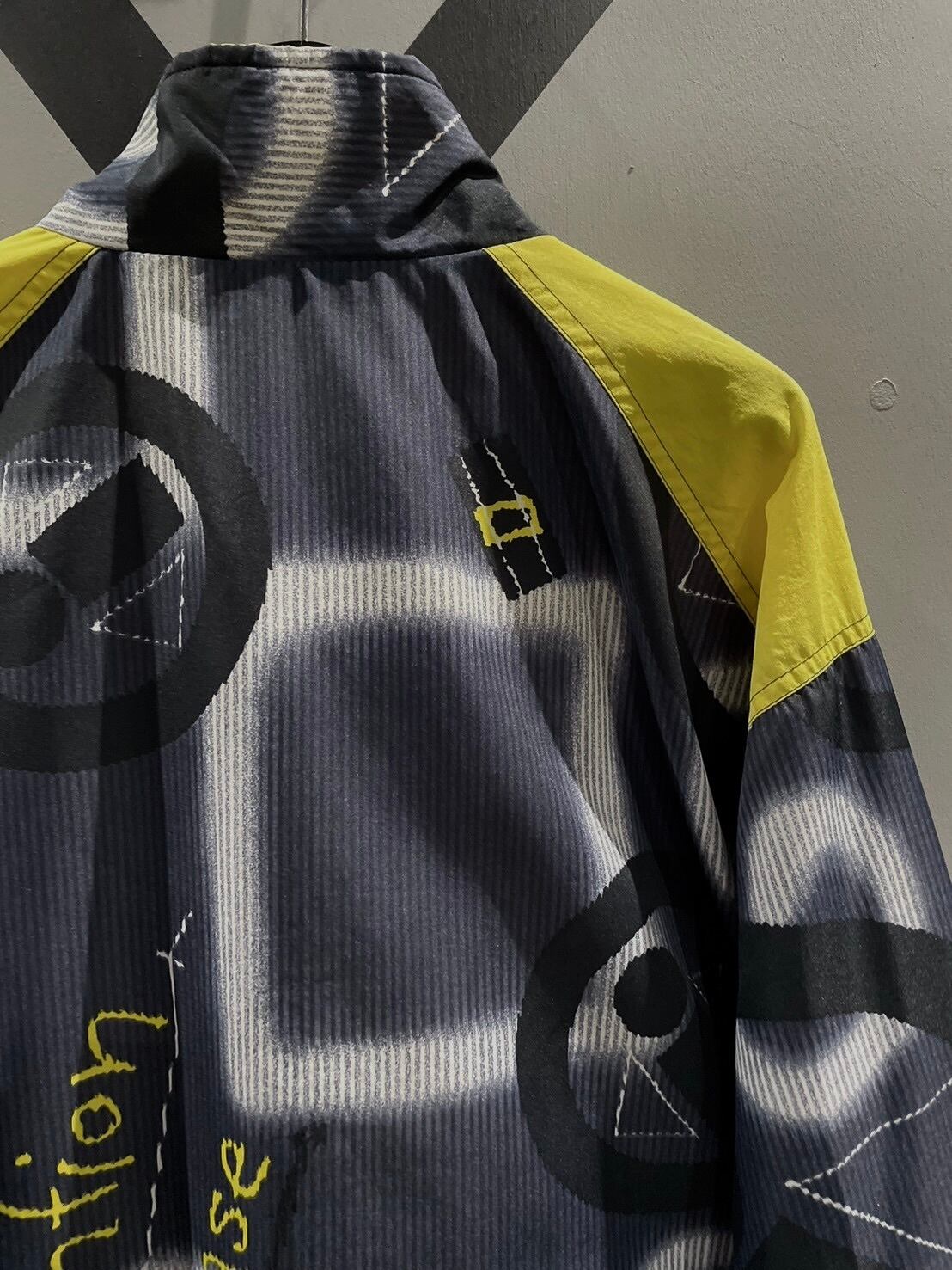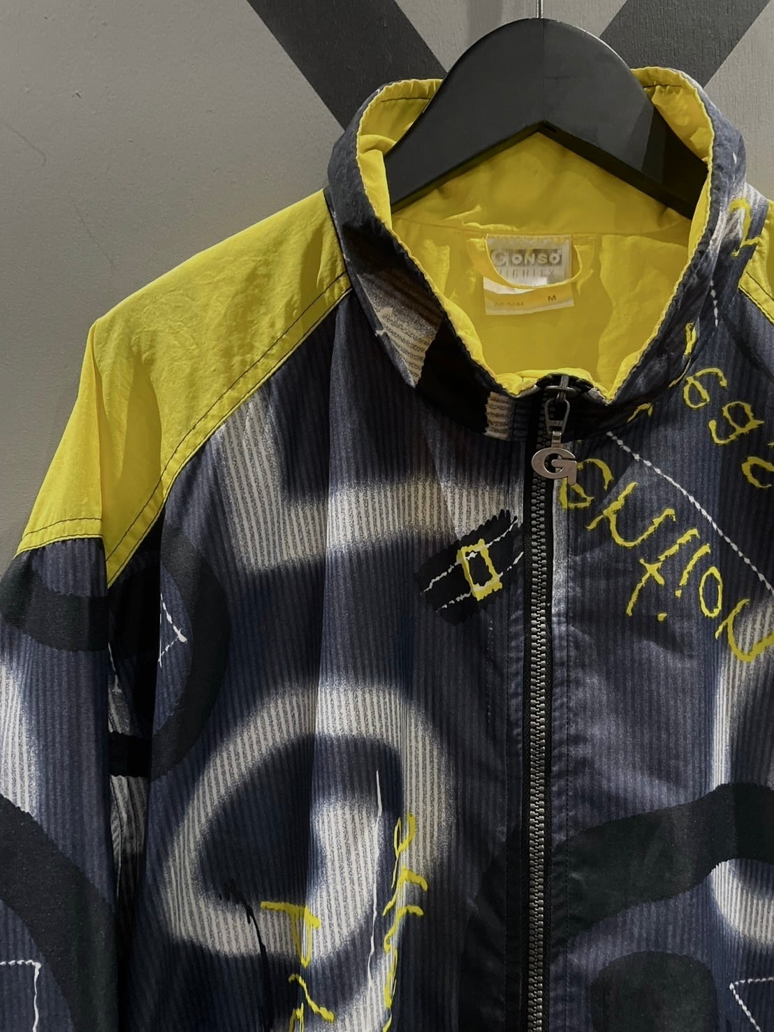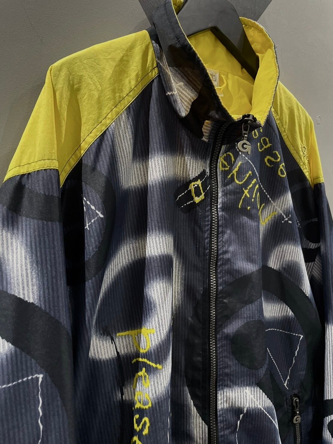 グレー×白×黒のモノトーンをベースに、イエローを差し込んだ美しいカラーリングで文字や抽象的な柄を全面に配したナイロンジャケット。