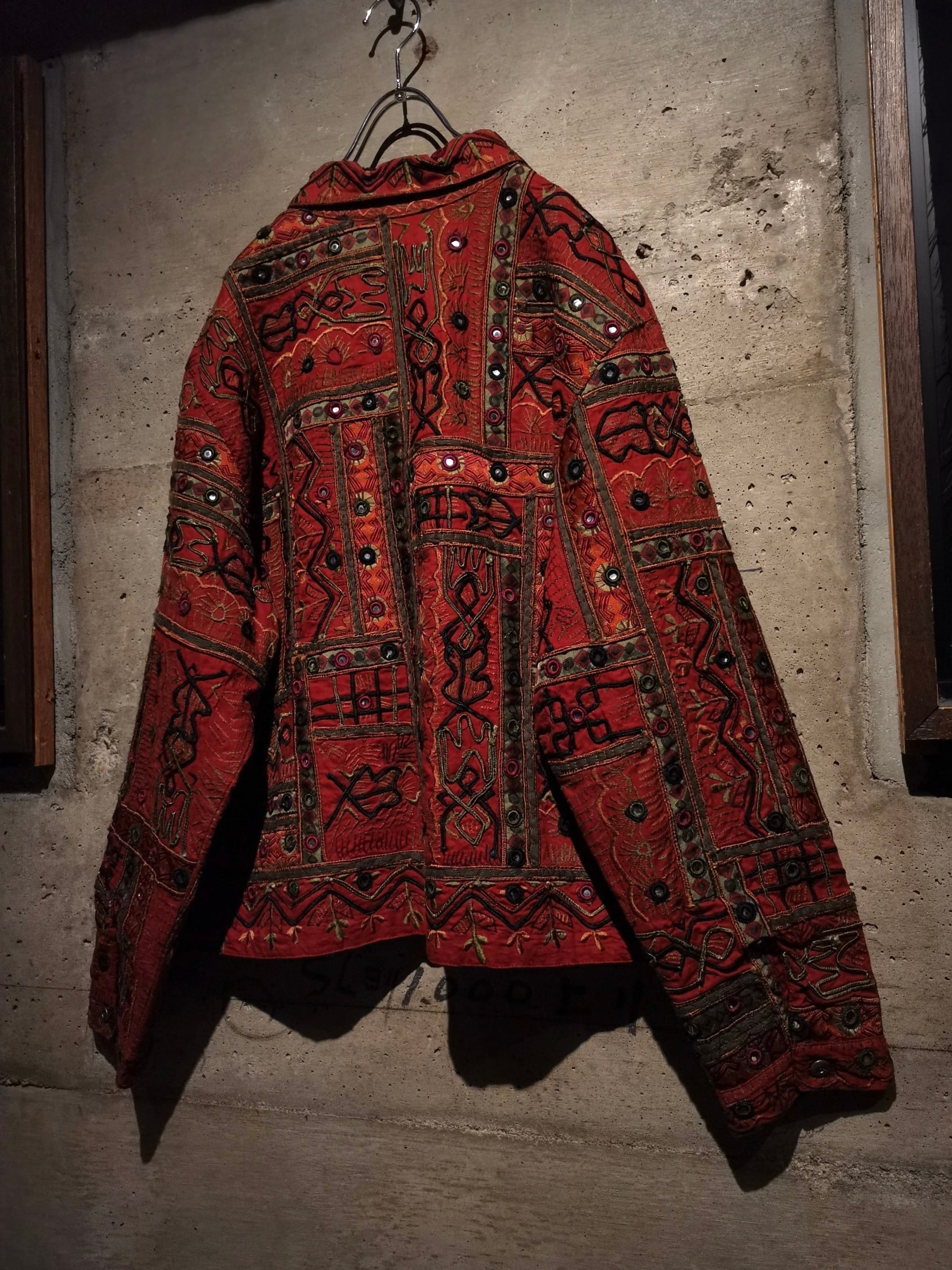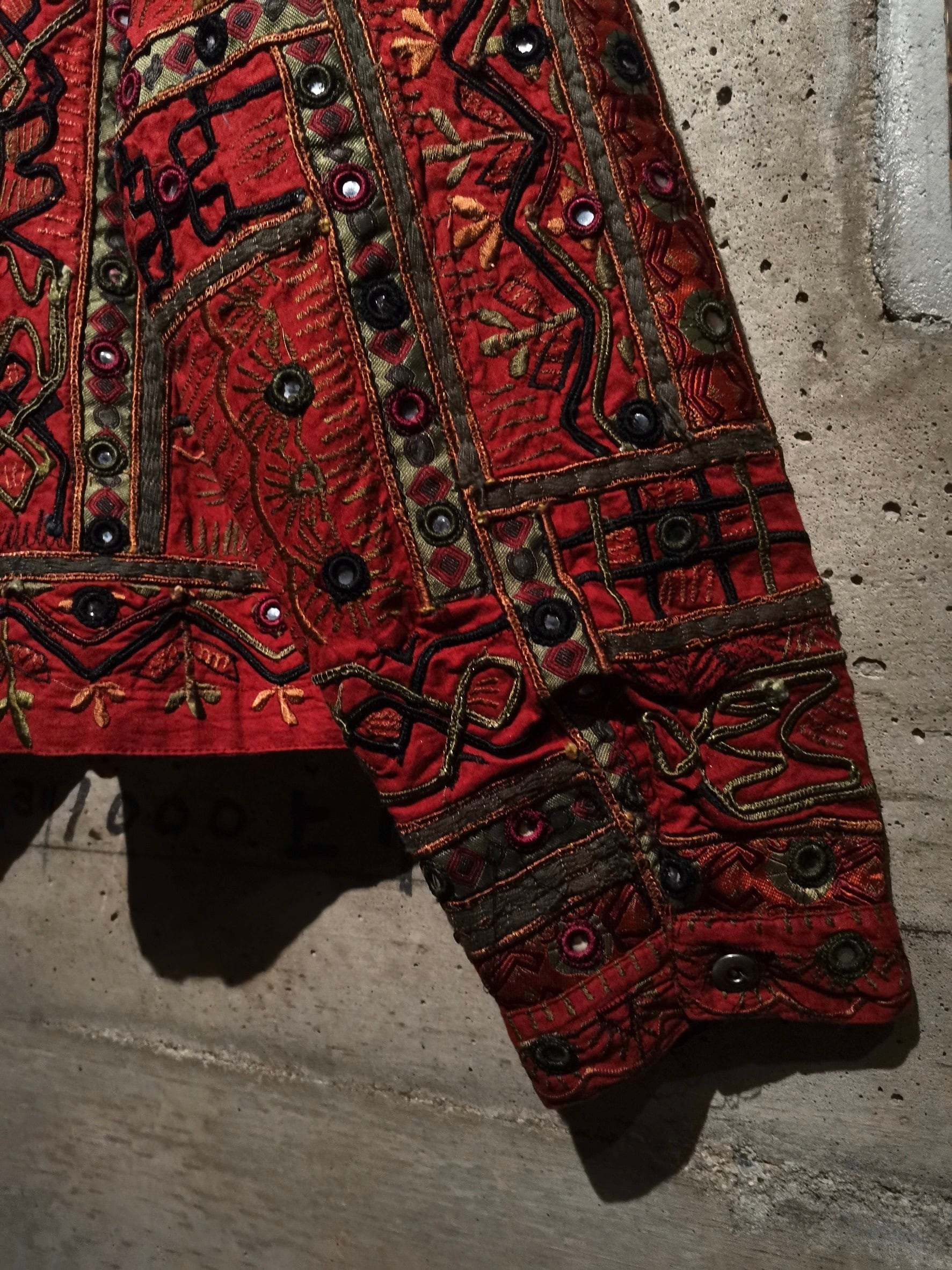 緋色のボディに、民族的なフレーバーを漂わせる柄模様を刺繍によって刻んだ、このブランドならではの高いデザイン性を誇る1着。