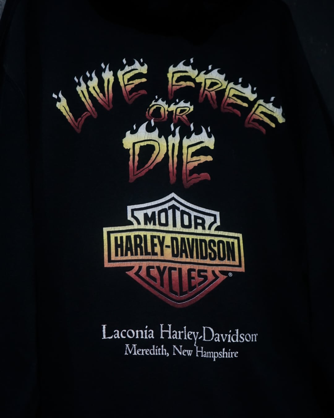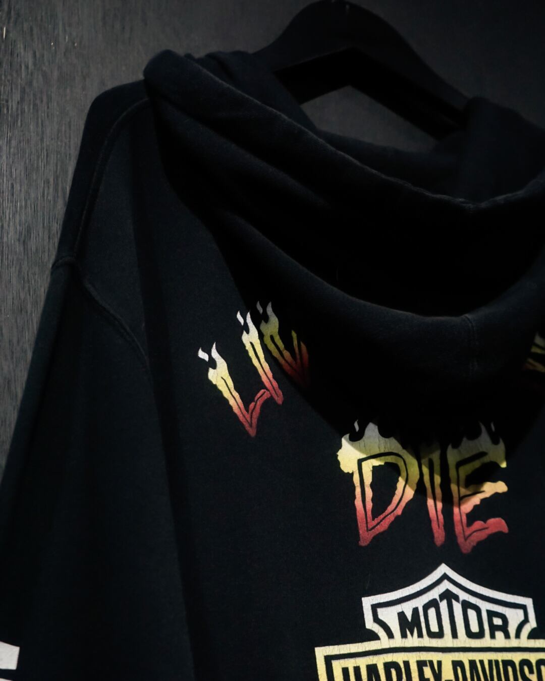 ブラックのボディをベースに、左胸にはブランドロゴ、右腕にはブランドネーム、そして背面には"LIVE FREE OR DIE"のメッセージを載せたジップアップフーディ。