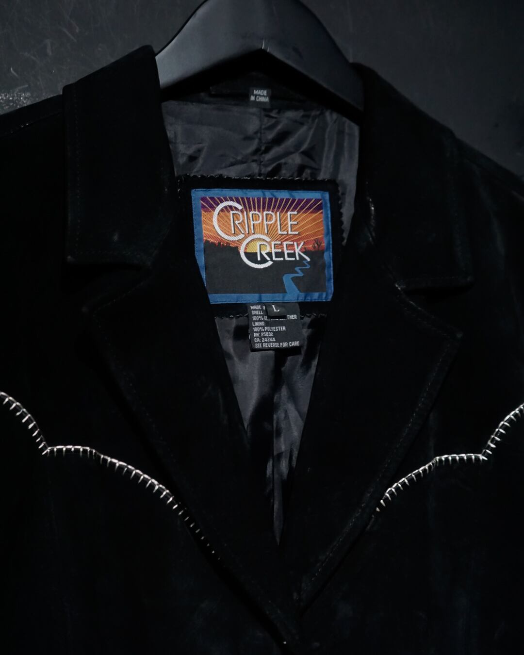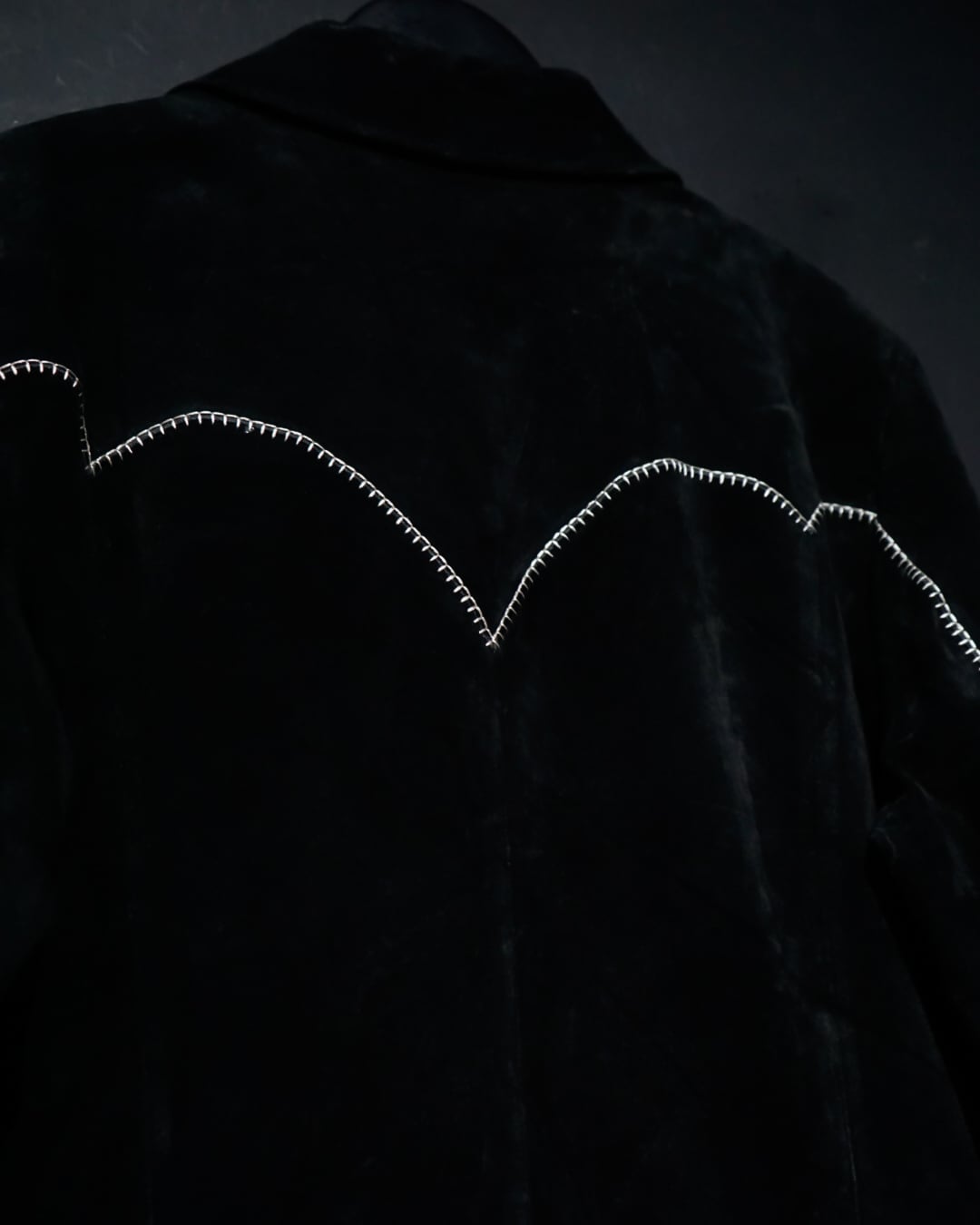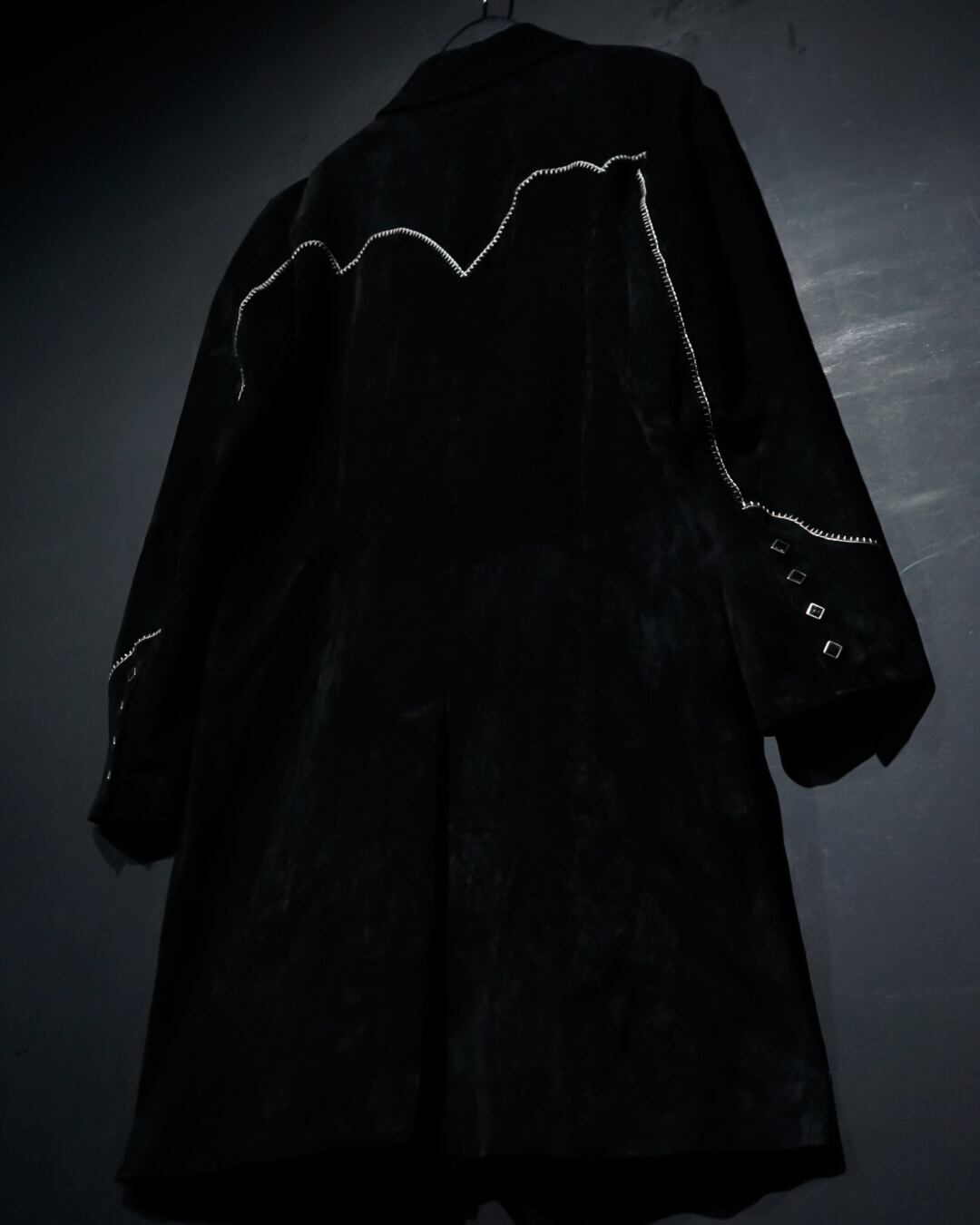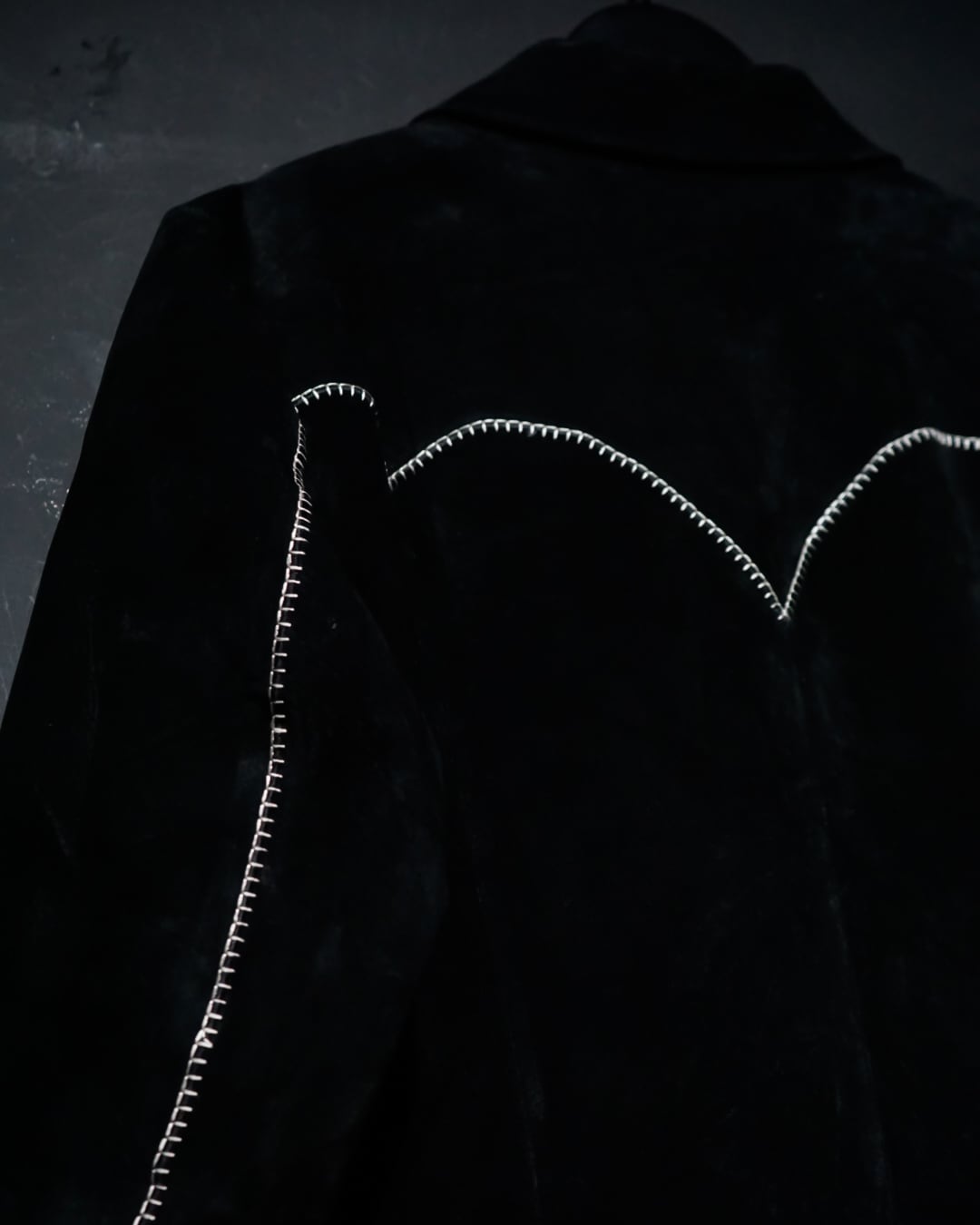 ウエスタンヨーク、カフスにはホワイトのステッチ、そして菱形のスナップボタン。クラシカルなチェスターコート型にスエードレザーを掛け合わせ、ウエスタンに仕上げたことでモードなアイテムへと昇華された1着です。