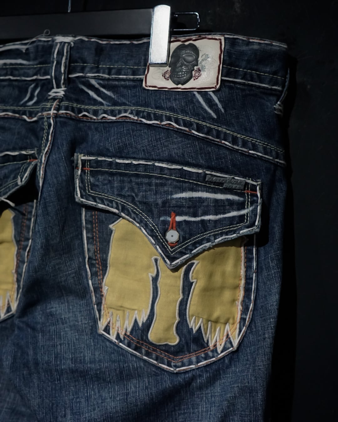 背面のポケットにはレザーパッチに立体感なスカルの装飾。裾には前所有者が引き摺った形跡がありますが、これもまたUSEDならではの味。ボディの雰囲気を底上げしてくれています。