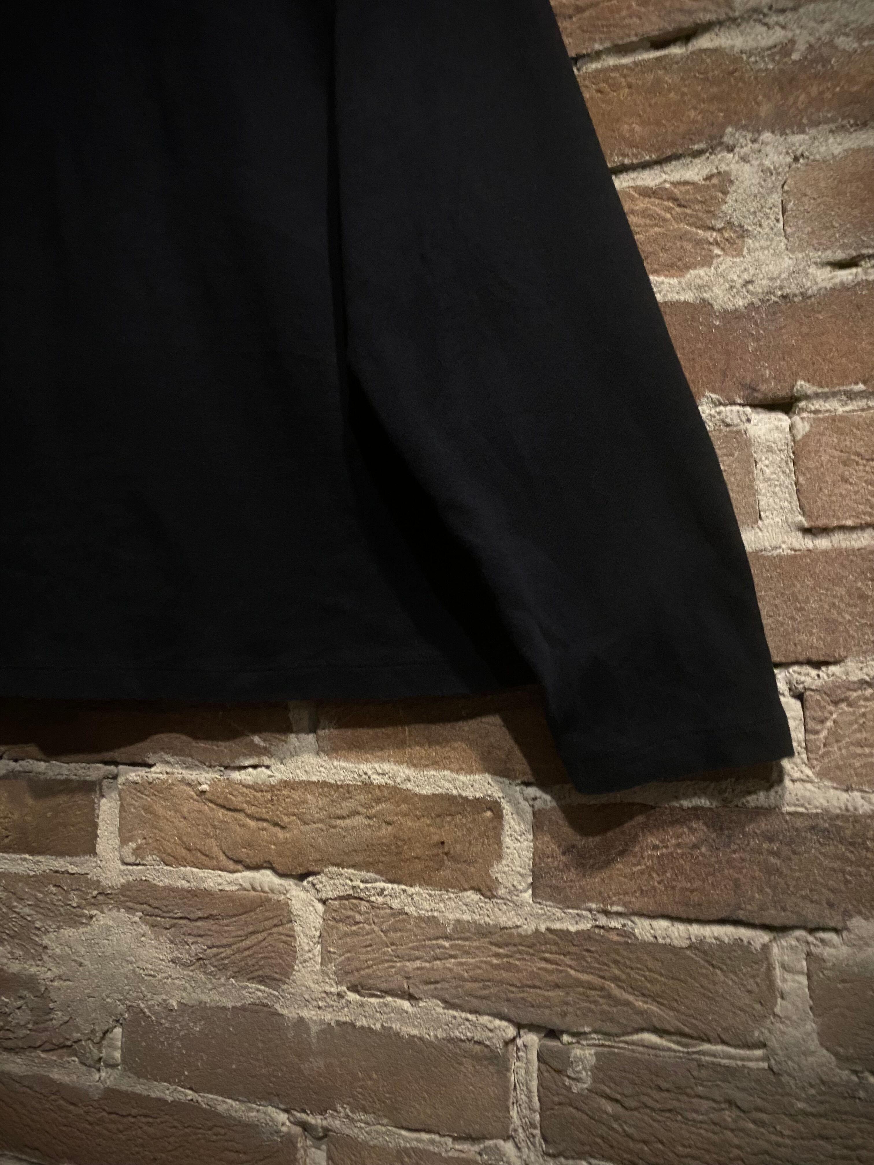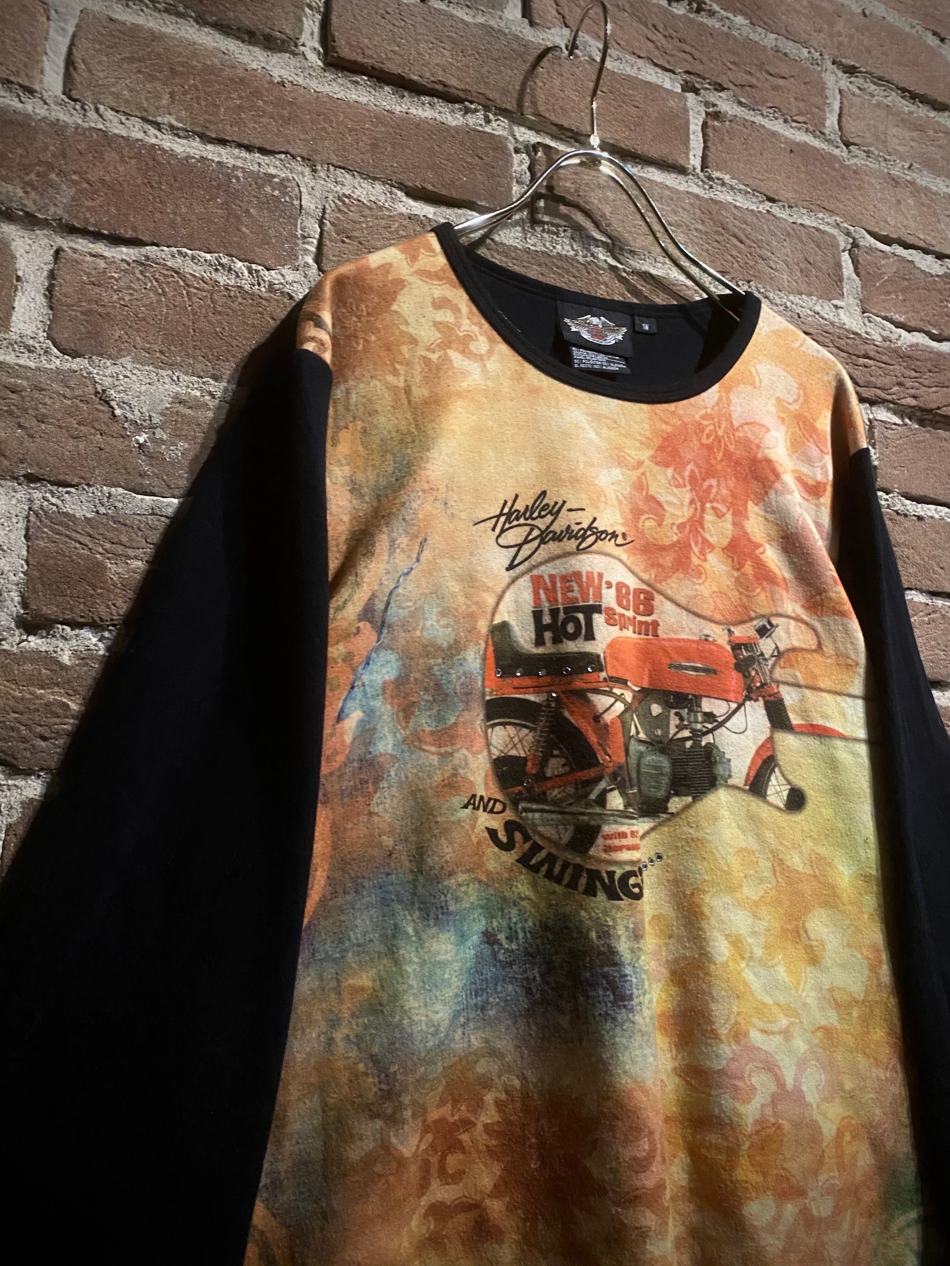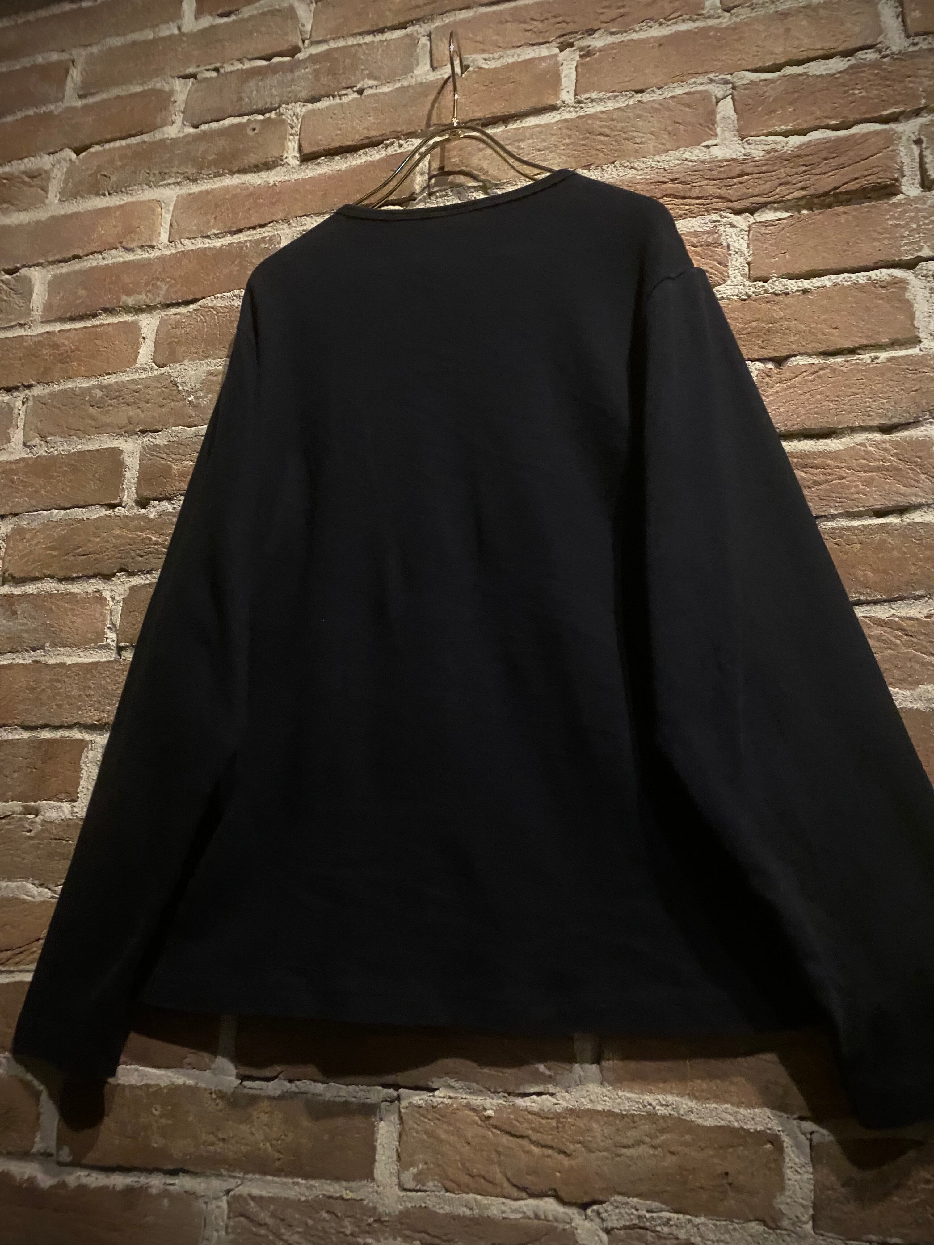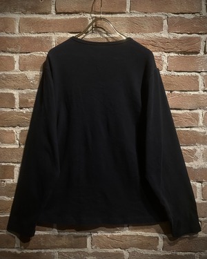 ブラックのボディをベースに、フロントに染めのような美しいグラデーションでボタニカルなデザインを載せ、ギター、バイクを載せた、ブランド内でも珍しいデザインを載せたロンT。