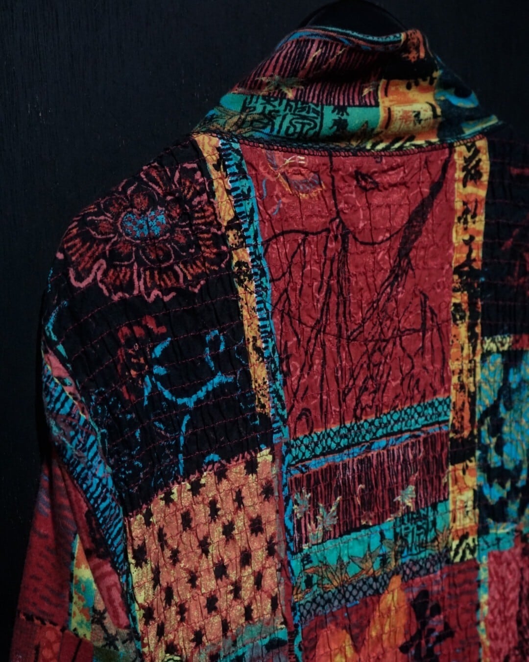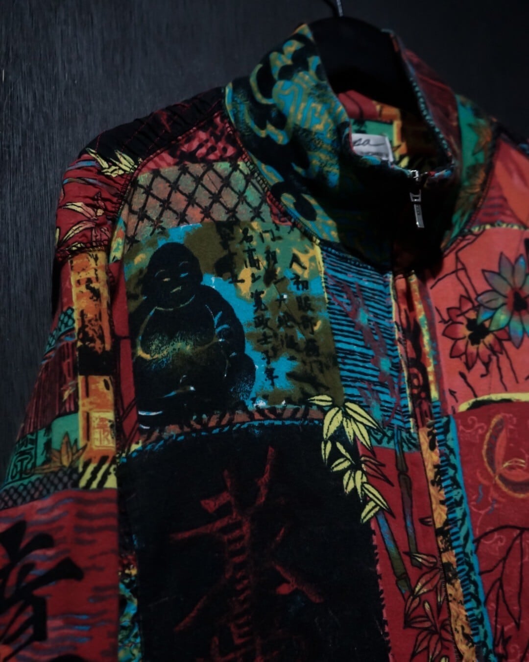 柔らかく手触り滑らかな素材と、シュリンク加工を施した立体感のある生地を切り替え。そこに花や女性、漢字等々、オリエンタルな雰囲気を漂わせるデザインを載せたジップアップジャケット。