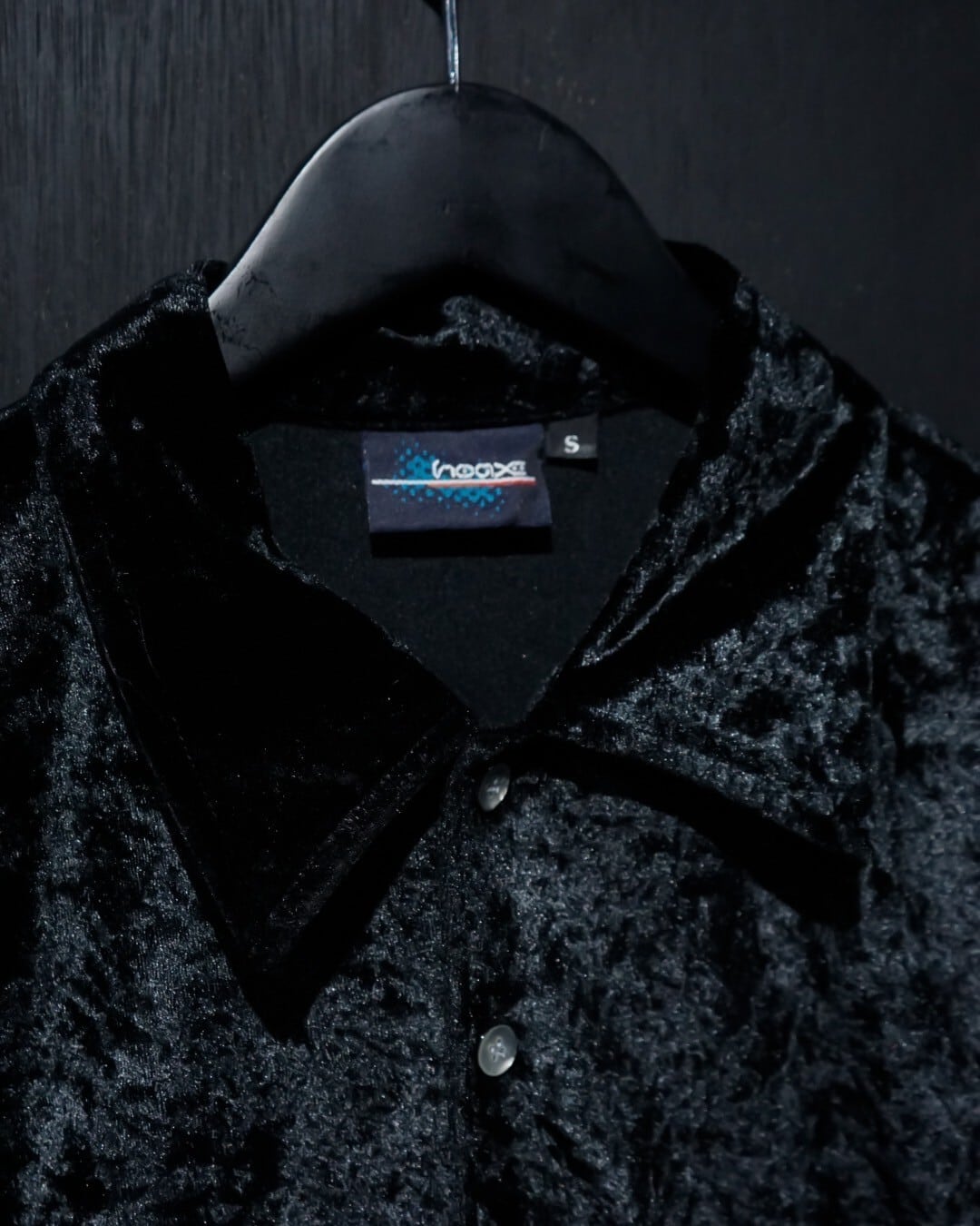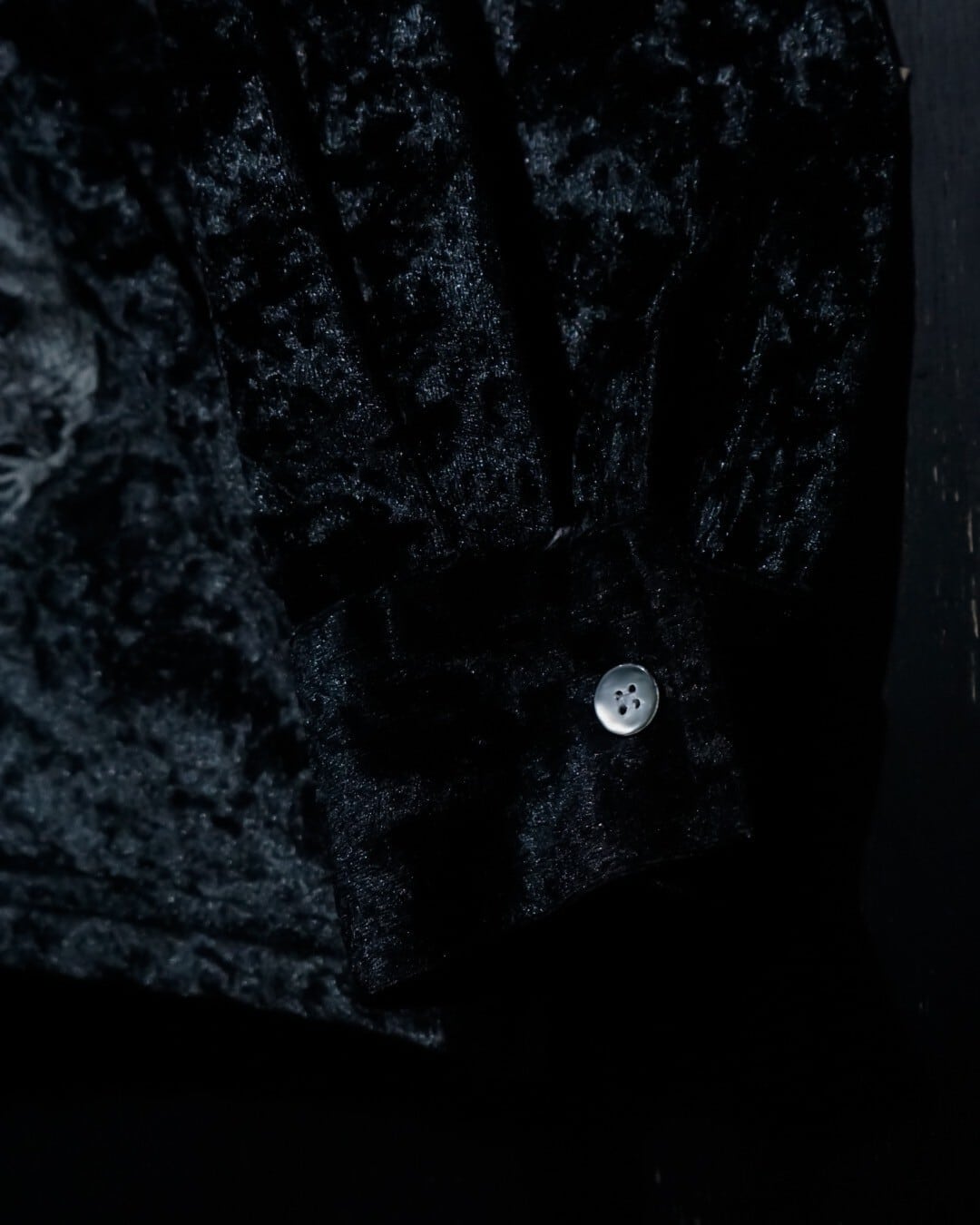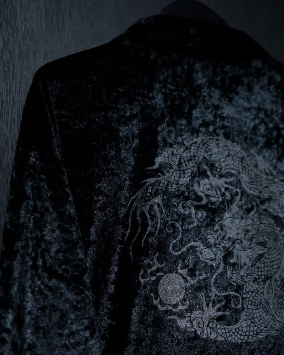 鈍い光沢を放つブラックベロアに、緻密なタッチで龍のデザインを載せた長袖ベロアシャツ。